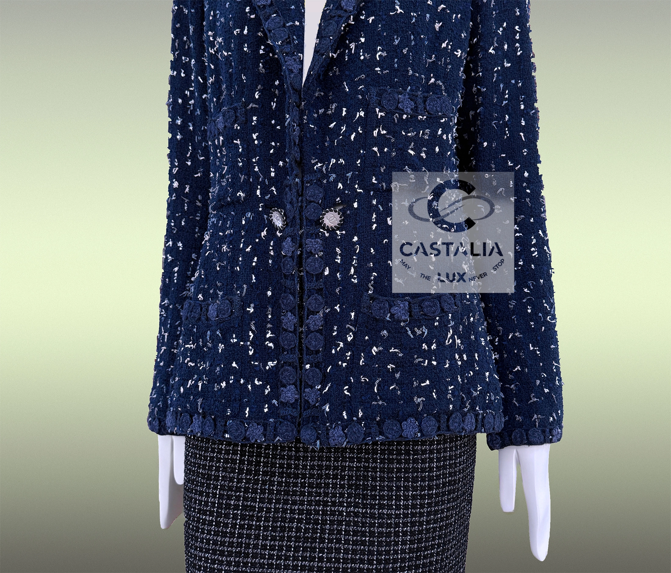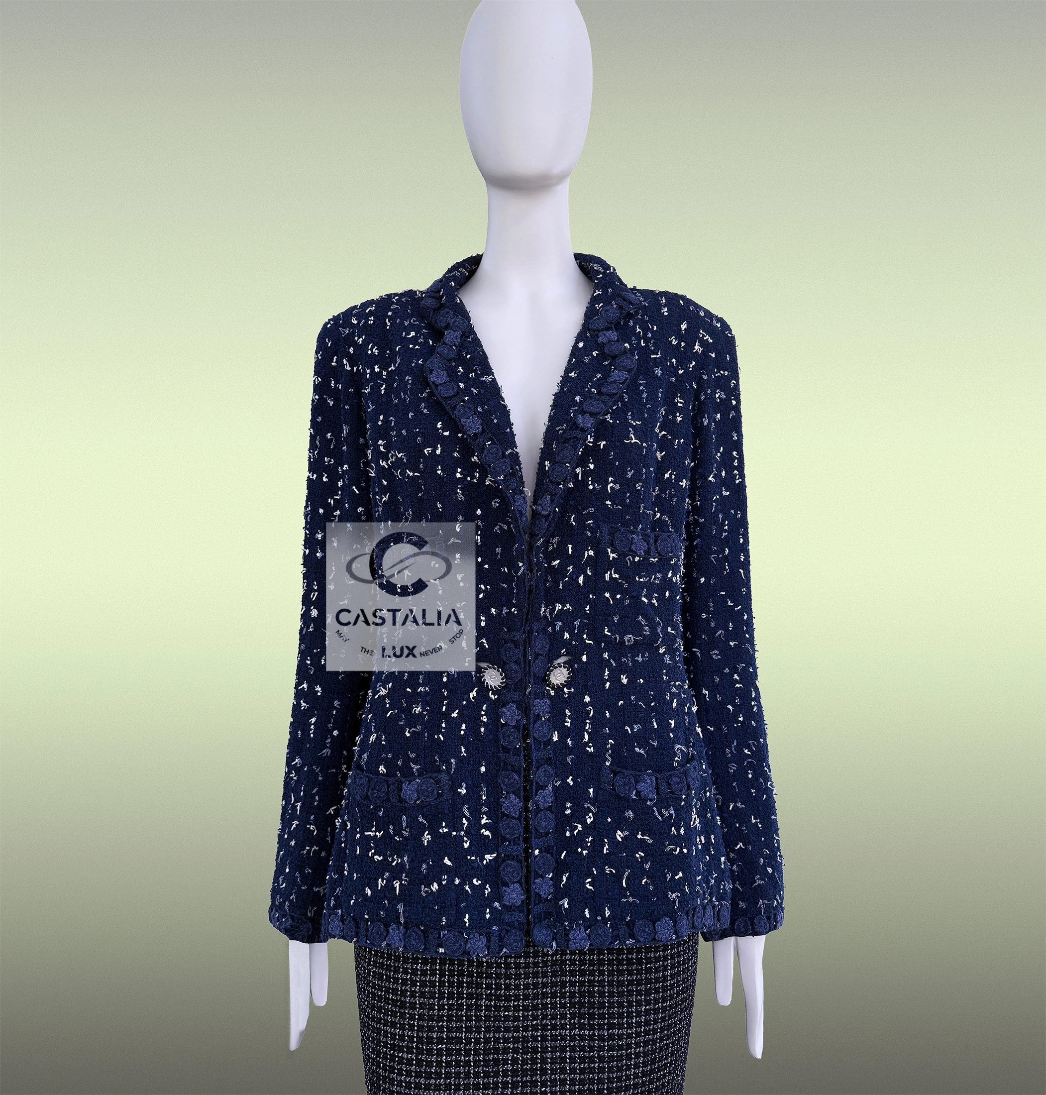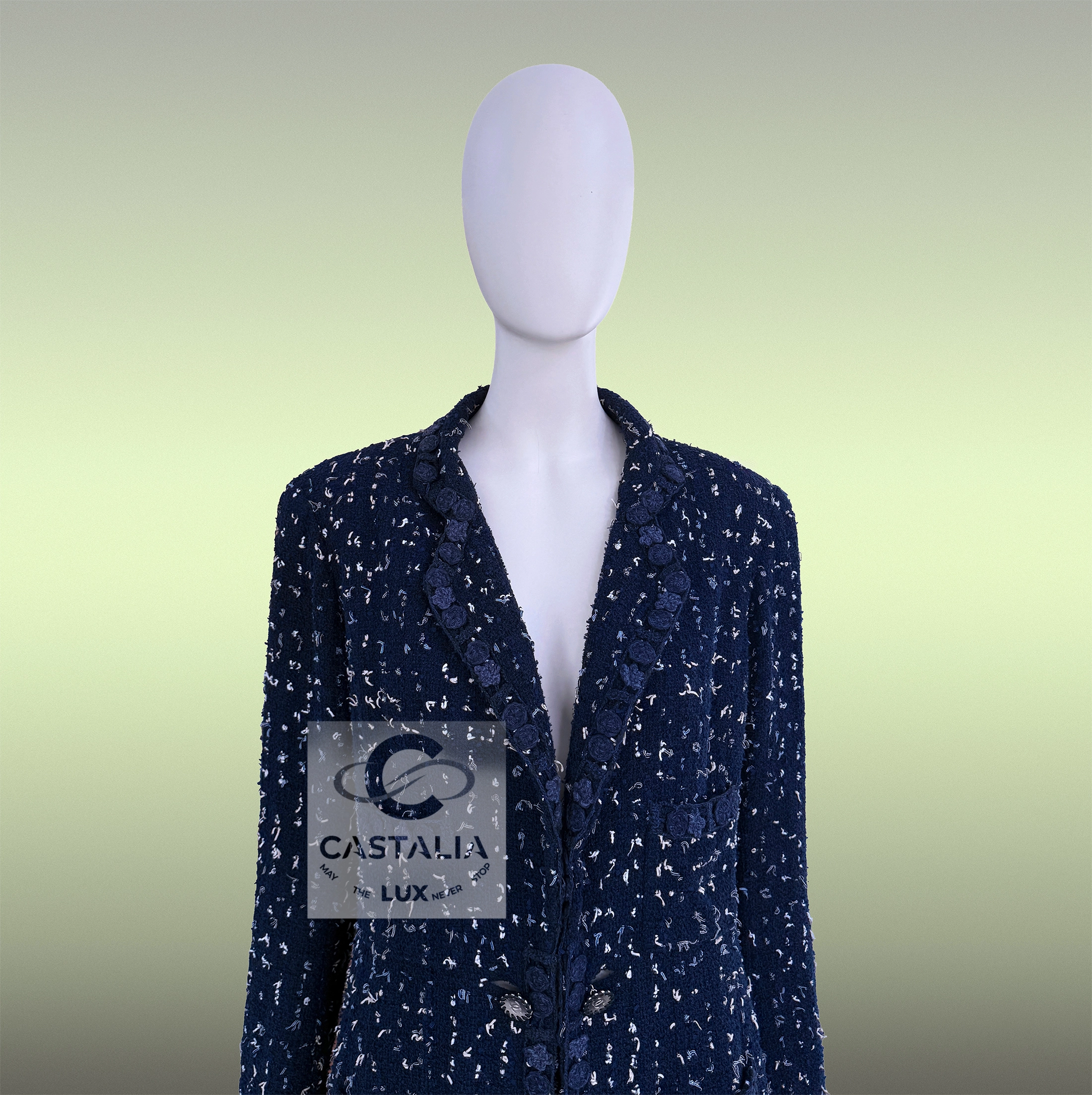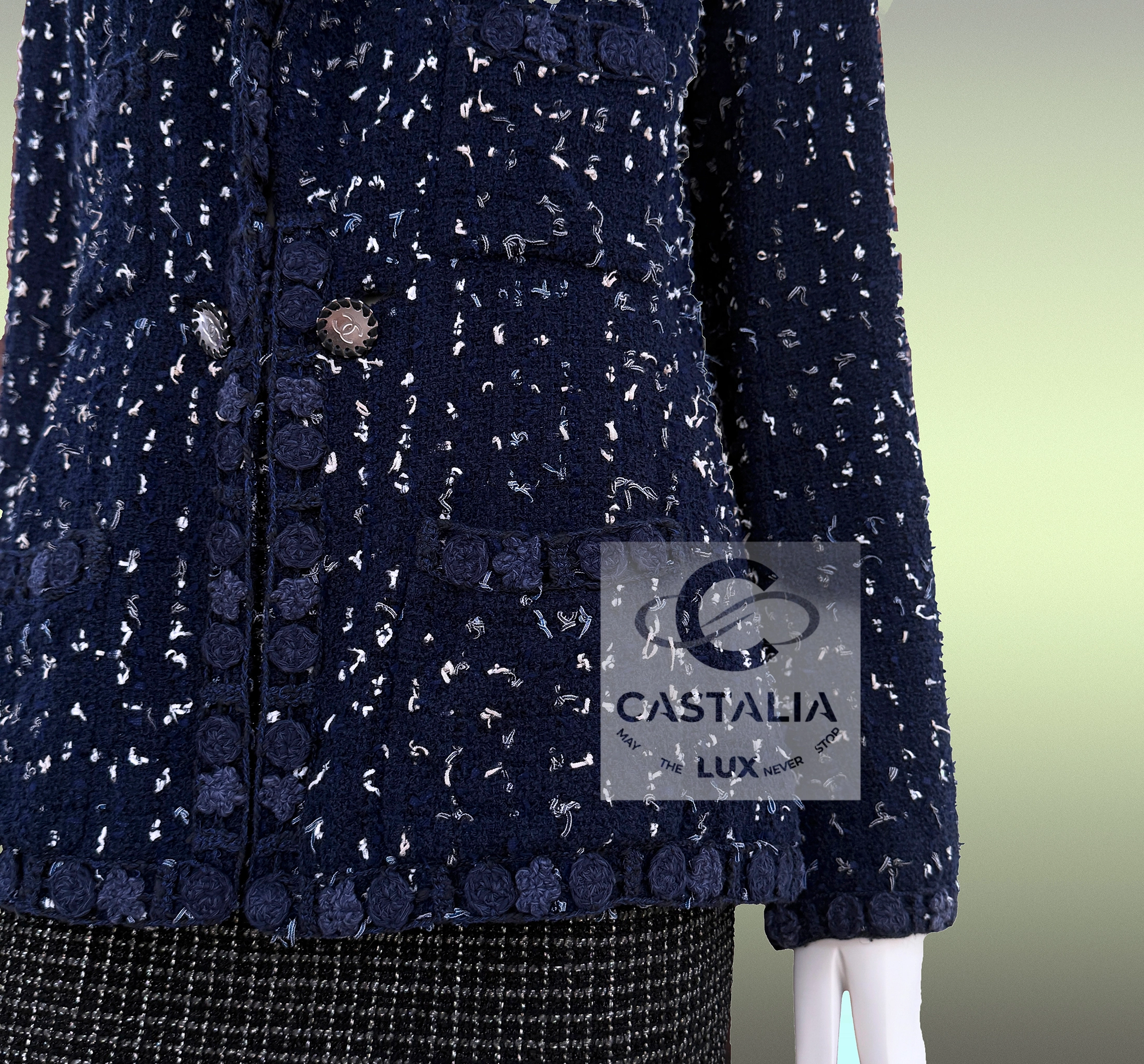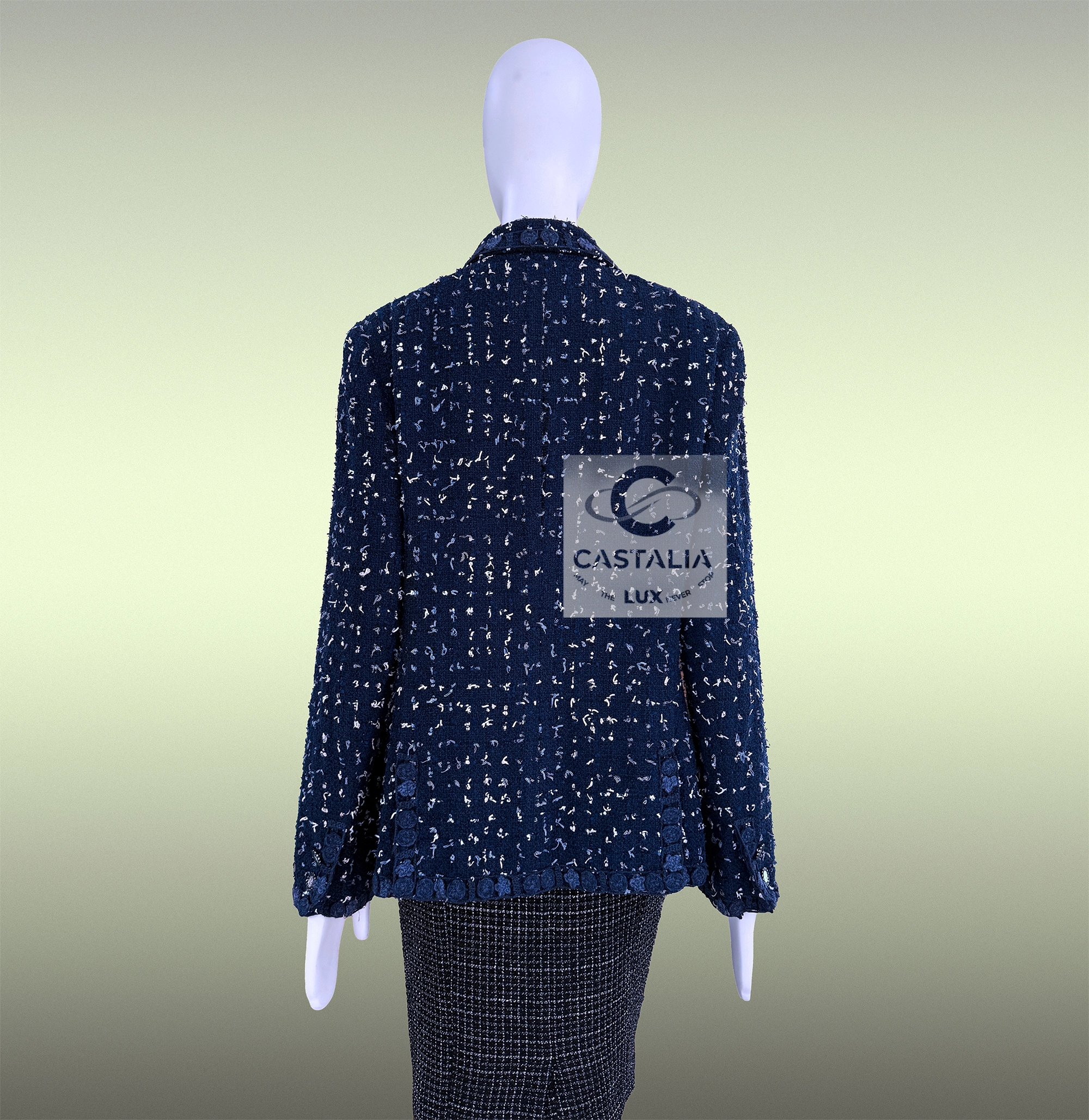 Chanel Navy Tweed Jacket — Paris / SAINT-TROPEZ Cruise Collection by Karl Lagerfeld An artifact of sartorial poetry, this Chanel navy tweed jacket evokes the quiet grandeur of the Côte d’Azur, distilled into form and texture // Size mark 44 FR / Condition: never worn // — hand-embroidered trim—a triumph of Maison Lesage’s unrivaled craftsmanship—each stitch a testament to the lineage of Parisian haute couture. — CC logo buttons, edged in supple leather trim, serve as both closure and insignia, whispering the code of the maison — stunning navy Lesage tweed, woven with delicate eyelashes that catch the light like ripples on twilight water