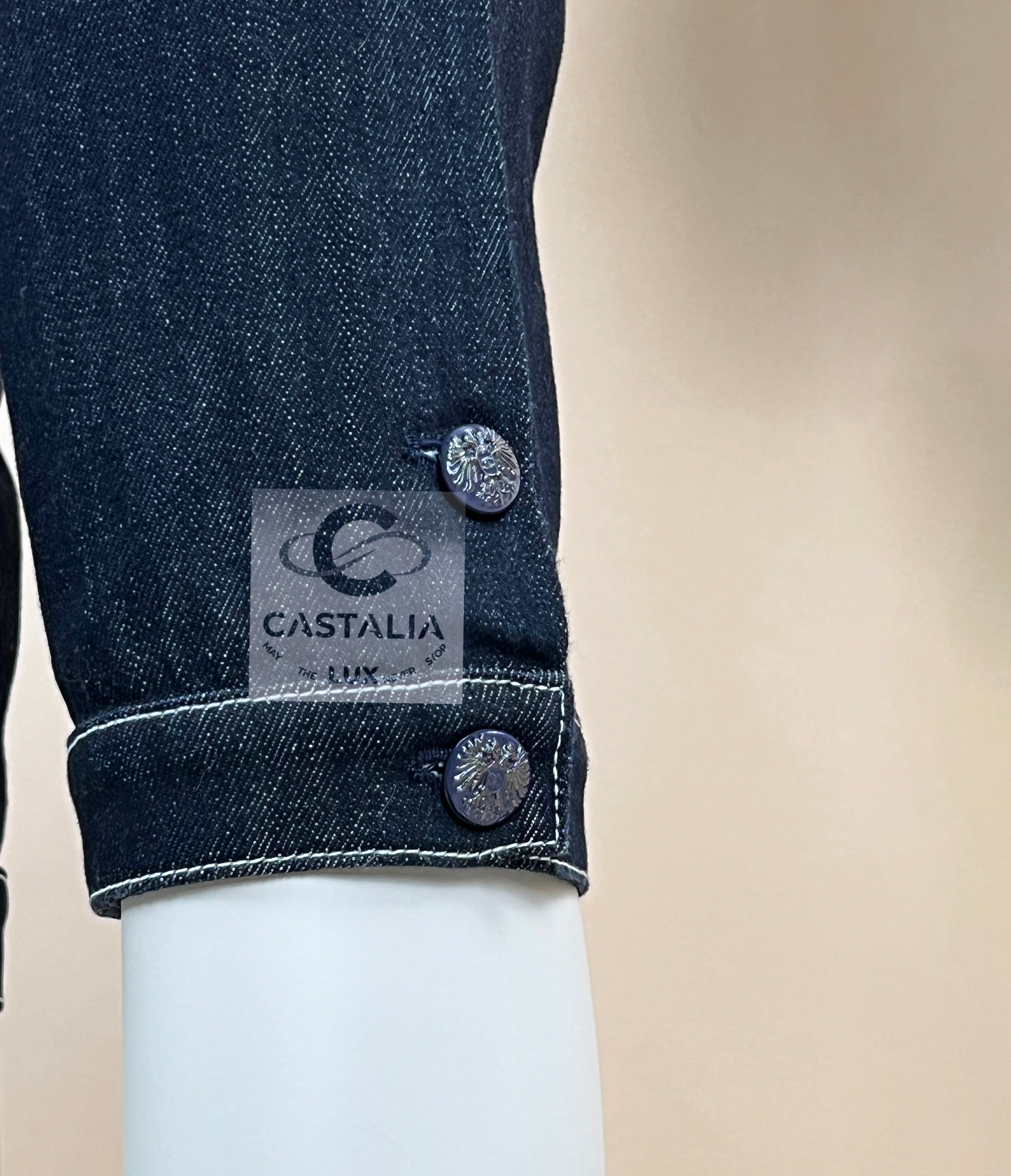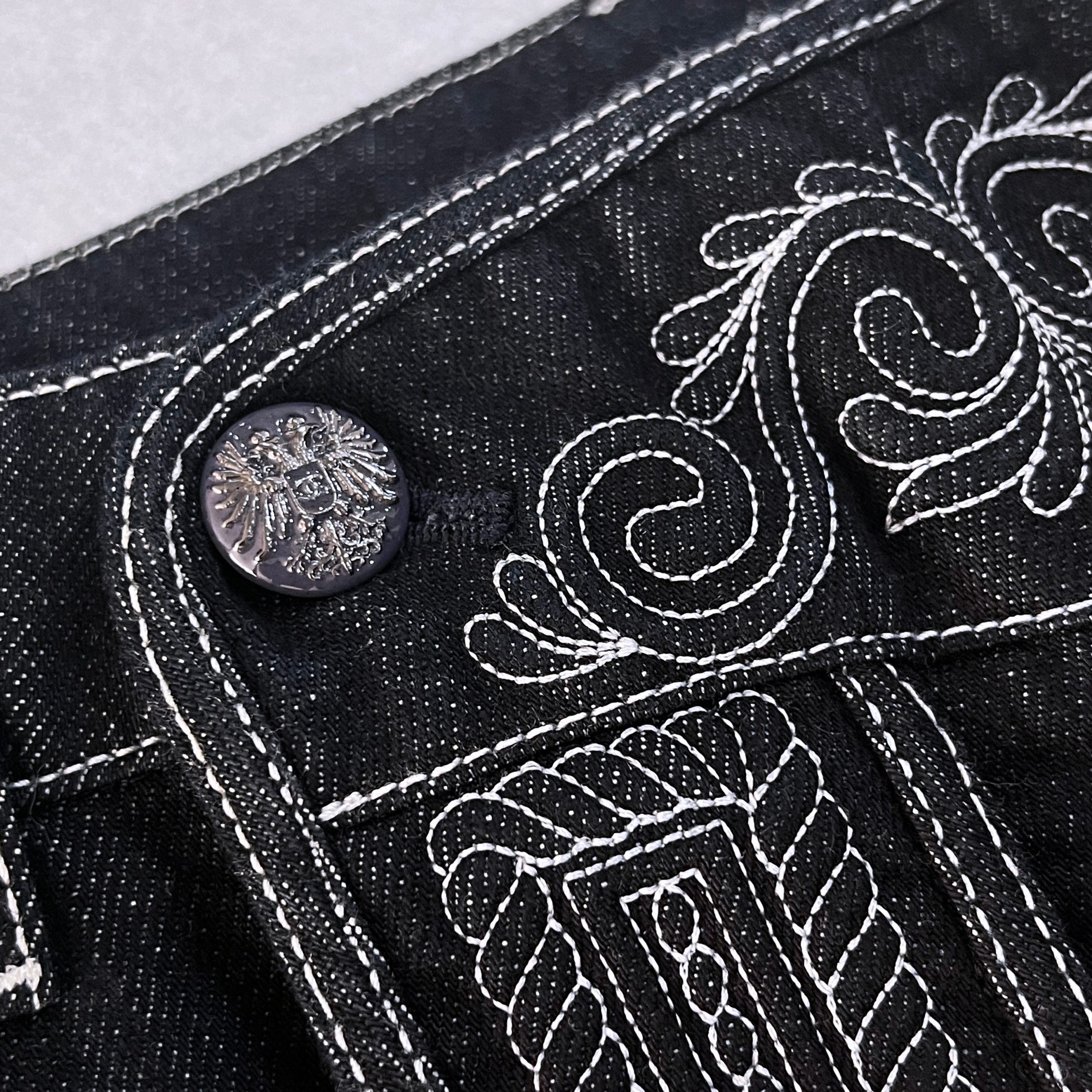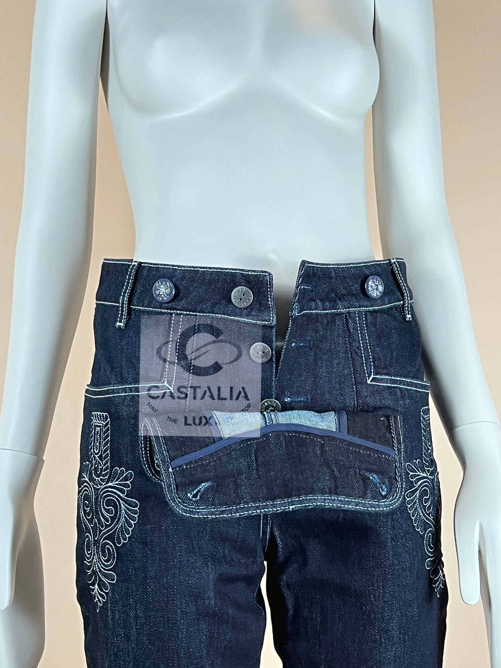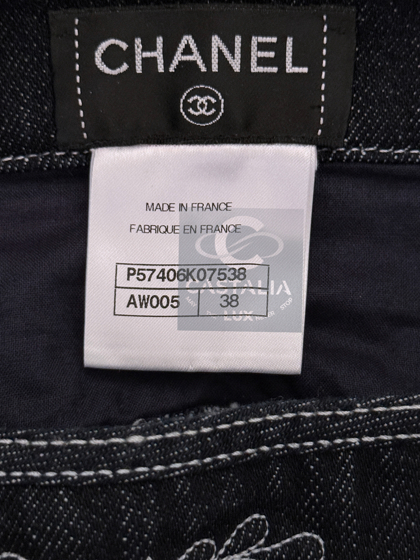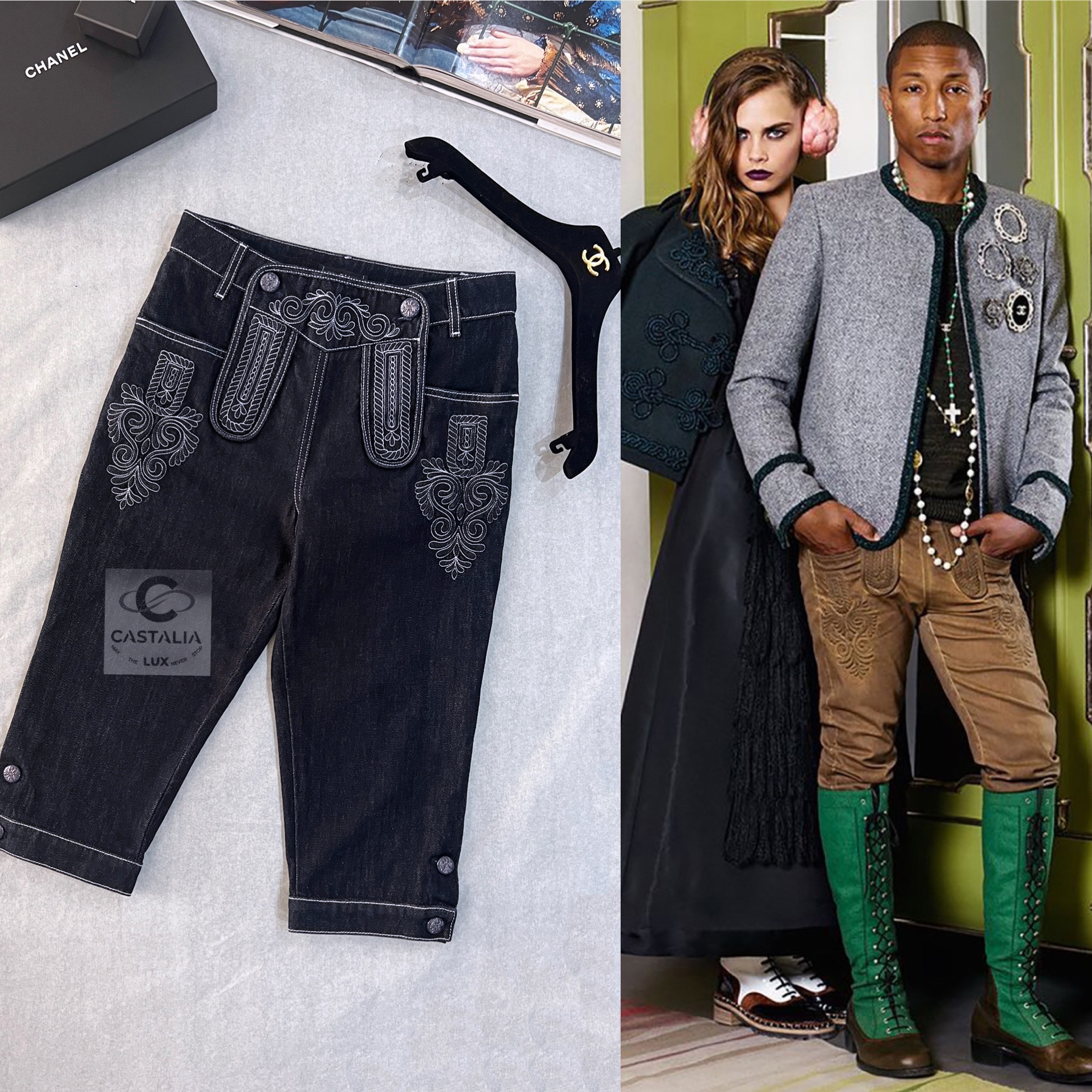 Iconic Chanel Denim Trousers with Eagle Buttons — Ad Campaign of Paris / SALZBURG 2015 Métiers d’Art Collection by Karl Lagerfeld — As seen on Cara Delevingne ~ A statement piece that fuses alpine charm with modern Chanel allure—ideal for collectors, connoisseurs, and those who dress with narrative Designed by Karl Lagerfeld, they evoke the spirit of Alpine nobility with architectural embroidery inspired by Austrian folklore // Size mark 38 FR / Condition: never worn // — Cut in structured, vintage-washed denim, the silhouette references traditional lederhosen, while ornate tonal stitching and front tab detailing pay homage to artisanal heritage — The finishing touch: signature Chanel logo buttons engraved with CC Eagle—symbols of strength, elegance, and house pride