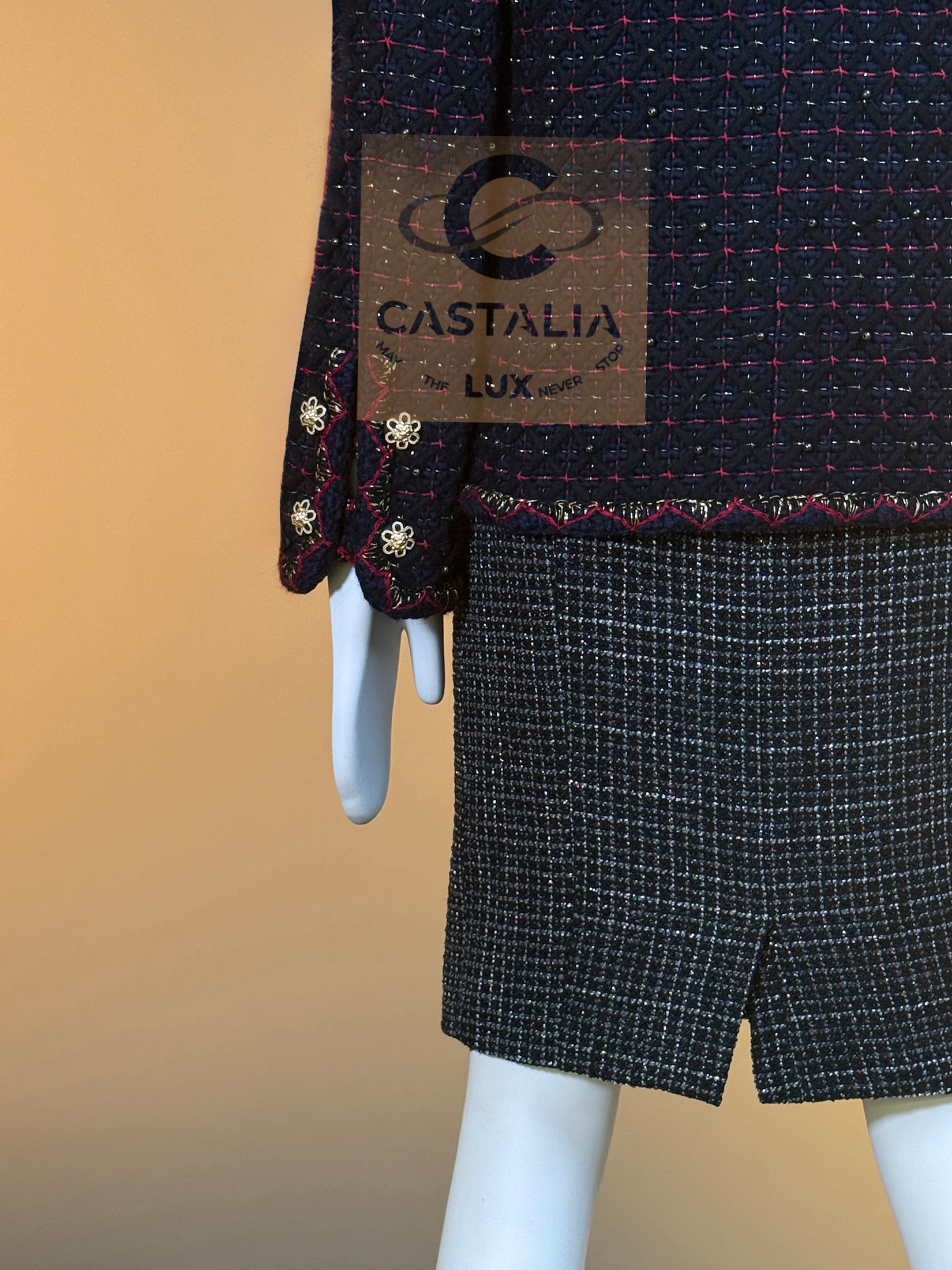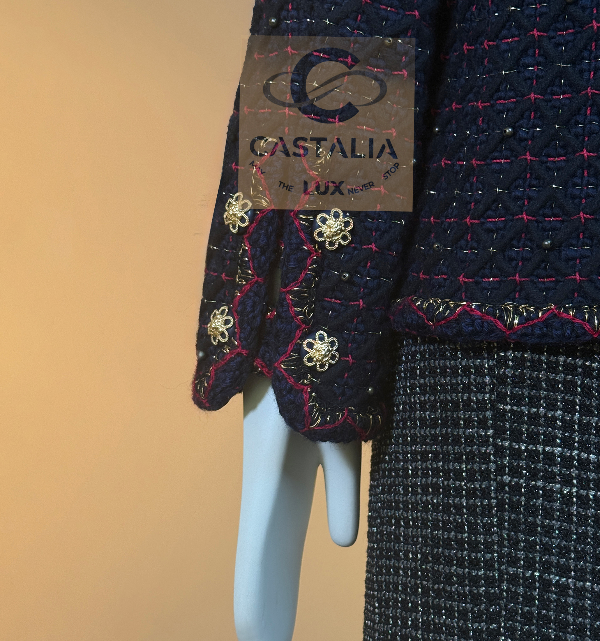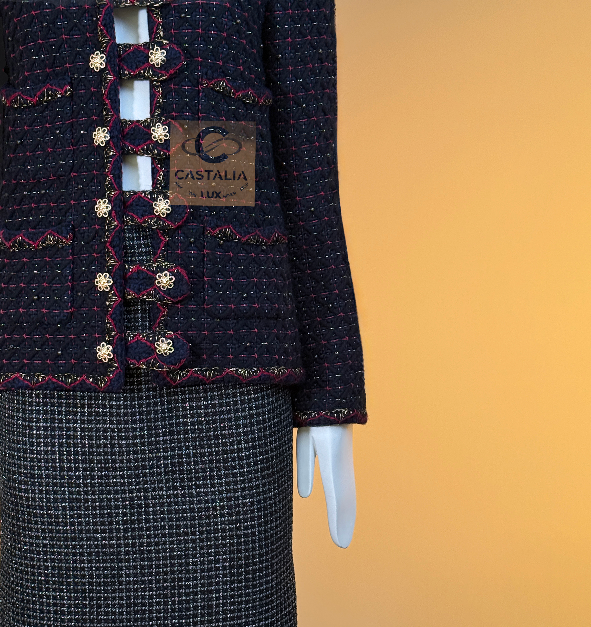 • crafted in deep navy Lesage tweed that holds a dense, noble darkness
