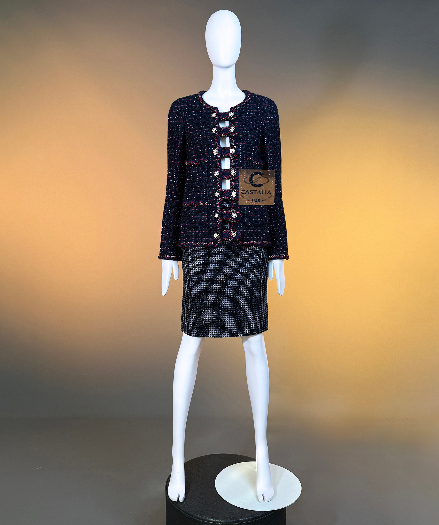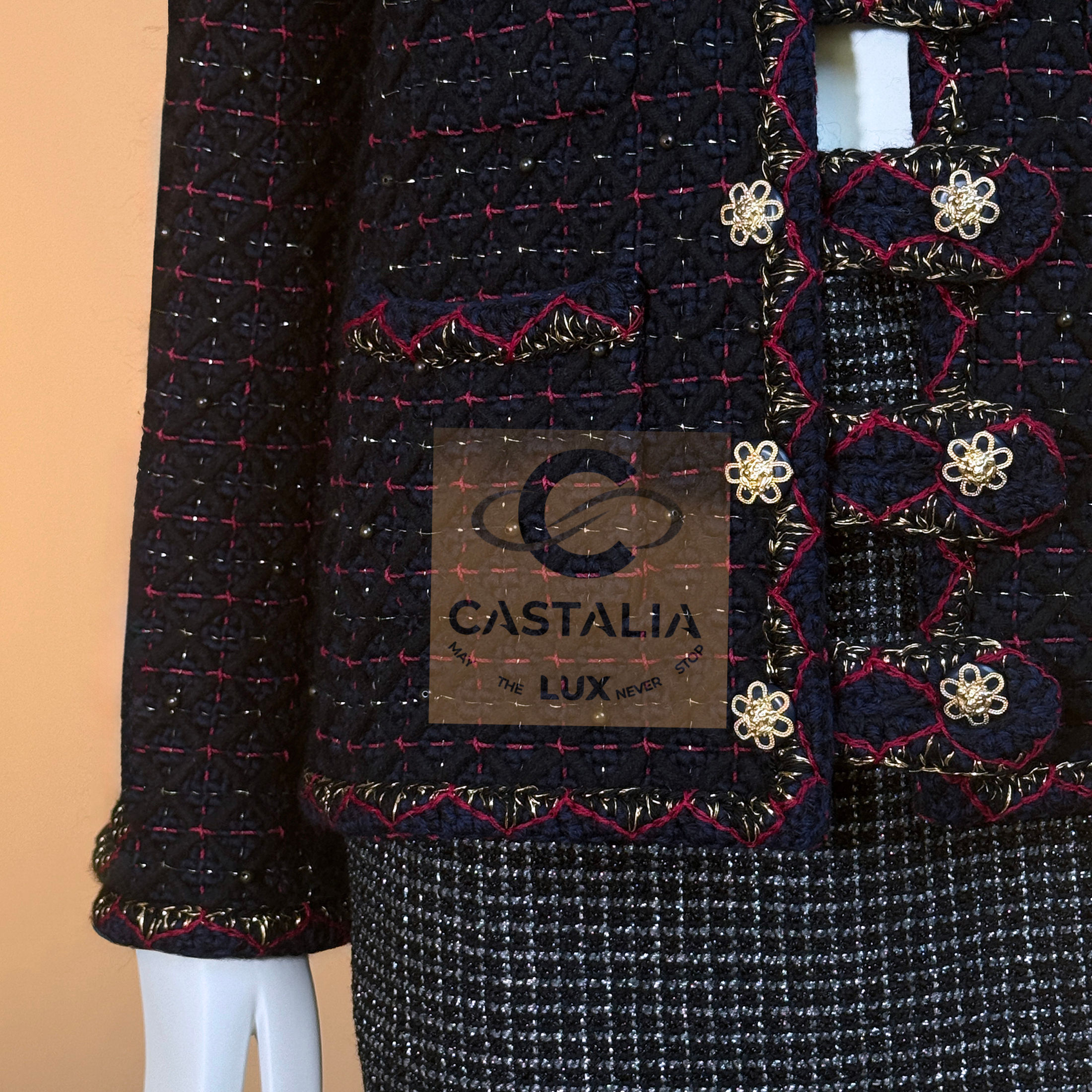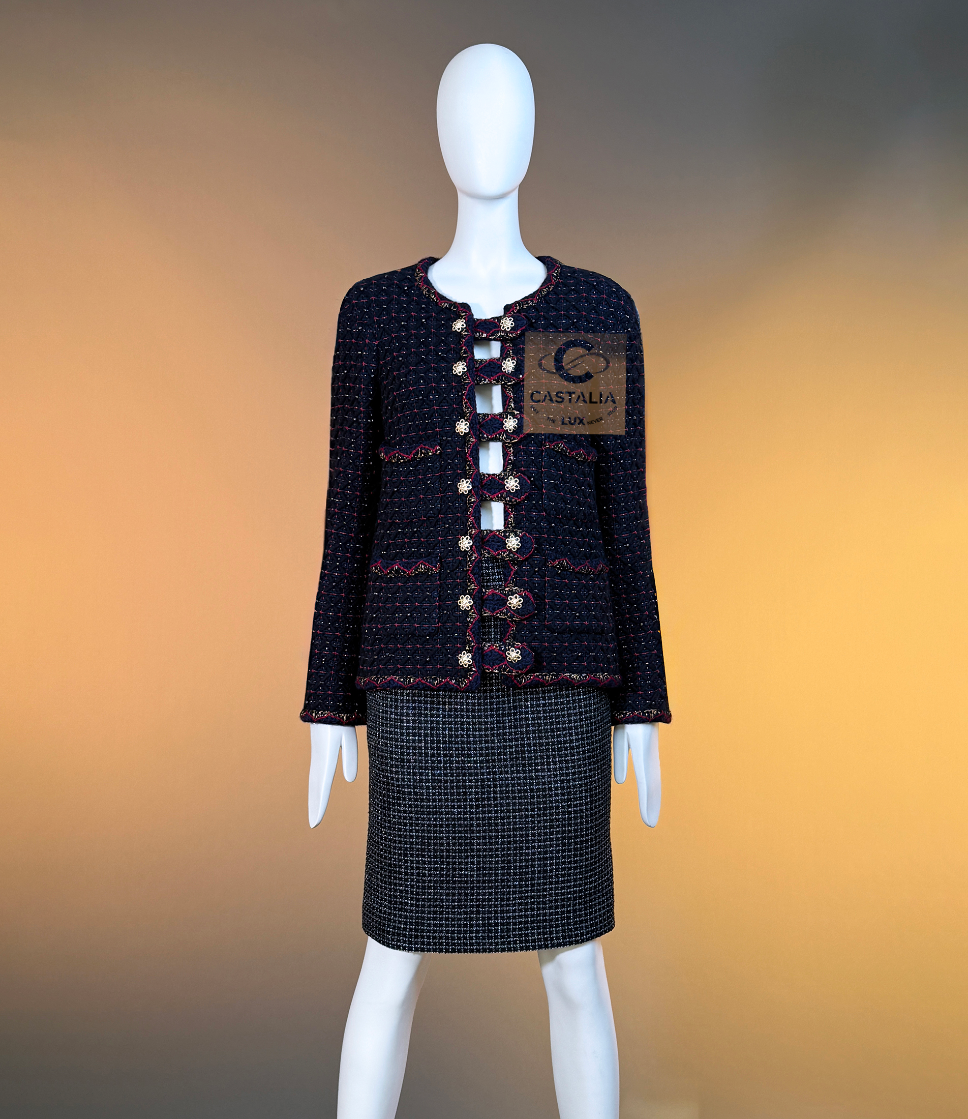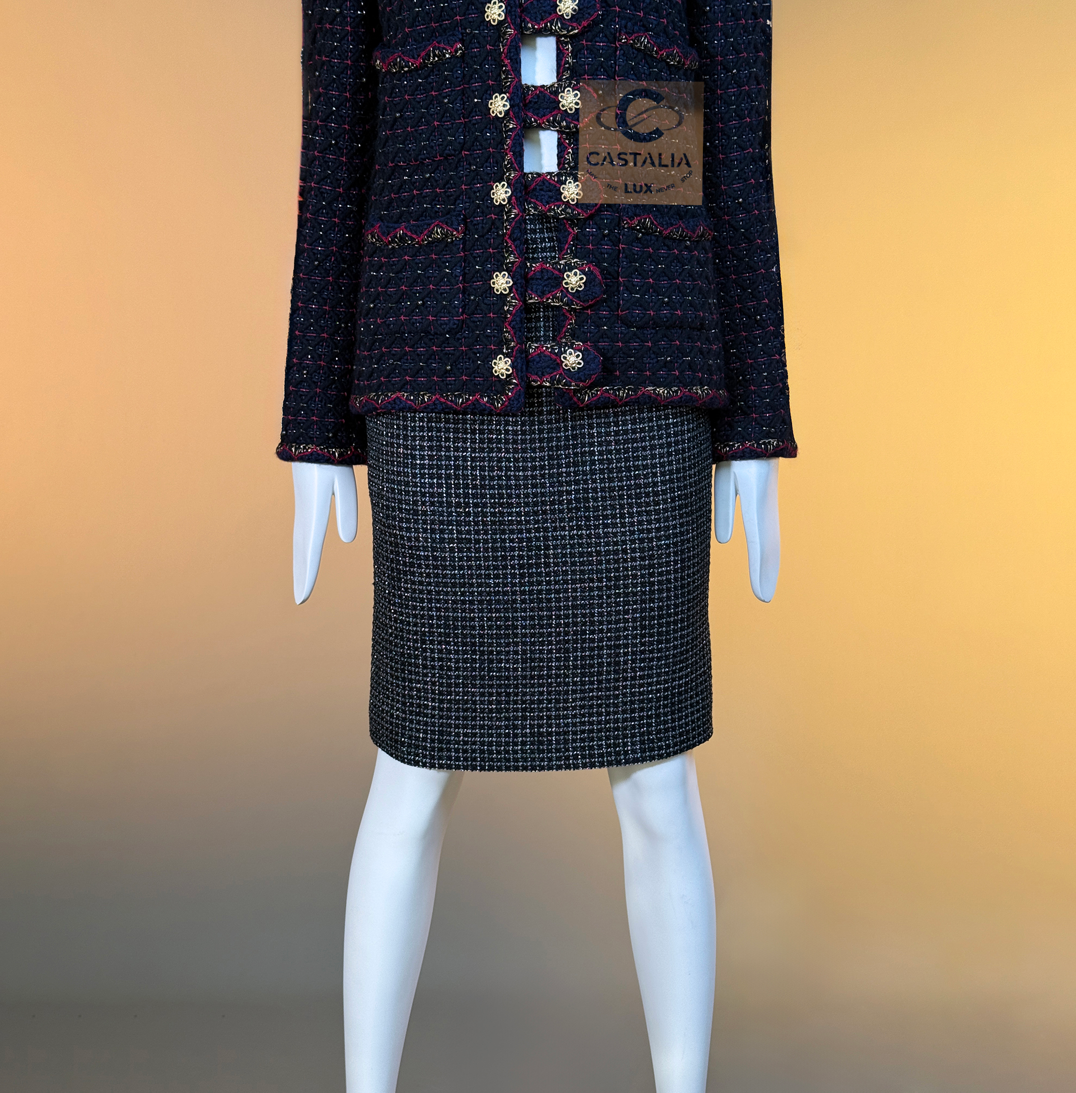 • crafted in deep navy Lesage tweed that holds a dense, noble darkness