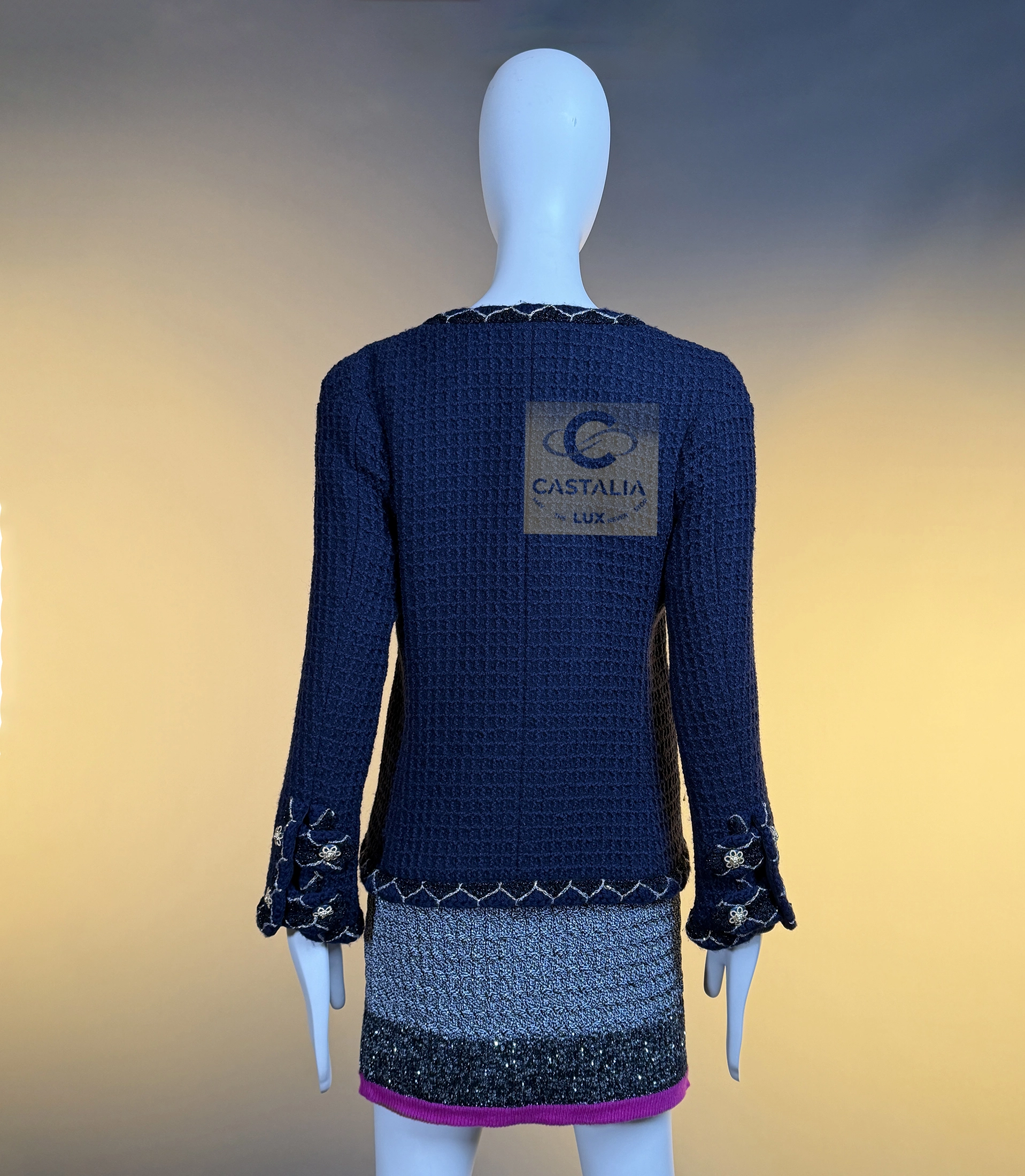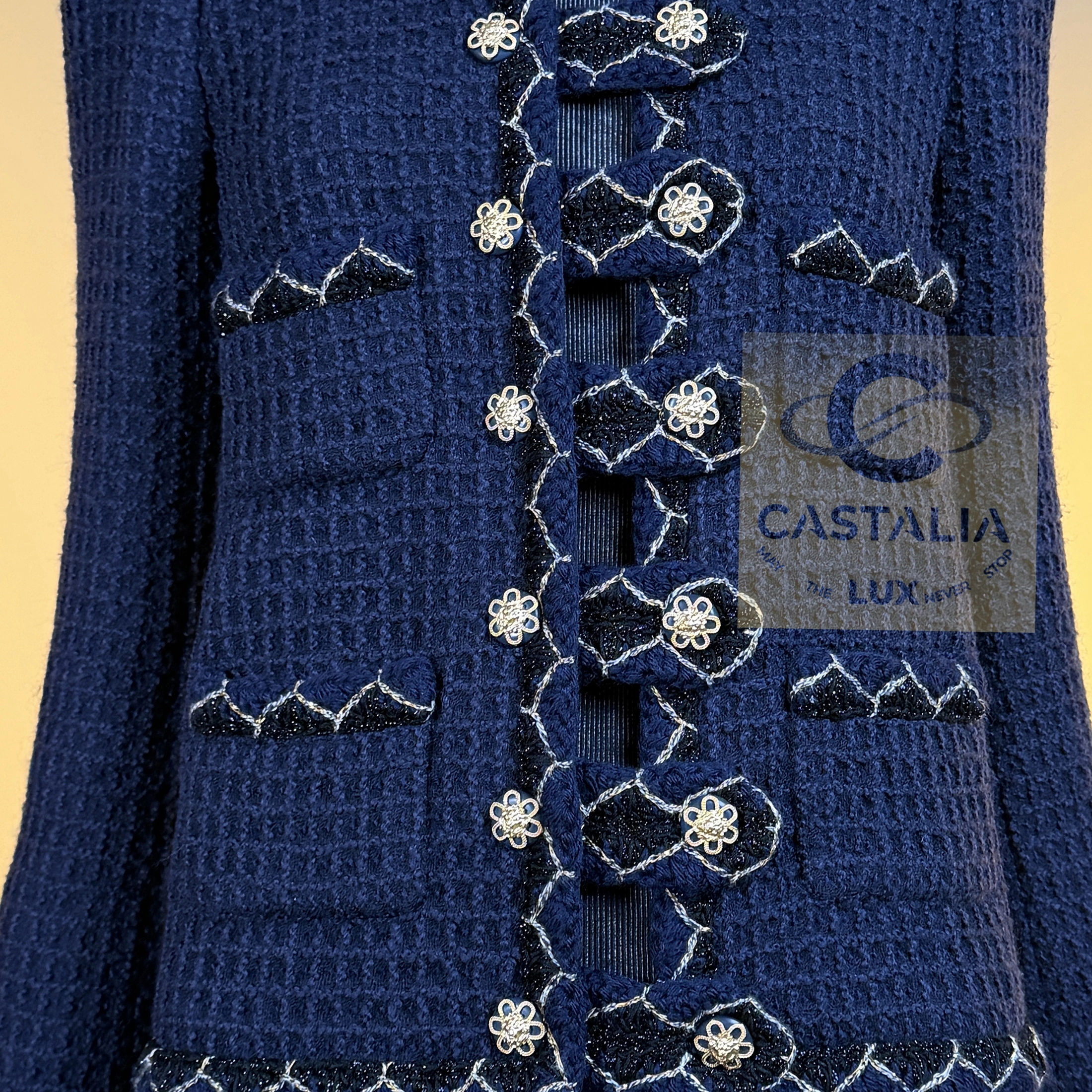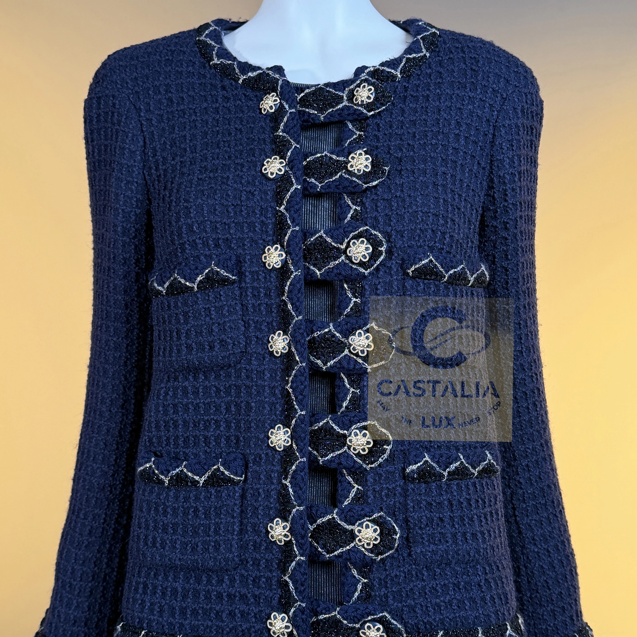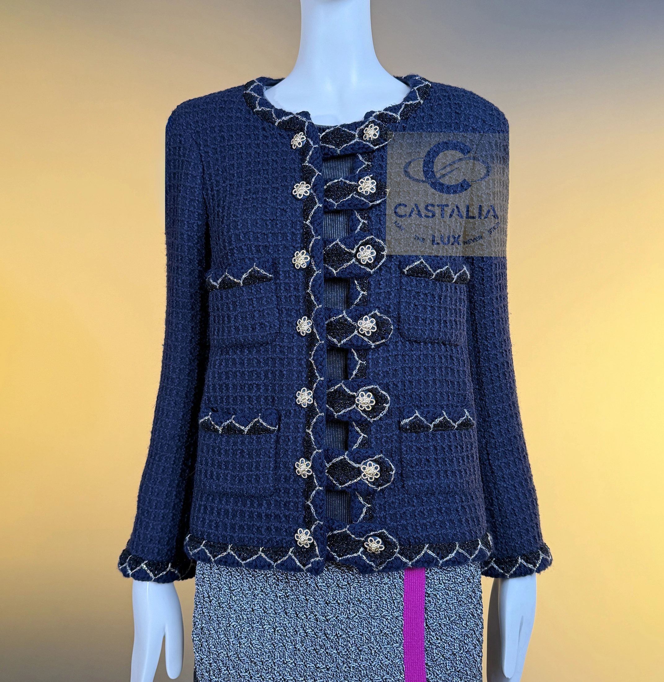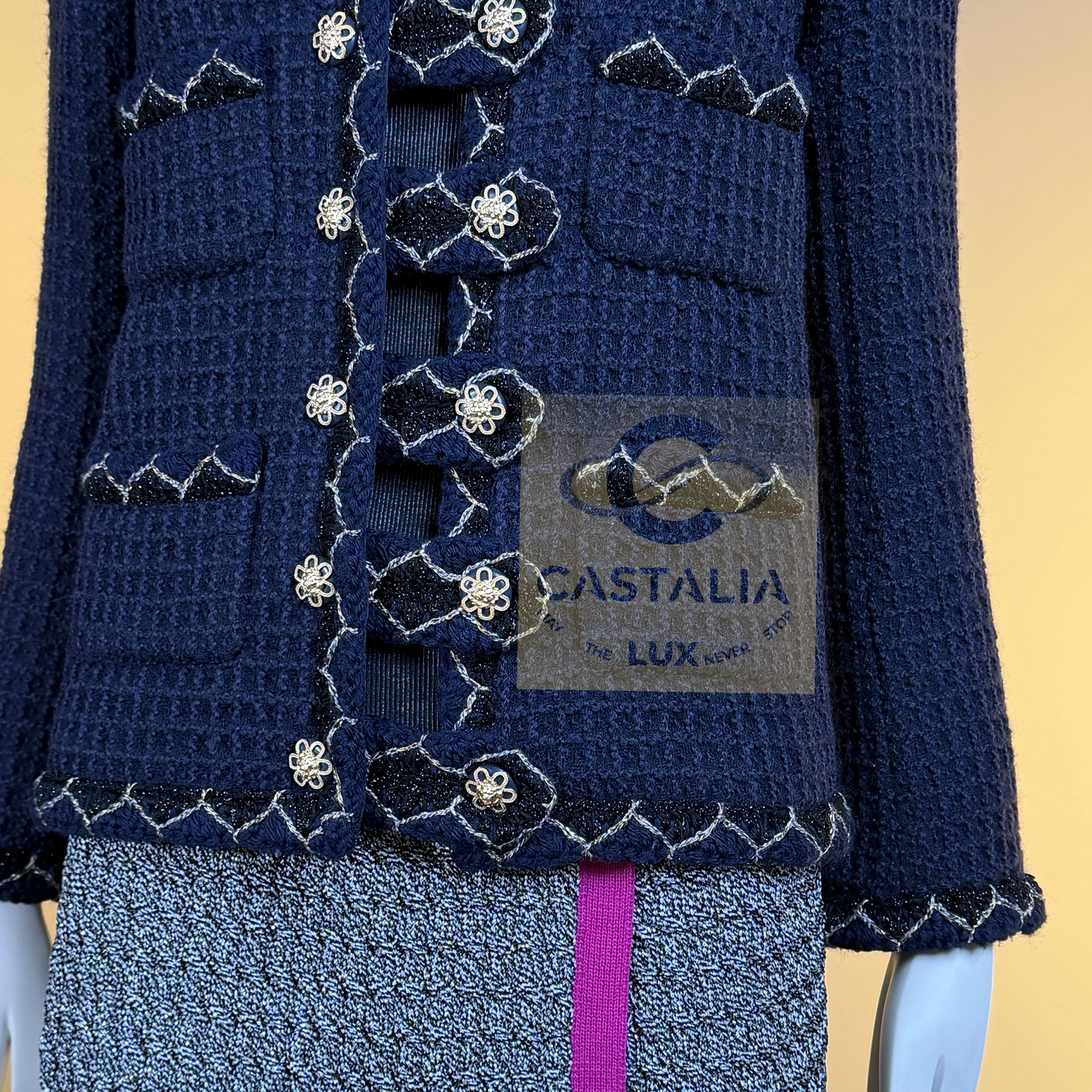 — silhouette is pure Chanel: the iconic four-patch pocket design, balanced in perfect symmetry, framed by the maison’s signature braided trim