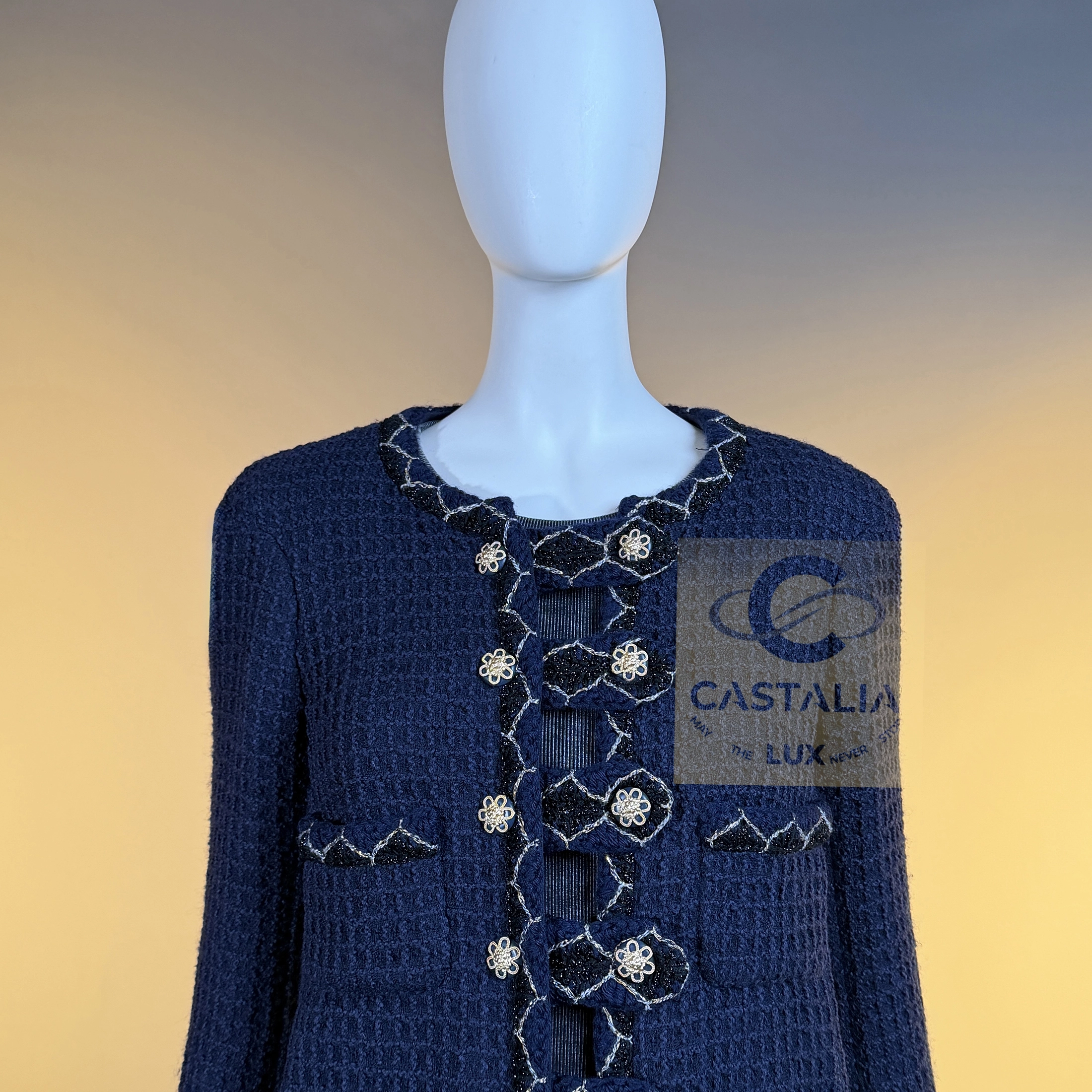 — crowned with masterpiece Gripoix jewel buttons, each casting the golden visage