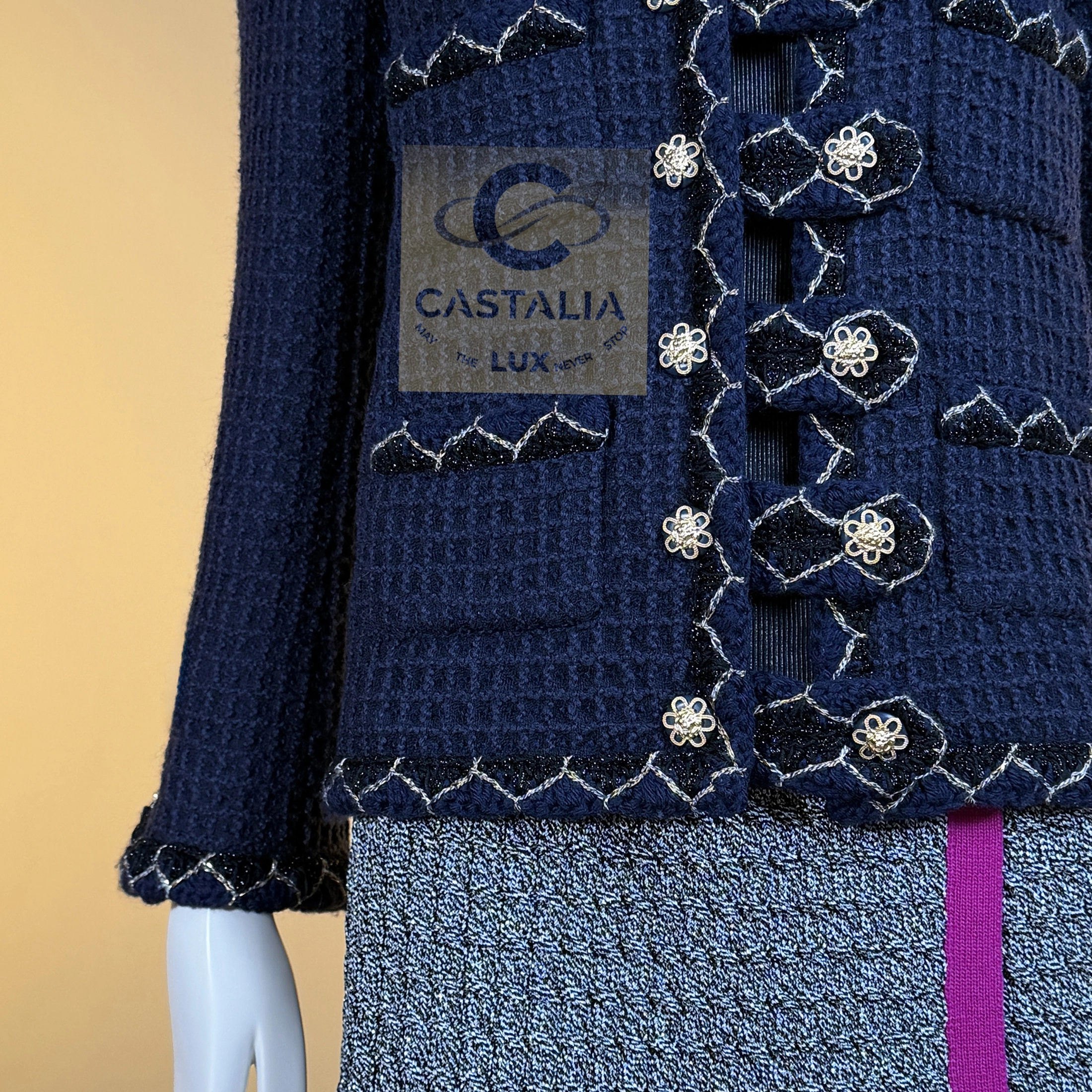 this navy tweed jacket—immortalized in the Paris / SALZBURG 2015 Ad Campaign and worn by Cara Delevingne on billboards across the Globe
