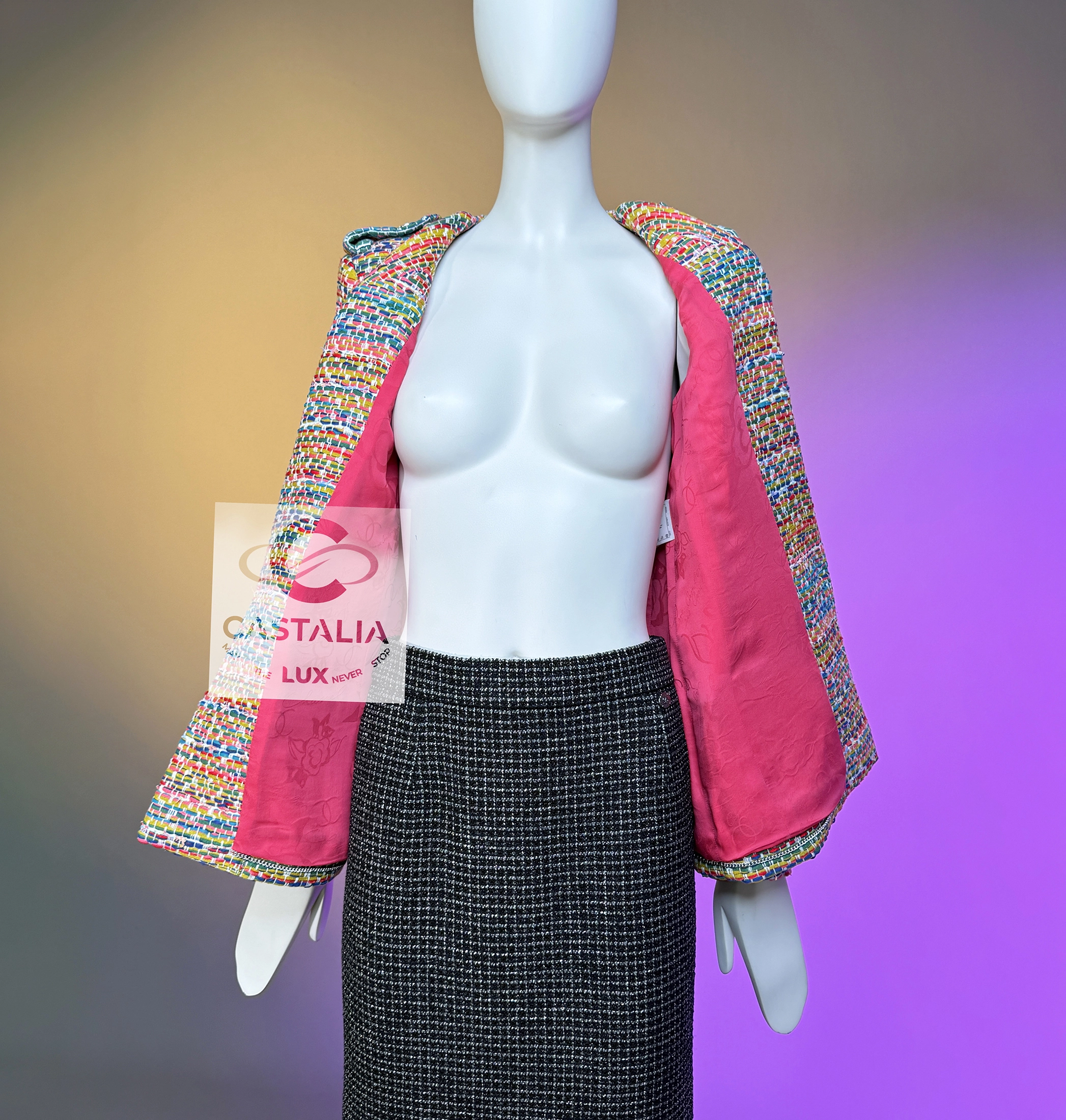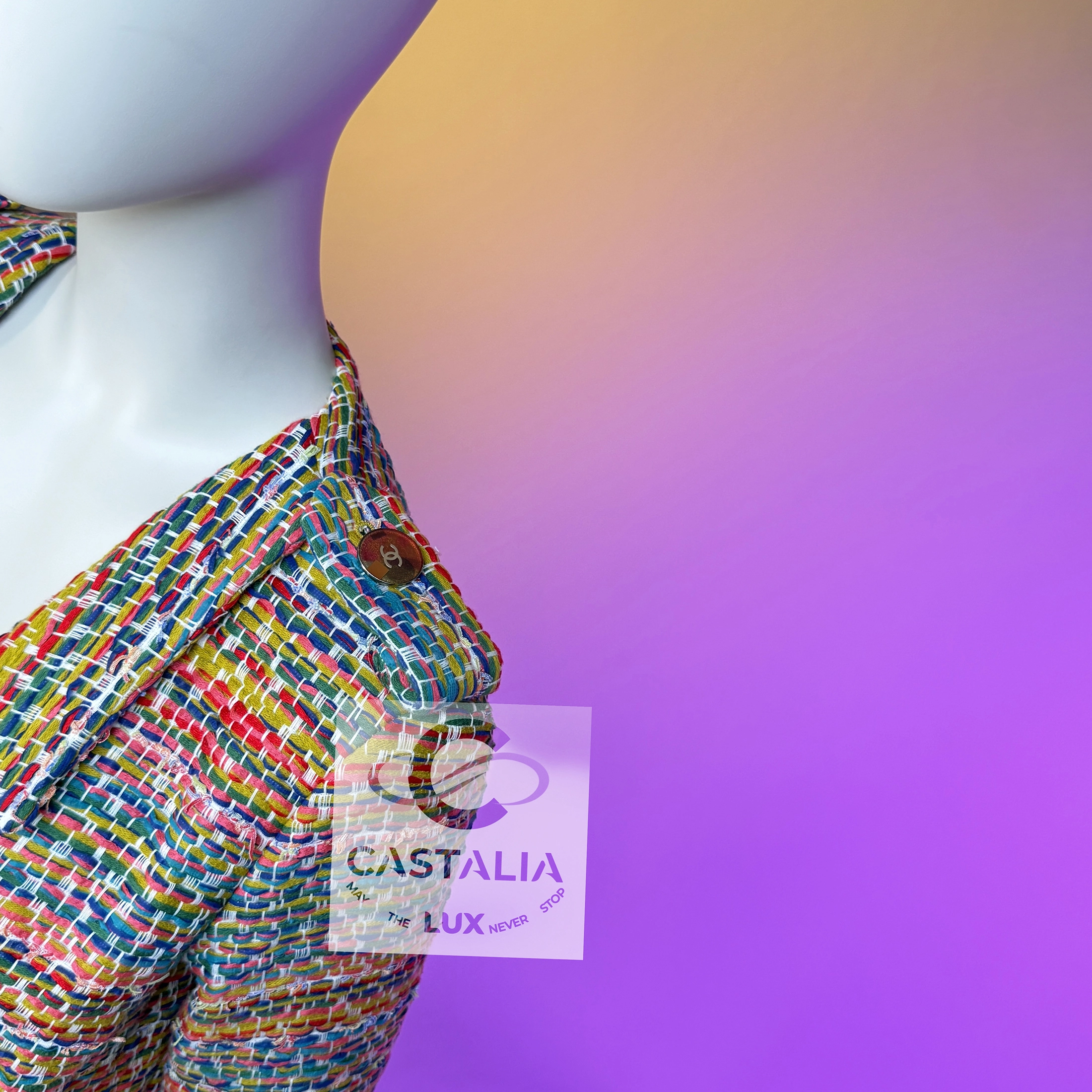 — Handcrafted by the artisans of Maison Lesage, the tweed vibrates with life: vermilion, sapphire, emerald, and sunlit gold interlacing into a kaleidoscopic manuscript — Each line of weave is a verse, each hue a note in Chanel’s chromatic symphony