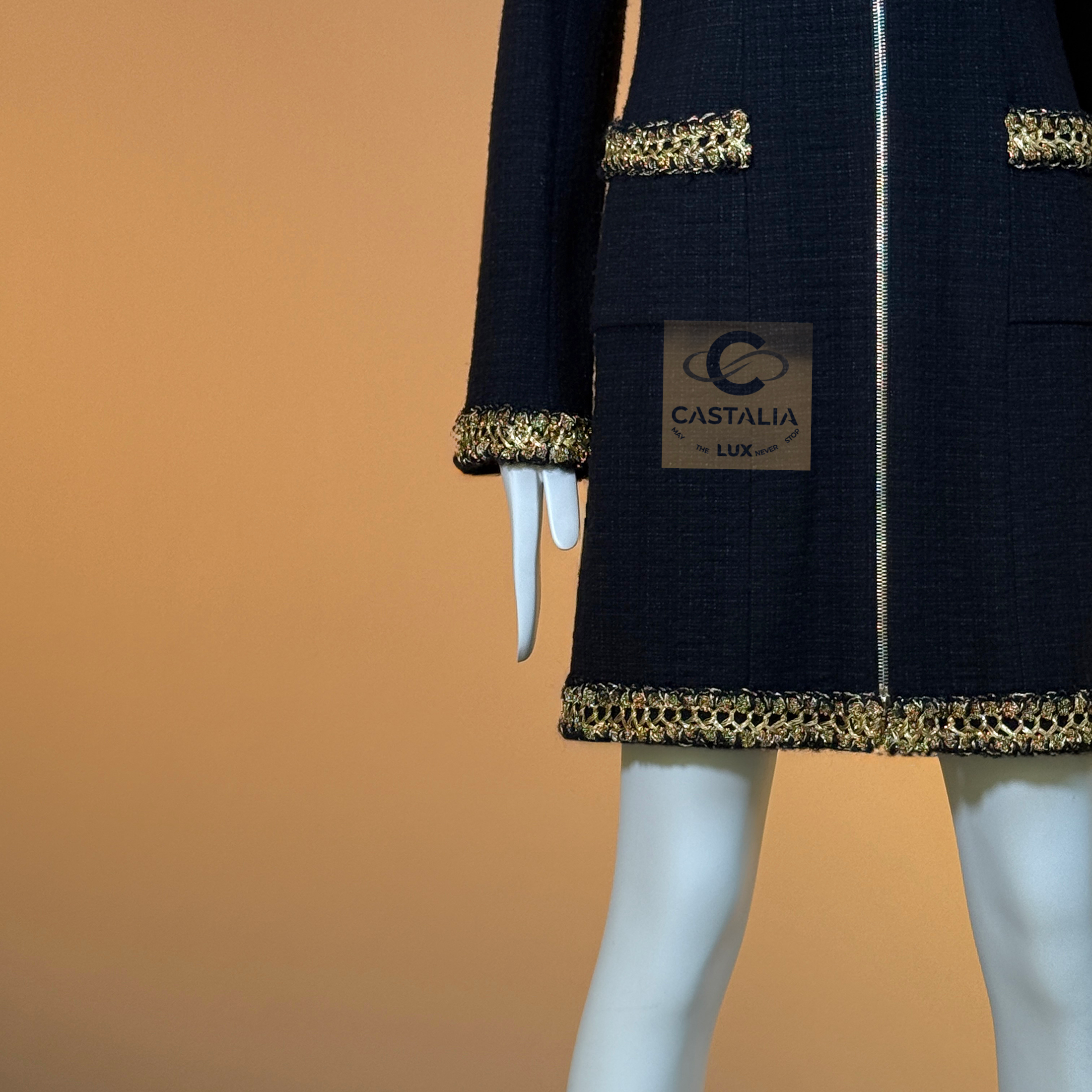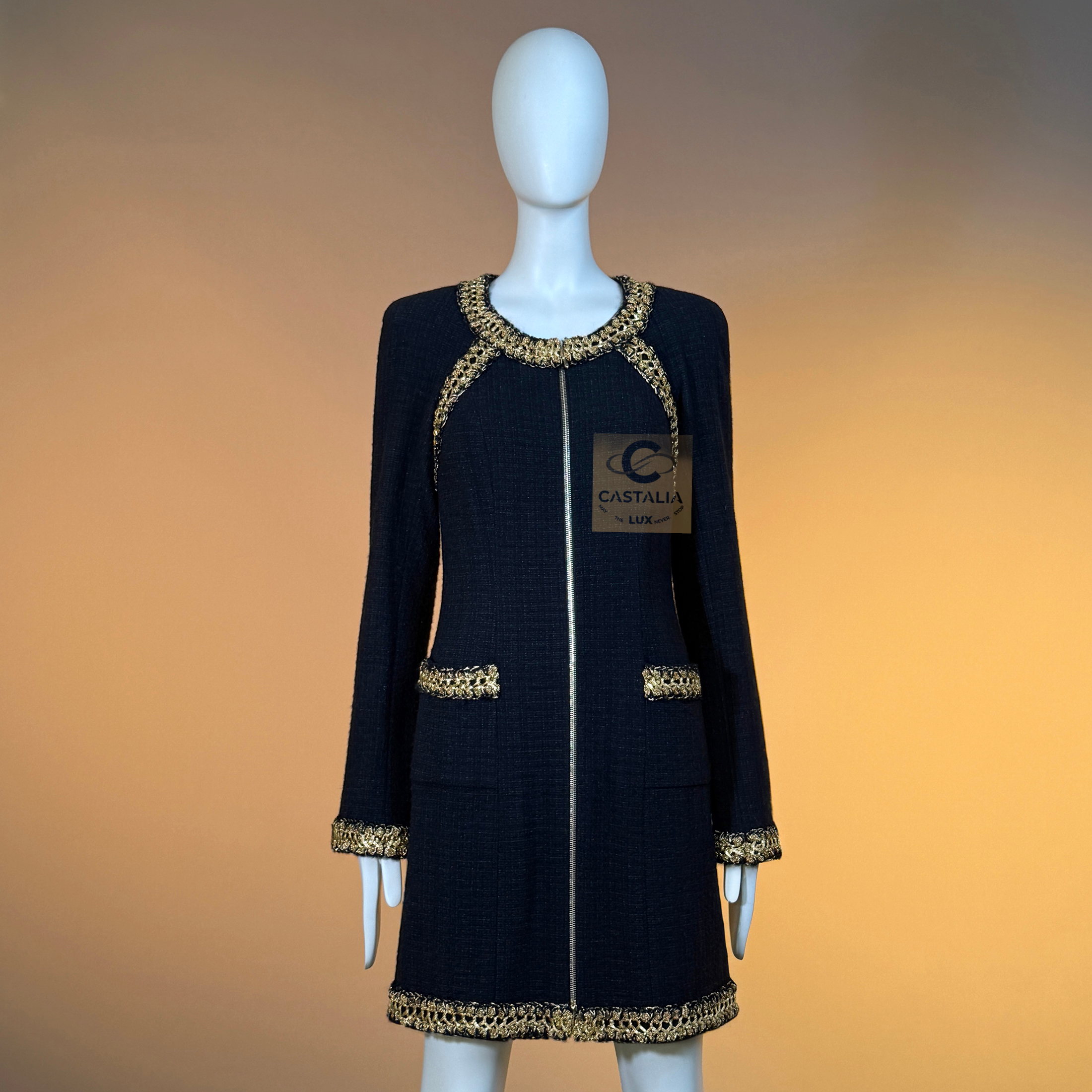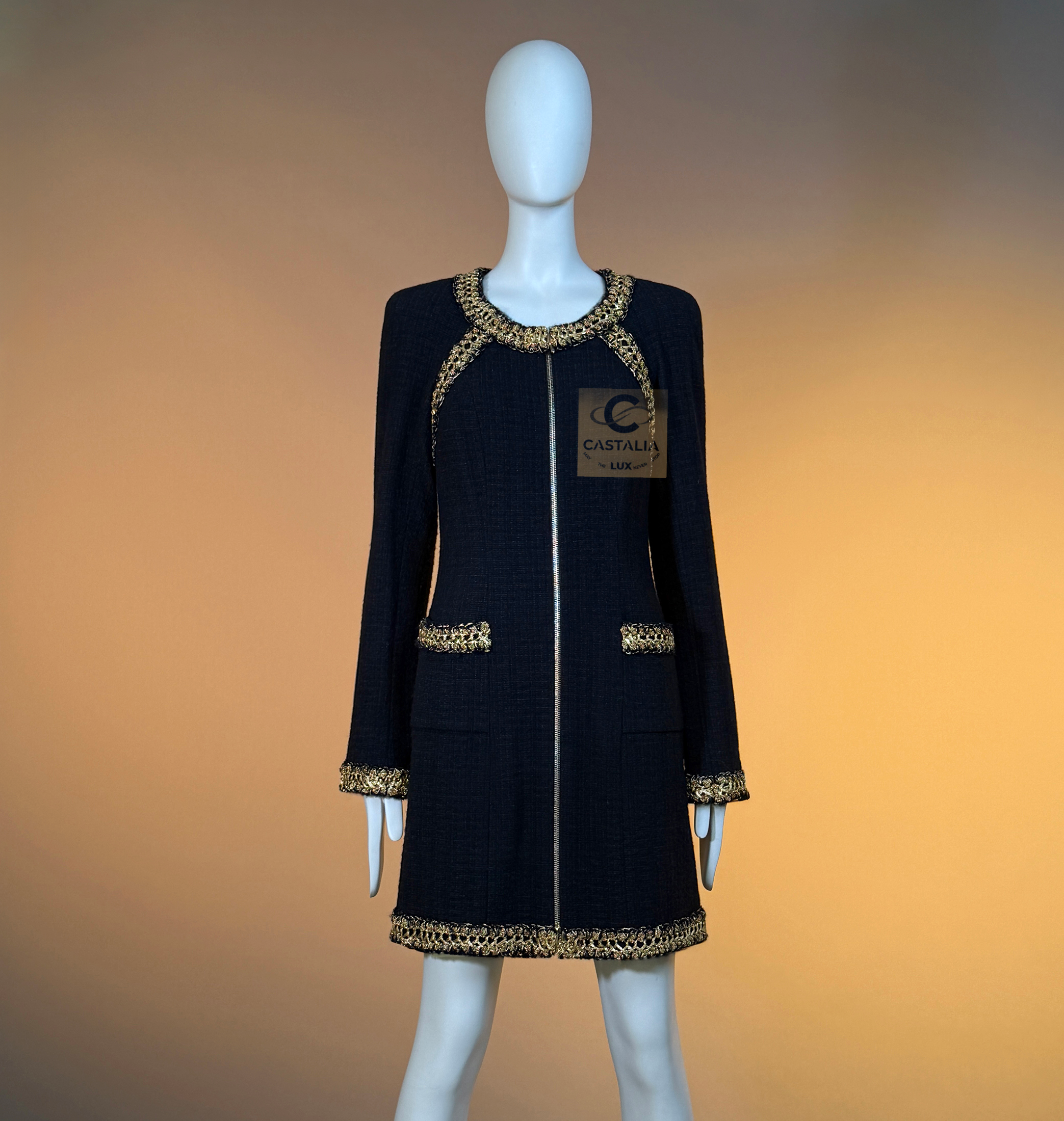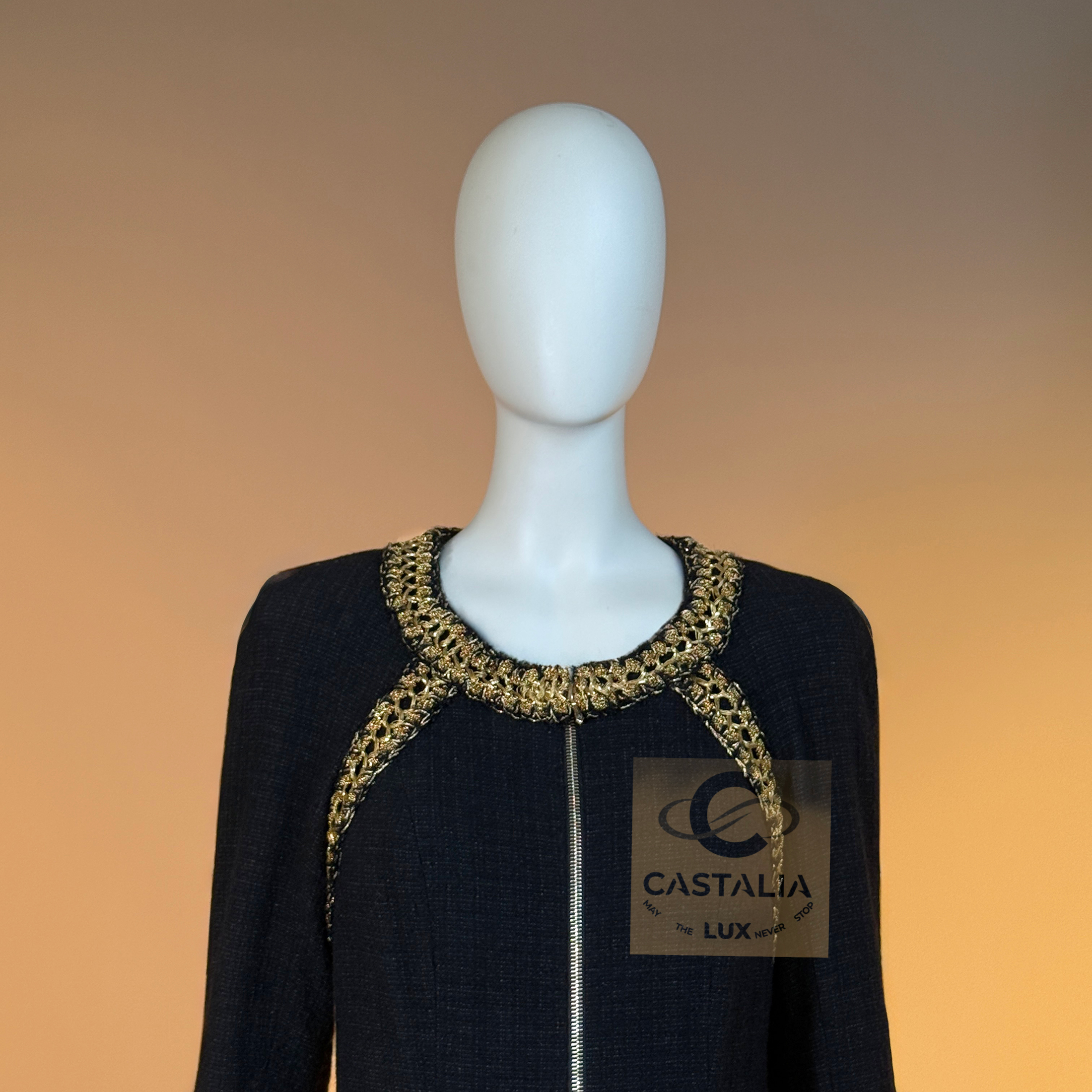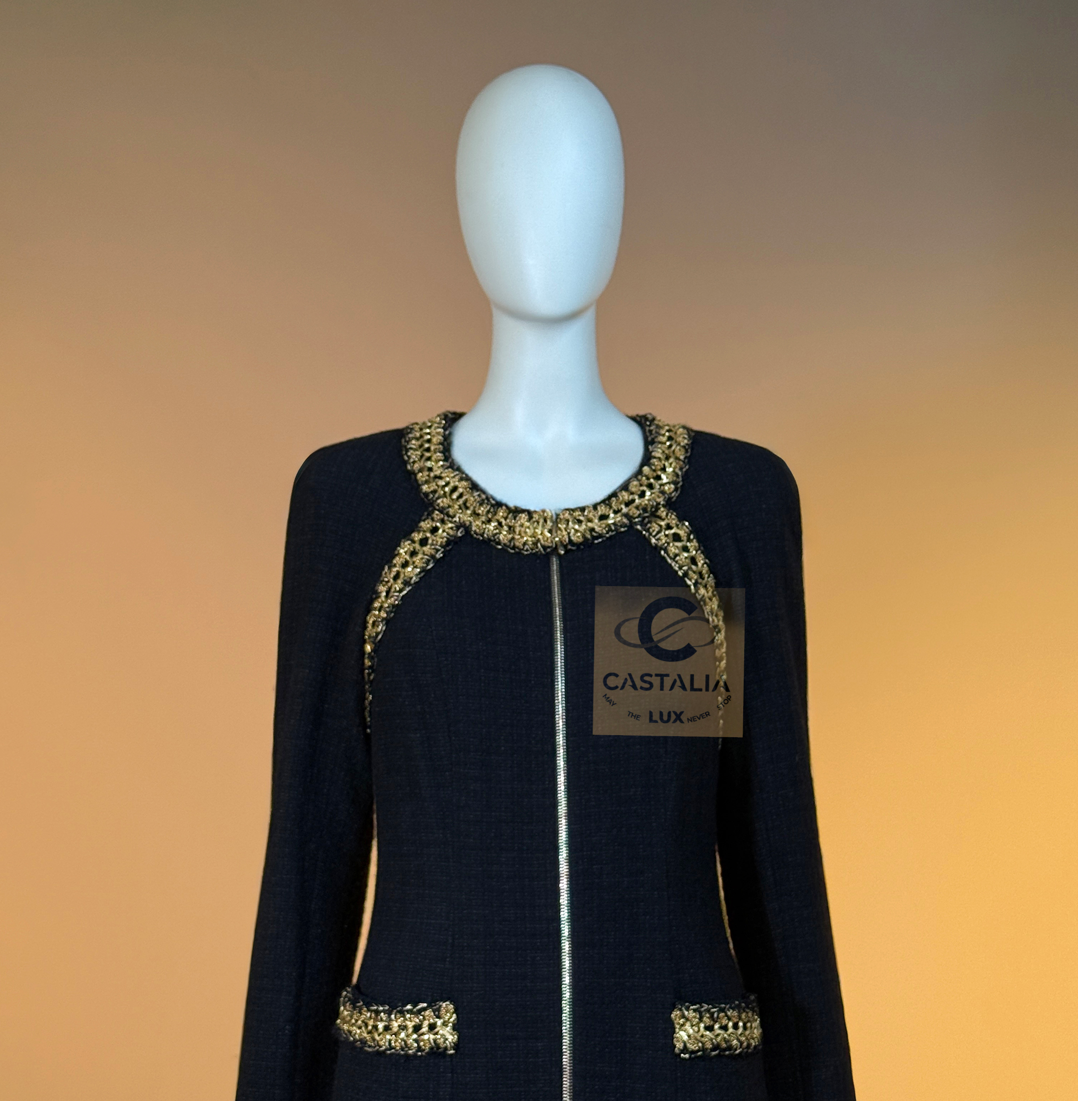 CHANEL · Black Tweed Jacket with Braided Trim — Paris / SHANGHAI 2010 Métiers d’Art, Karl Lagerfeld • One of the House’s most mythic: Billboard and ad Campaign seen, celebrity-cited, and culturally fixed — Paris / Shanghai 2010 is a cornerstone chapter of modern Chanel mythology — where the House staged itself as cultural authority // Size mark 36 FR / Condition: never worn // — House Codes · Material Authority — • Signature black tweed — dense, nocturnal, and architected to hold line with quiet authority • Gold metallic trim throughout — the Métiers border, braided like gilt calligraphy, framing neckline, front, pockets, cuffs, and hem with ritual precision — Jewels · Seals · Talisman Hardware — • CC-signature details anchored by an ancient coin charm at the cuff — a miniature relic, turning the sleeve into a talisman point • Logo zip closure — clean, modern punctuation, sealing the front like a single decisive stroke — Silhouette · Presence • Elegant fitted architecture — elongated, composed, and camera-ready, designed to read like couture armor • Tonal silk lining inside — private completion, calm against the skin, exact in drape.