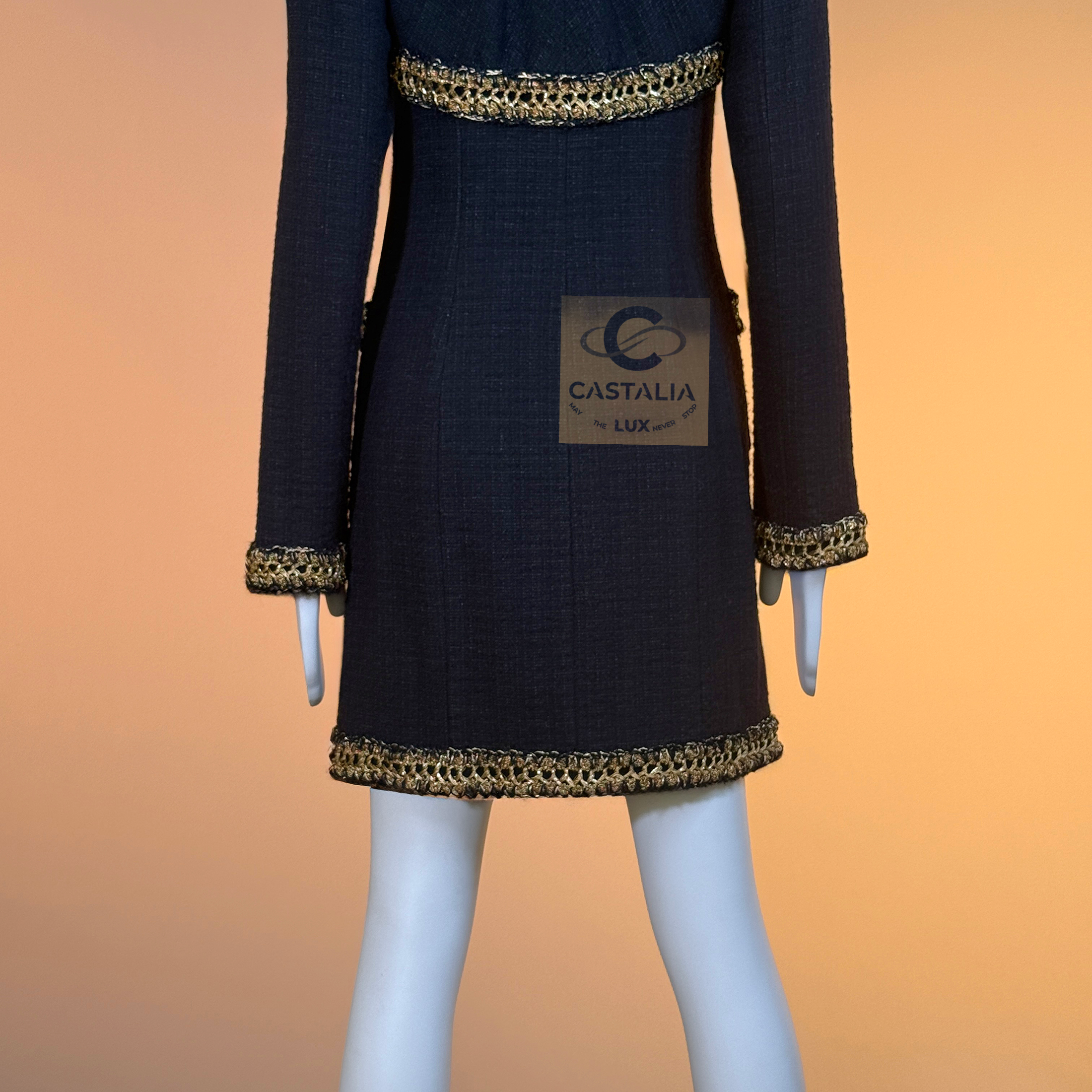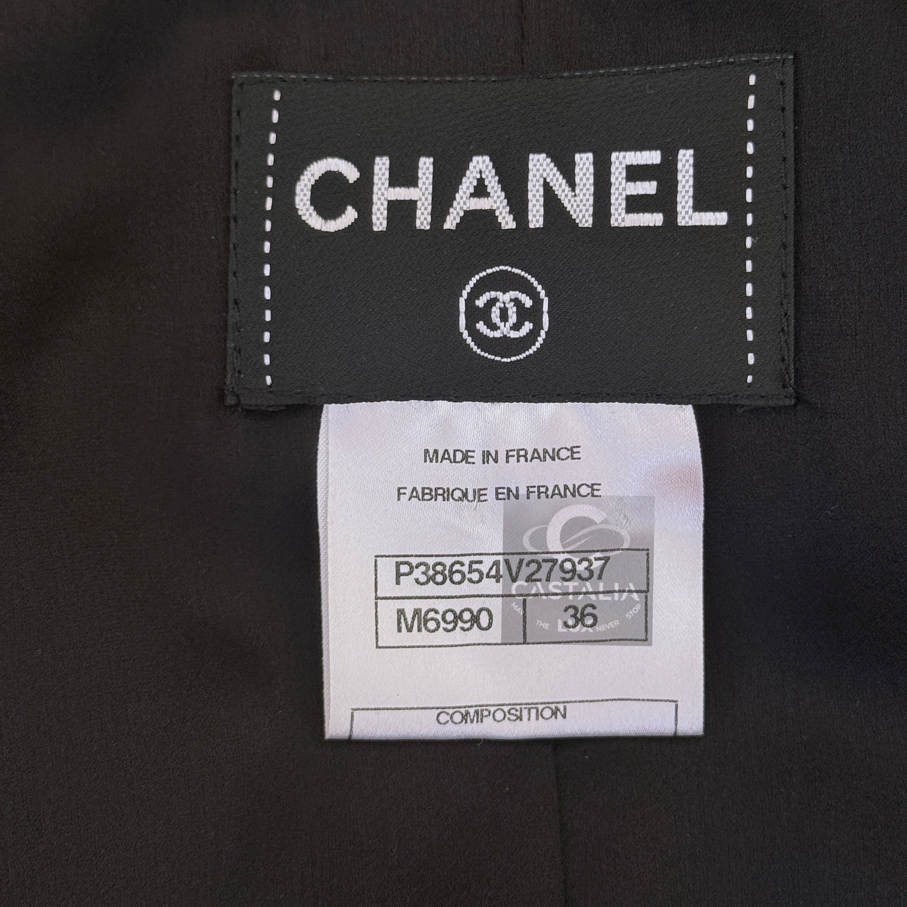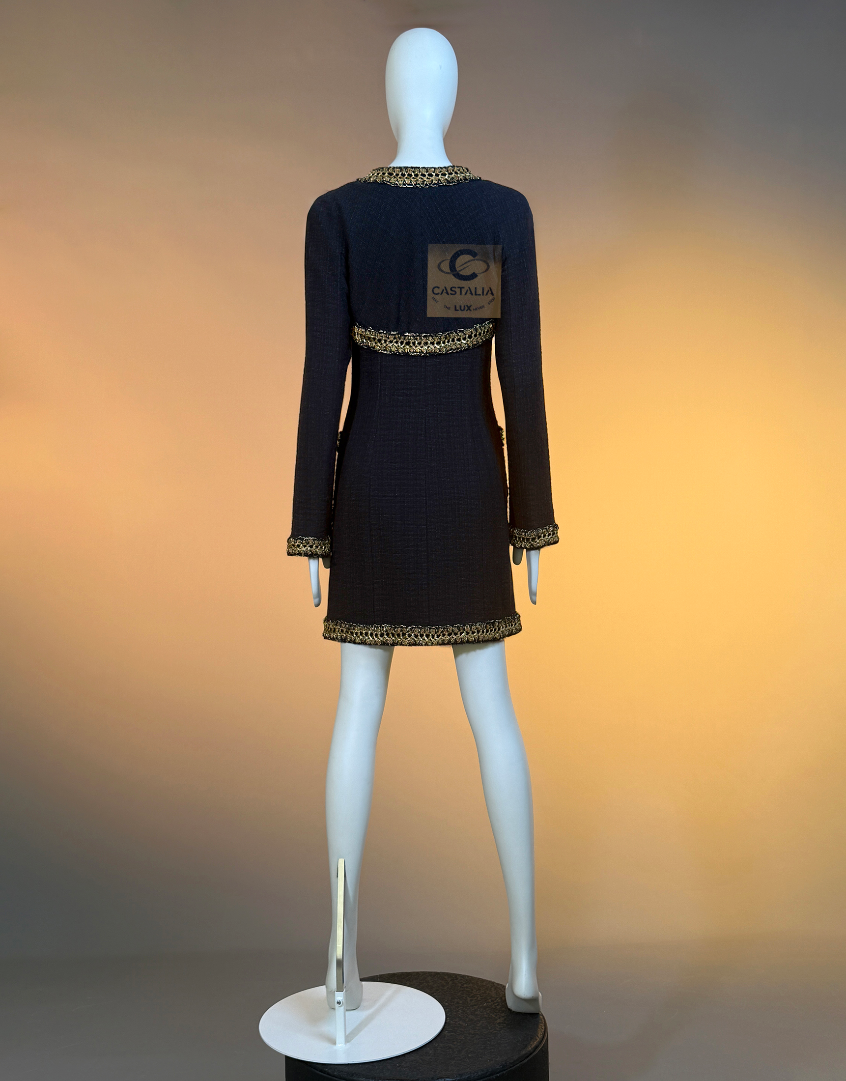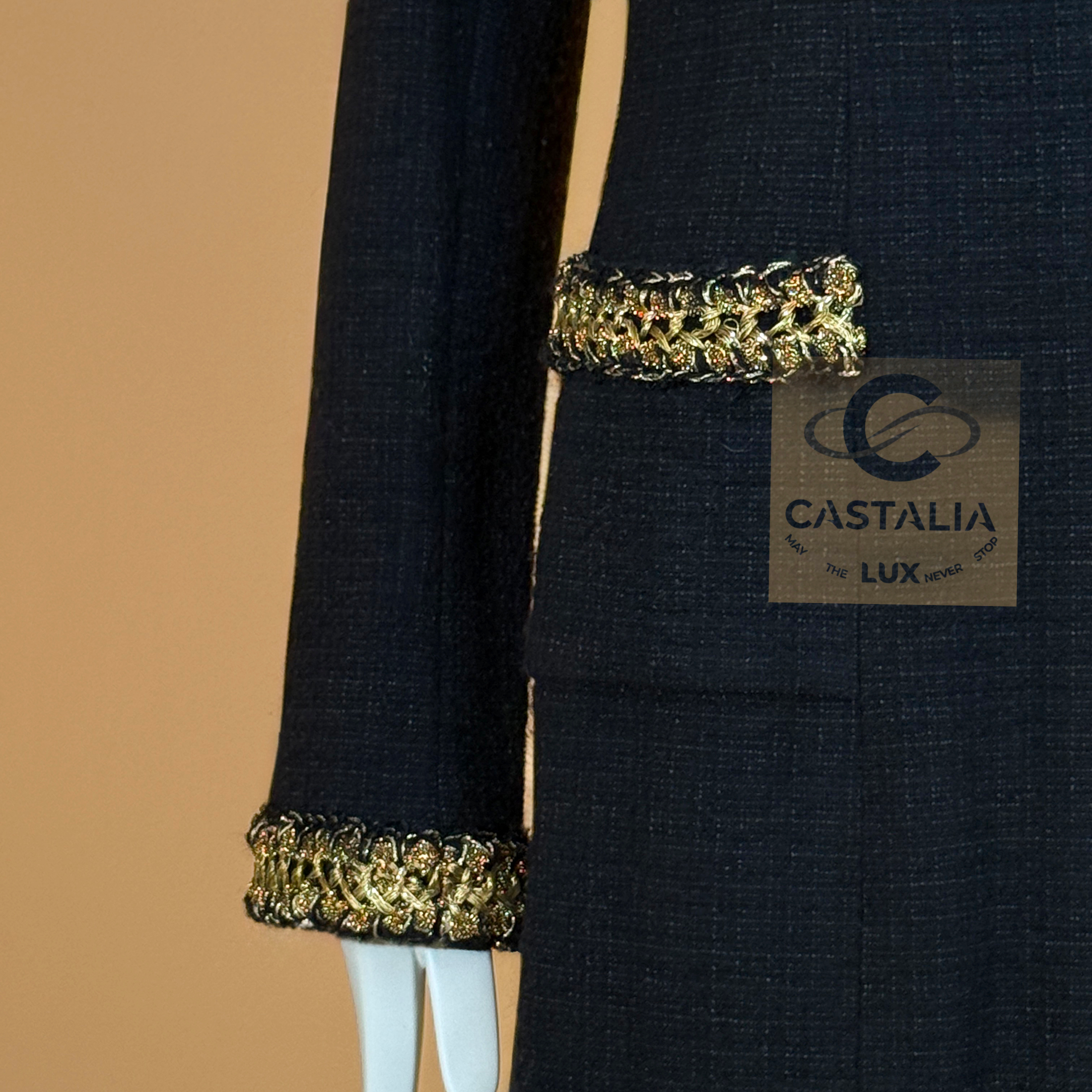 CHANEL · Black Tweed Jacket with Braided Trim — Paris / SHANGHAI 2010 Métiers d’Art, Karl Lagerfeld • One of the House’s most mythic: Billboard and ad Campaign seen, celebrity-cited, and culturally fixed — Paris / Shanghai 2010 is a cornerstone chapter of modern Chanel mythology — where the House staged itself as cultural authority // Size mark 36 FR / Condition: never worn // — House Codes · Material Authority — • Signature black tweed — dense, nocturnal, and architected to hold line with quiet authority • Gold metallic trim throughout — the Métiers border, braided like gilt calligraphy, framing neckline, front, pockets, cuffs, and hem with ritual precision — Jewels · Seals · Talisman Hardware — • CC-signature details anchored by an ancient coin charm at the cuff — a miniature relic, turning the sleeve into a talisman point • Logo zip closure — clean, modern punctuation, sealing the front like a single decisive stroke — Silhouette · Presence • Elegant fitted architecture — elongated, composed, and camera-ready, designed to read like couture armor • Tonal silk lining inside — private completion, calm against the skin, exact in drape.