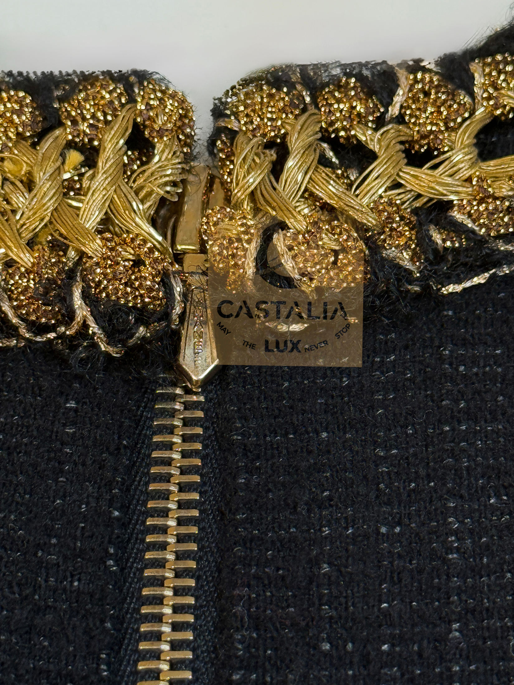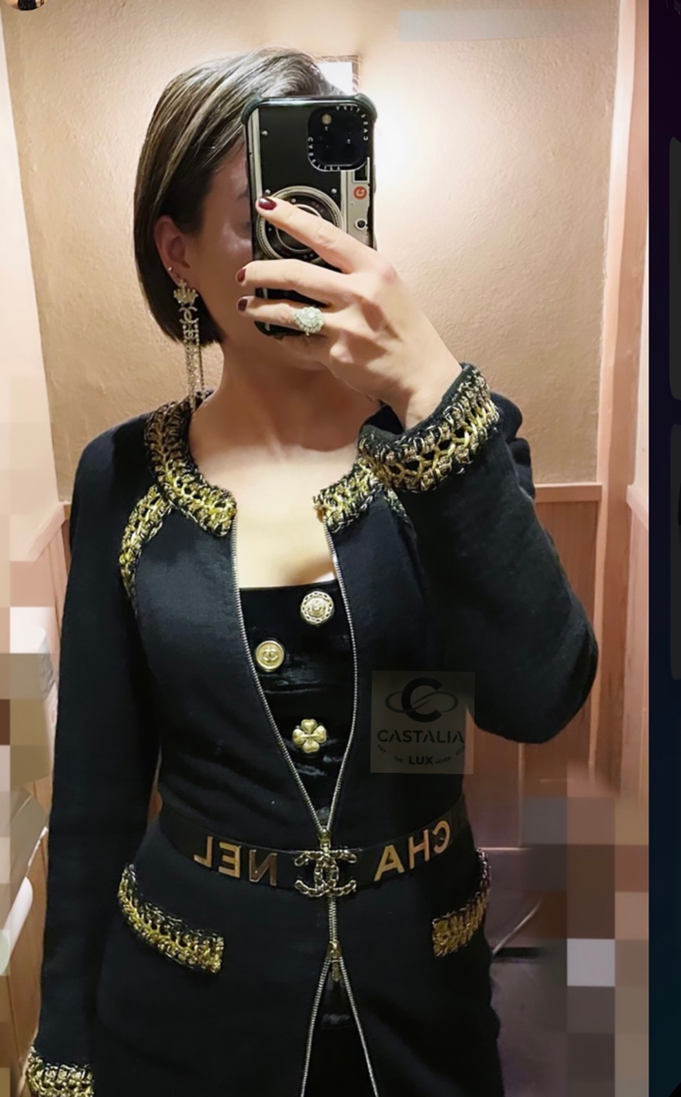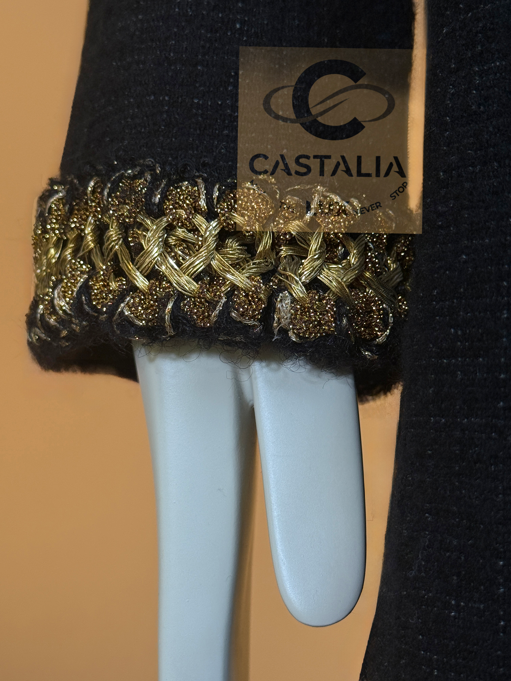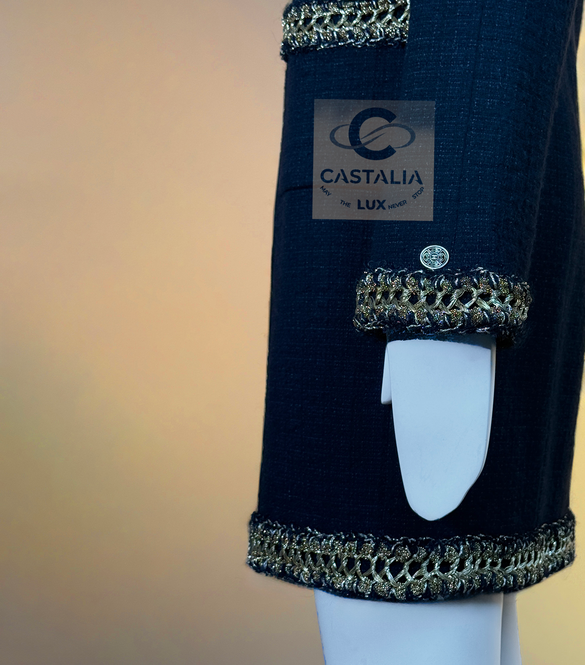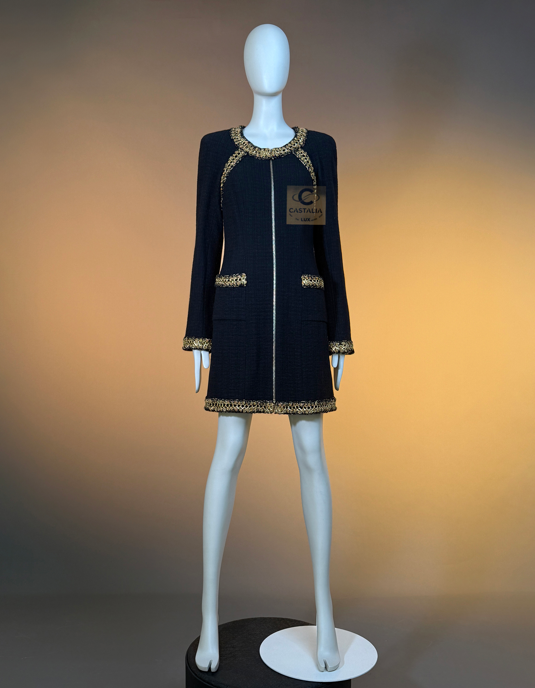 CHANEL · Black Tweed Jacket with Braided Trim — Paris / SHANGHAI 2010 Métiers d’Art, Karl Lagerfeld • One of the House’s most mythic: Billboard and ad Campaign seen, celebrity-cited, and culturally fixed — Paris / Shanghai 2010 is a cornerstone chapter of modern Chanel mythology — where the House staged itself as cultural authority // Size mark 36 FR / Condition: never worn // — House Codes · Material Authority — • Signature black tweed — dense, nocturnal, and architected to hold line with quiet authority • Gold metallic trim throughout — the Métiers border, braided like gilt calligraphy, framing neckline, front, pockets, cuffs, and hem with ritual precision — Jewels · Seals · Talisman Hardware — • CC-signature details anchored by an ancient coin charm at the cuff — a miniature relic, turning the sleeve into a talisman point • Logo zip closure — clean, modern punctuation, sealing the front like a single decisive stroke — Silhouette · Presence • Elegant fitted architecture — elongated, composed, and camera-ready, designed to read like couture armor • Tonal silk lining inside — private completion, calm against the skin, exact in drape.