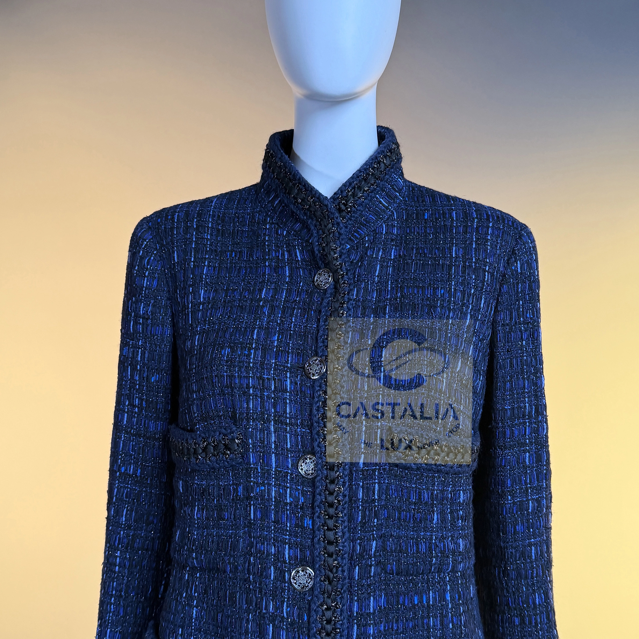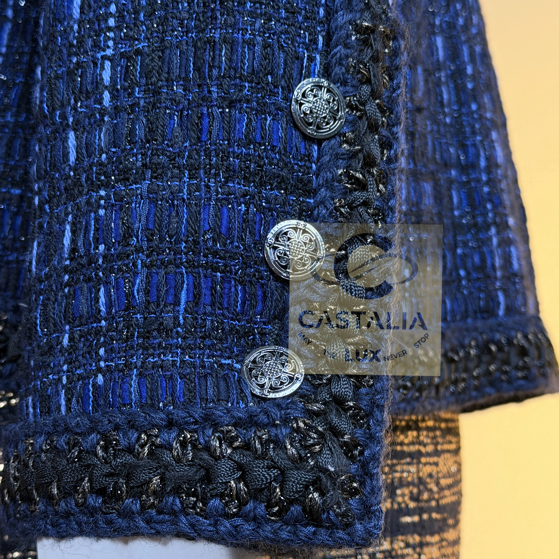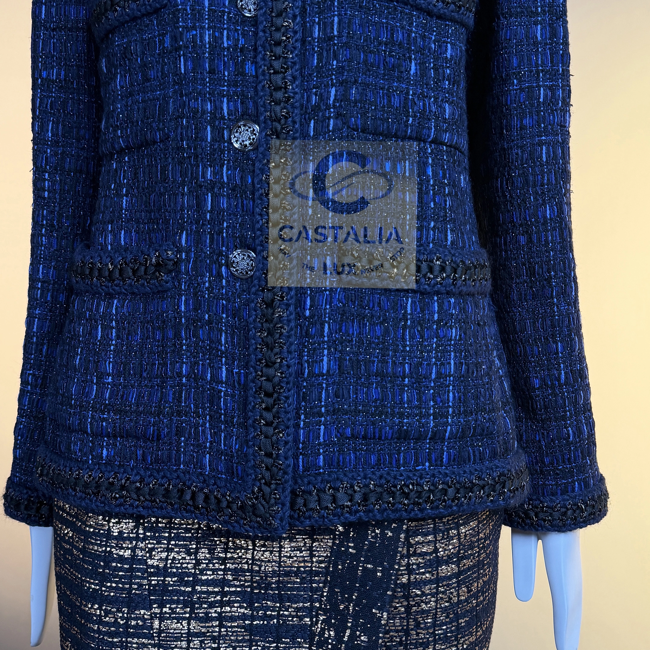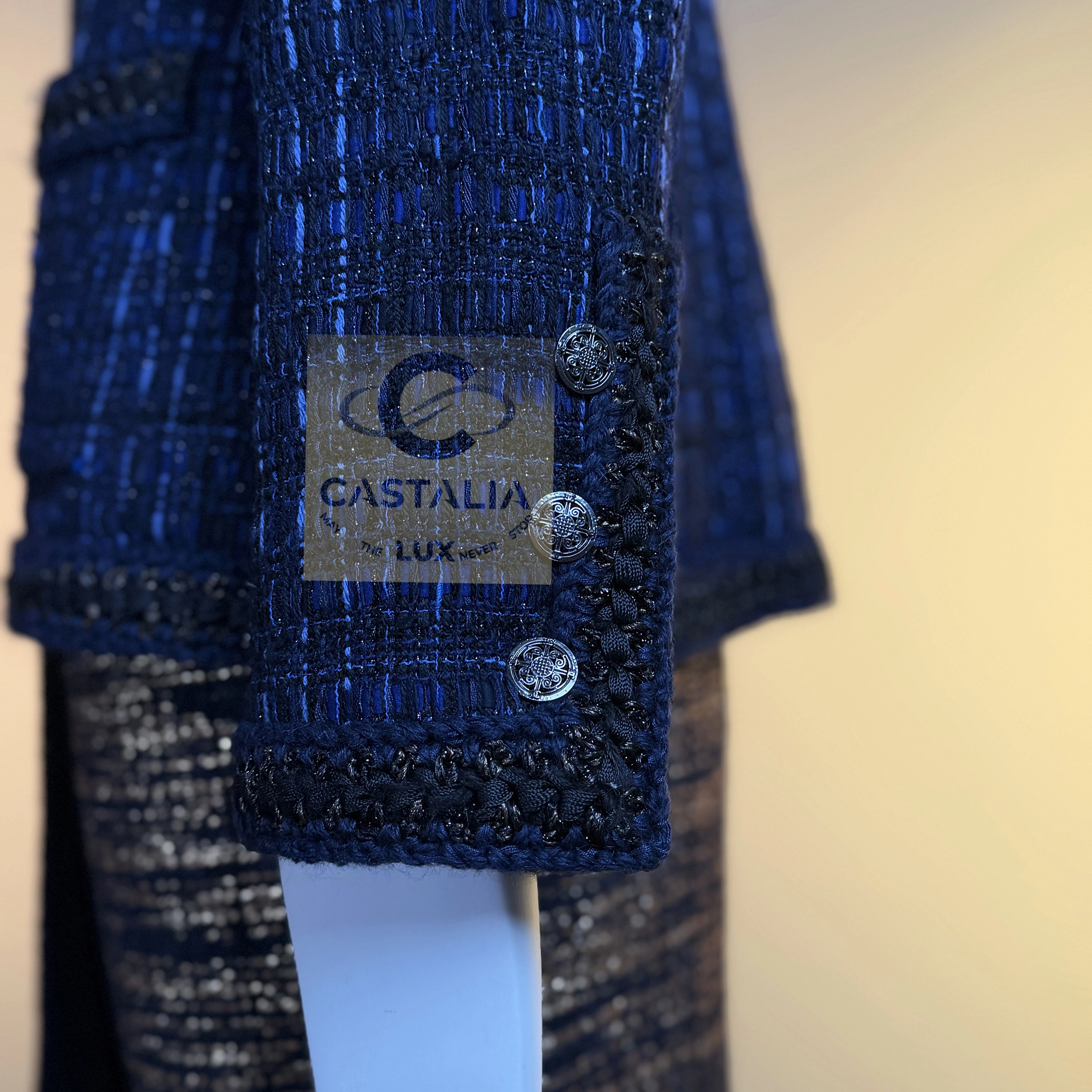 — Woven in the sanctum of the Lesage atelier, the tweed merges black with radiant threads of royal blue, hand-crafted through countless hours of artisanal devotion