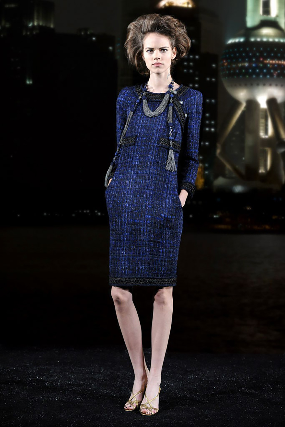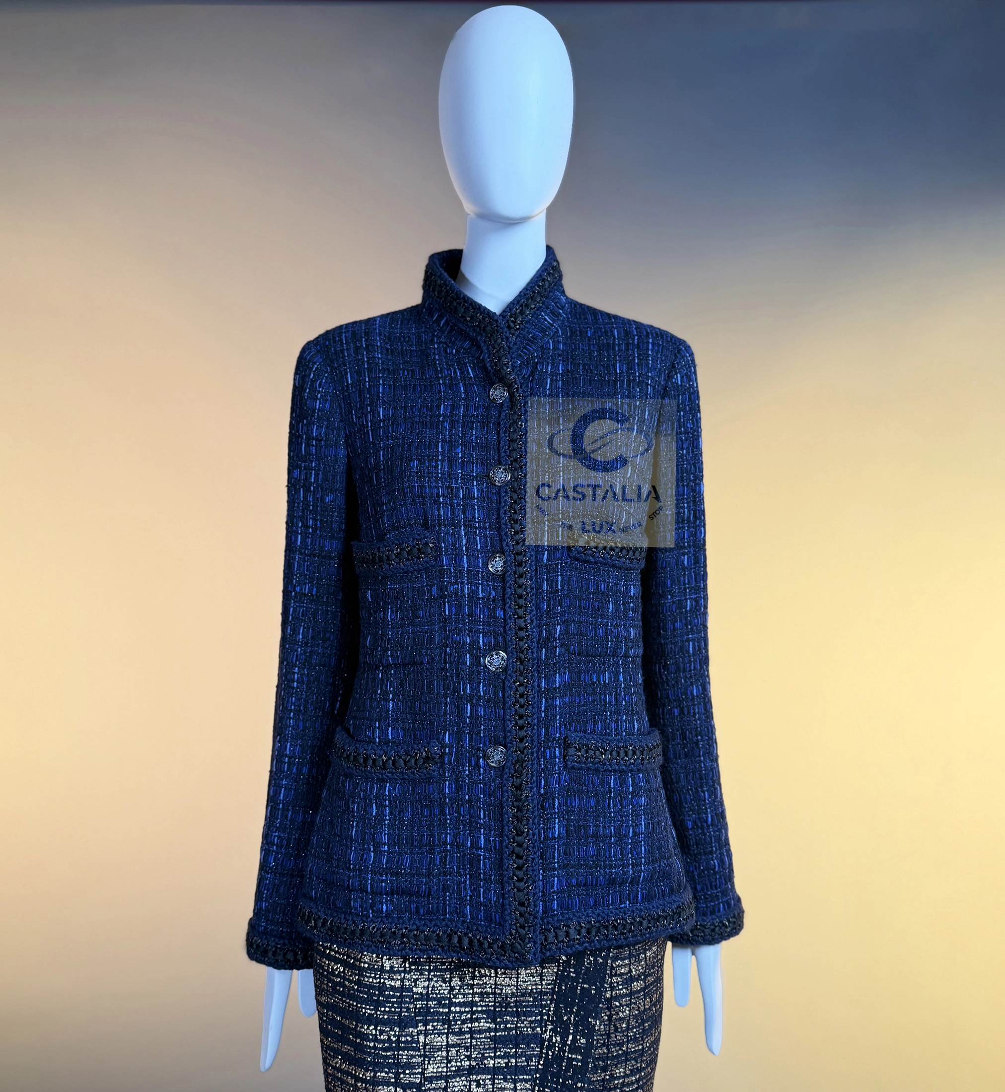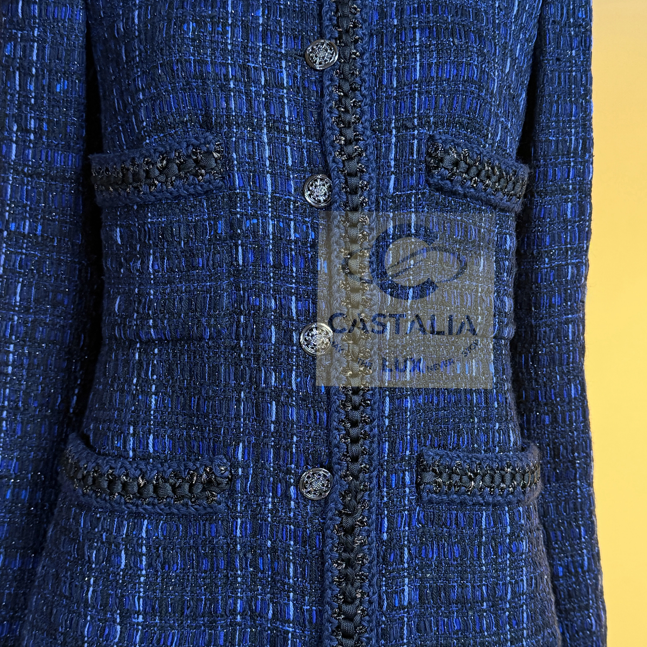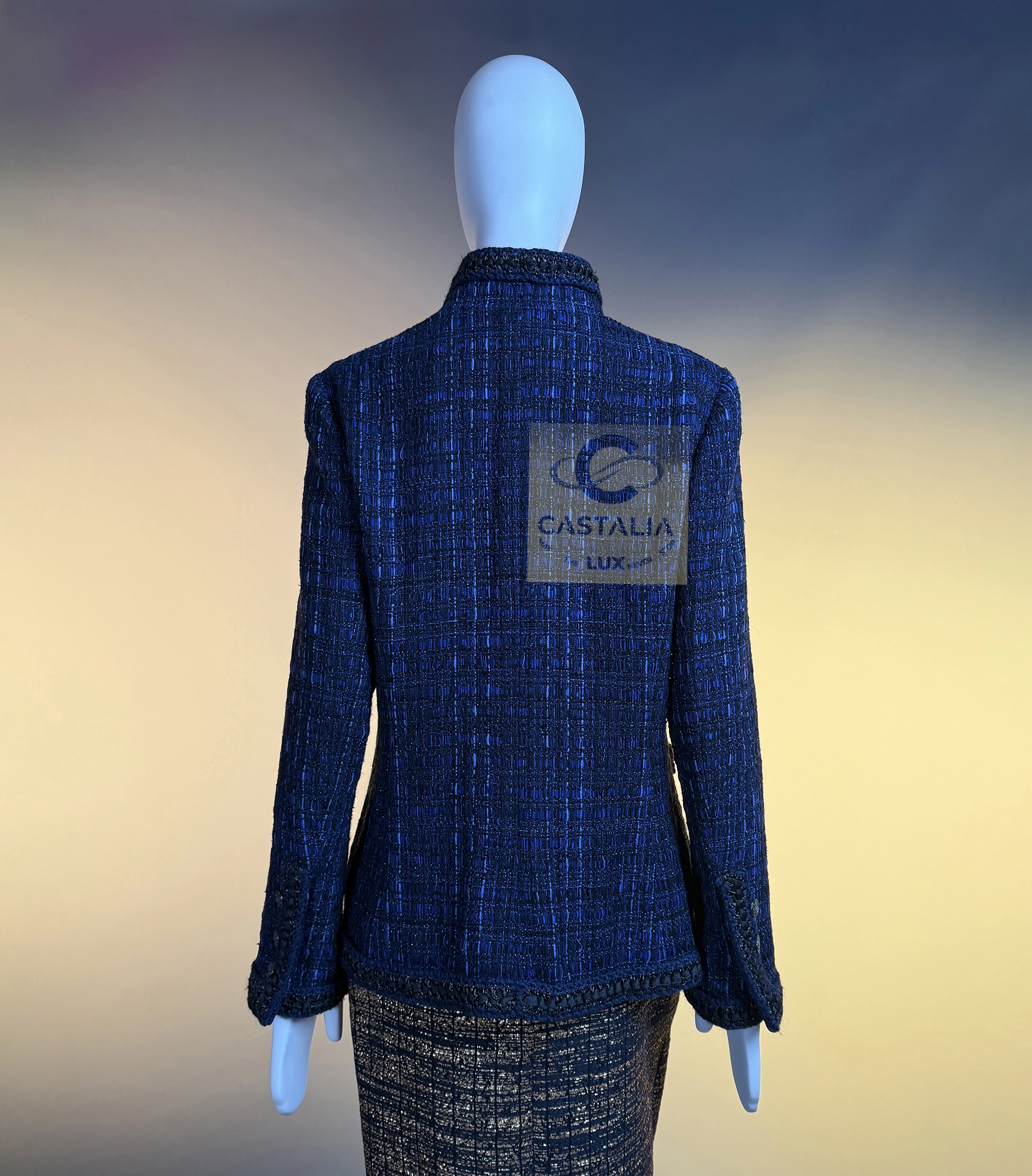 — Woven in the sanctum of the Lesage atelier, the tweed merges black with radiant threads of royal blue, hand-crafted through countless hours of artisanal devotion