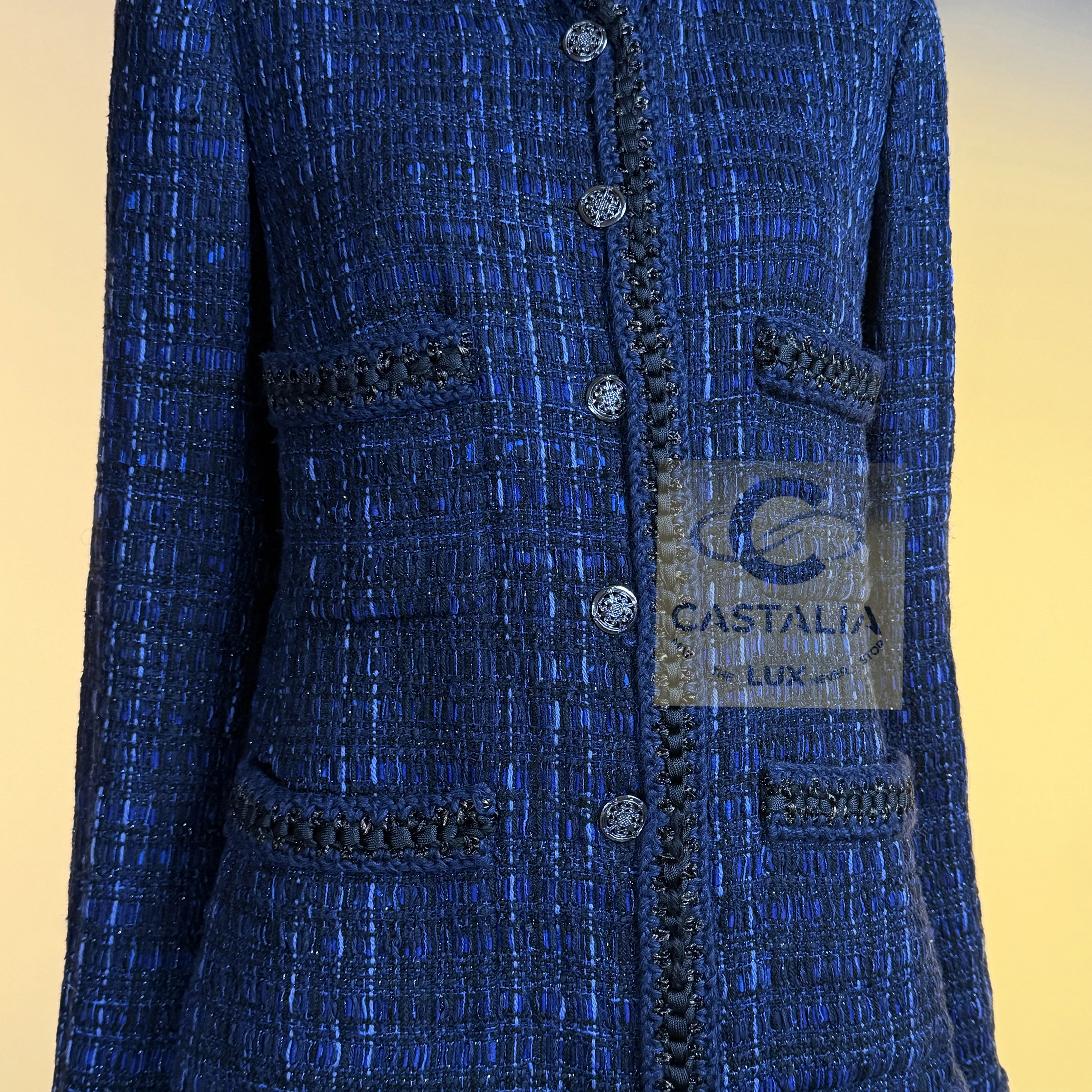 — Woven in the sanctum of the Lesage atelier, the tweed merges black with radiant threads of royal blue,