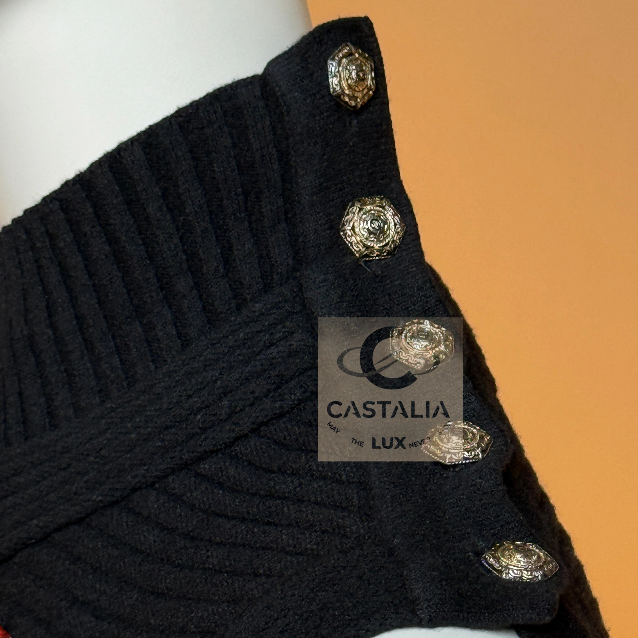 — high ribbed collar is secured at the side by signature CC Gripoix jewel buttons—ornaments as much talismans—evoking the clasp of an imperial seal