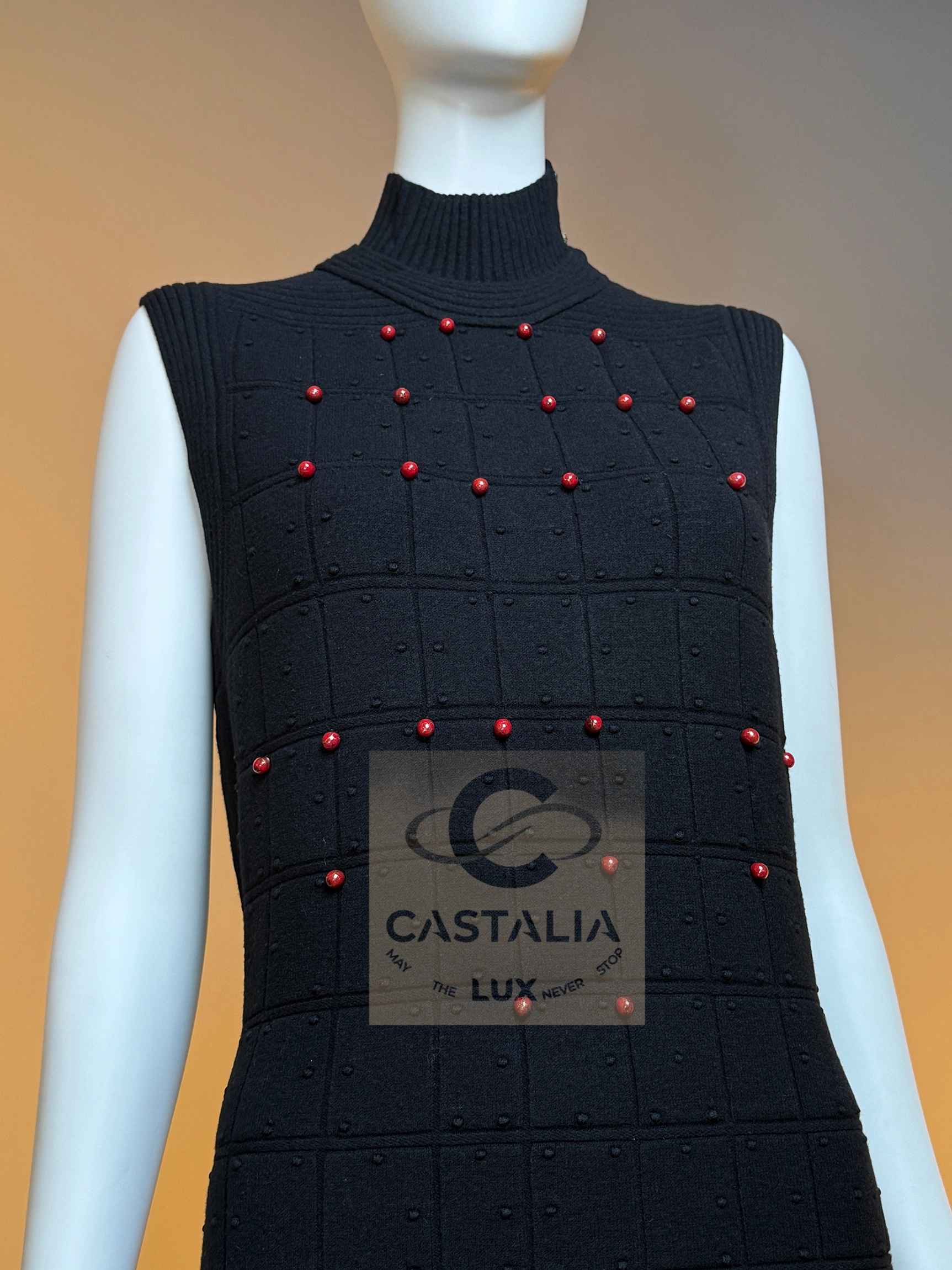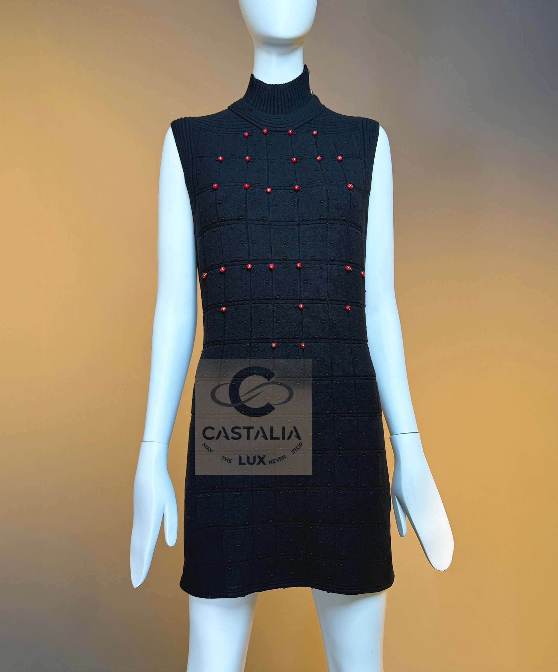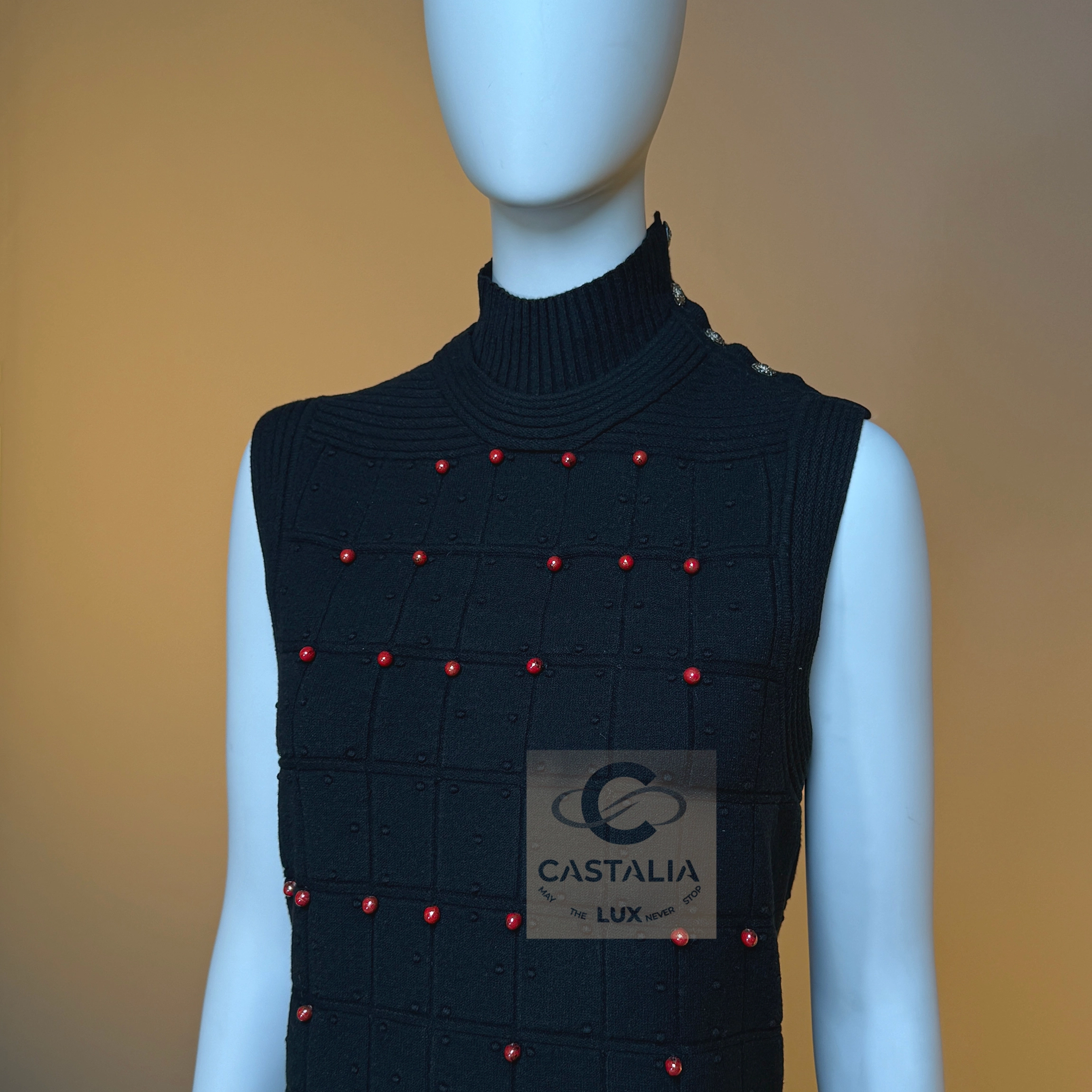 CHANEL Celestial Grid Dress with Jewel Embellishment ~ A rare and covetable artifact from the Paris / SHANGHAI Métiers d’Art collection by Karl Lagerfeld; ~ From the Runway to the house’s own advertising campaign, this dress holds the composure of a relic and the immediacy of couture // Size mark 40 FR / Condition: never worn // — architectural knit forms a perfect grid—each intersection a whisper of the maison’s codes — adorned by by the glint of Jewel, hand-painted crimson beads, like constellations pinned to a midnight sky — high ribbed collar is secured at the side by signature CC Gripoix jewel buttons—ornaments as much talismans—evoking the clasp of an imperial seal