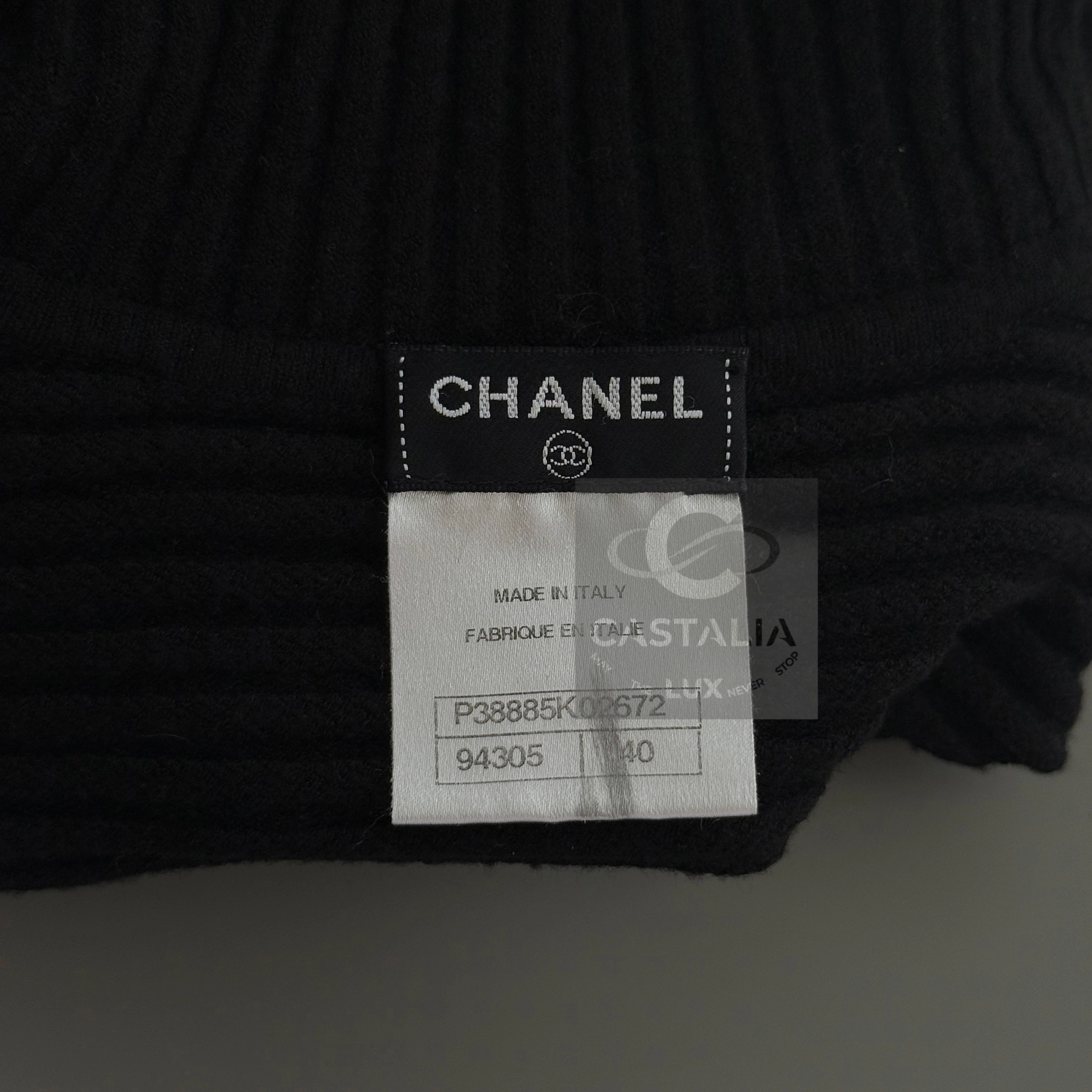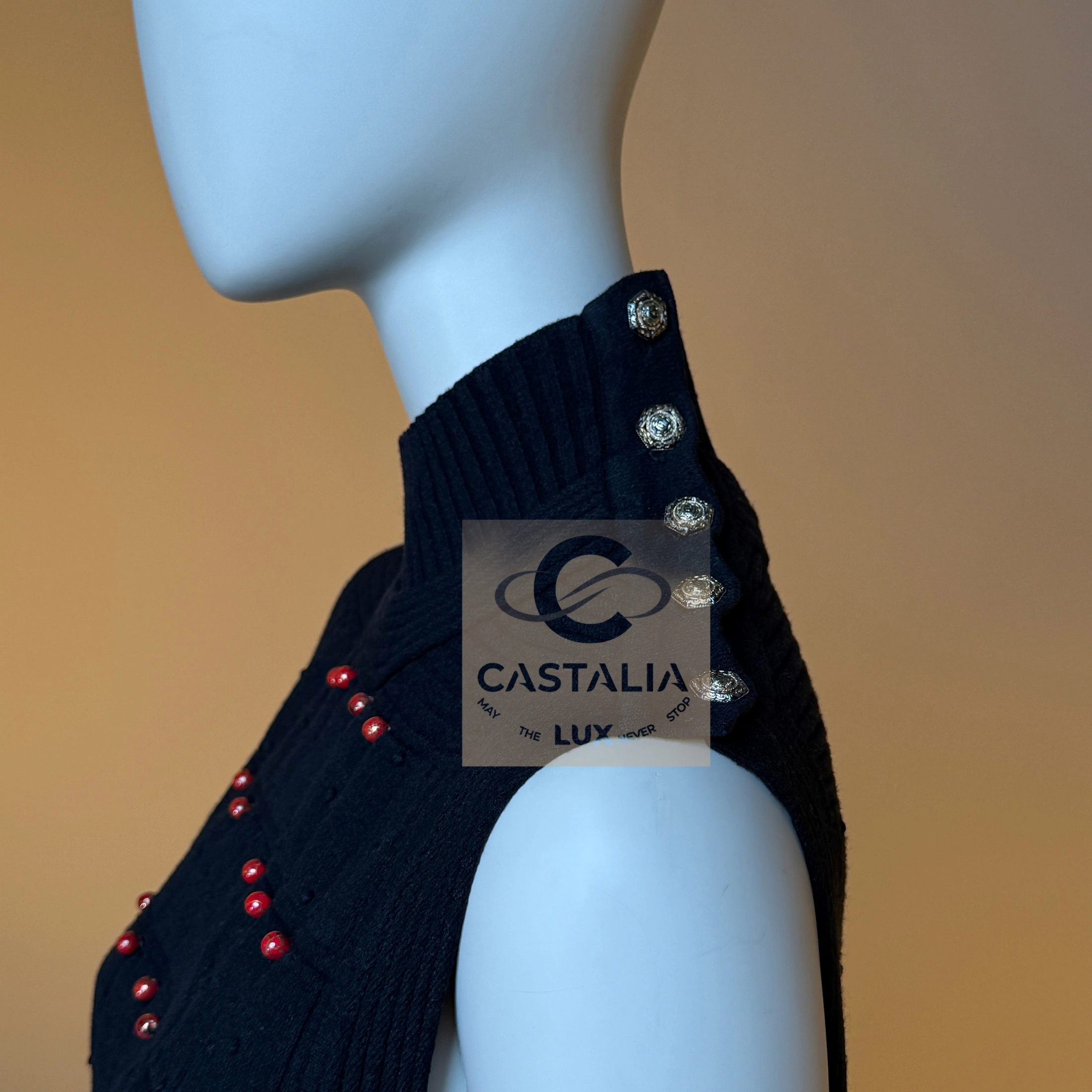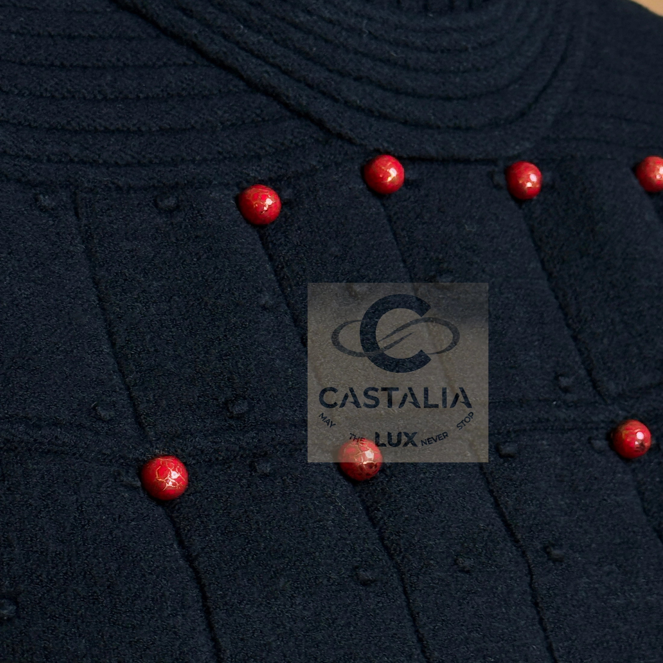 CHANEL Celestial Grid Dress with Jewel Embellishment ~ A rare and covetable artifact from the Paris / SHANGHAI Métiers d’Art collection by Karl Lagerfeld; ~ From the Runway to the house’s own advertising campaign, this dress holds the composure of a relic and the immediacy of couture // Size mark 40 FR / Condition: never worn // — architectural knit forms a perfect grid—each intersection a whisper of the maison’s codes — adorned by by the glint of Jewel, hand-painted crimson beads, like constellations pinned to a midnight sky — high ribbed collar is secured at the side by signature CC Gripoix jewel buttons—ornaments as much talismans—evoking the clasp of an imperial seal
