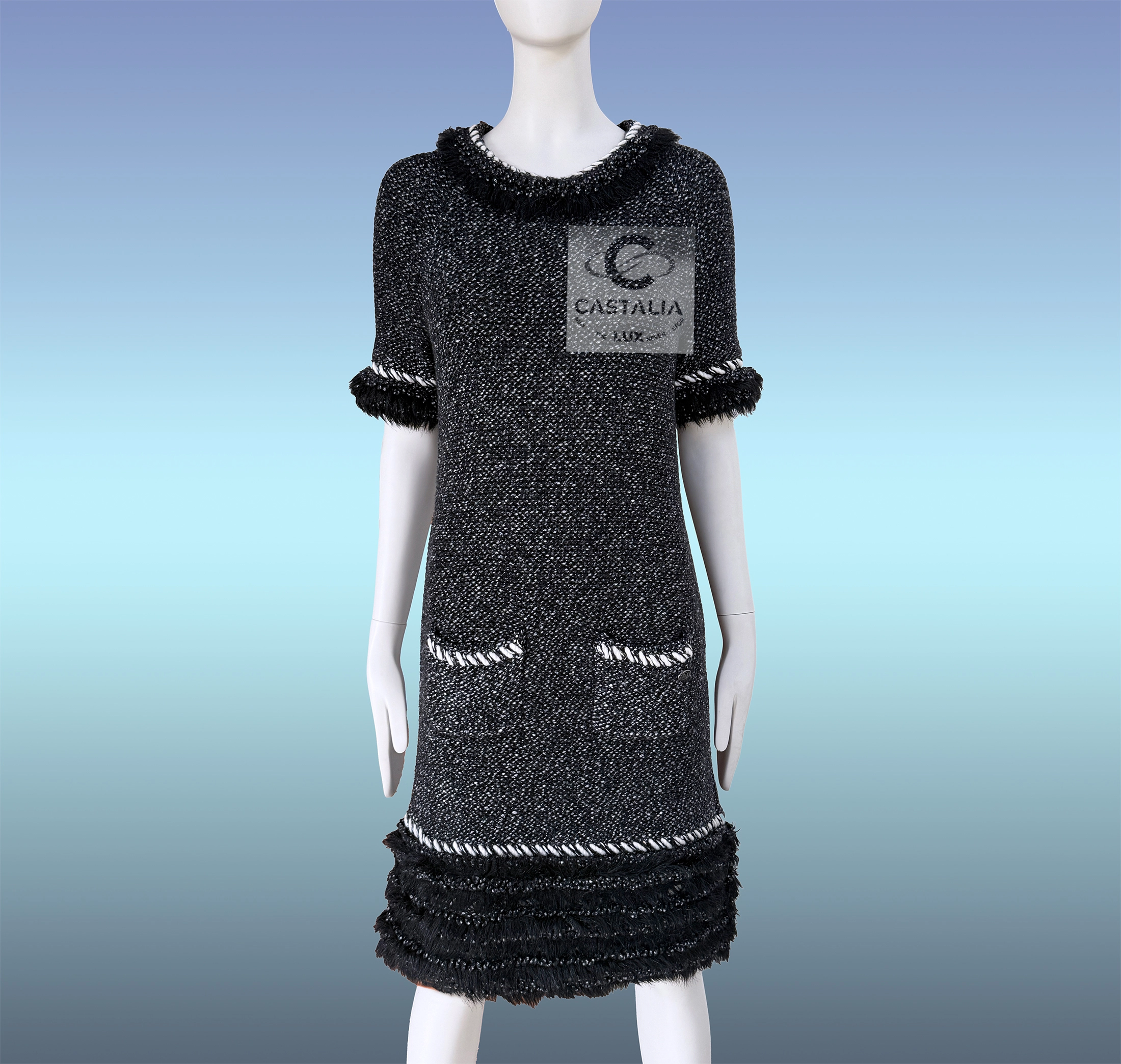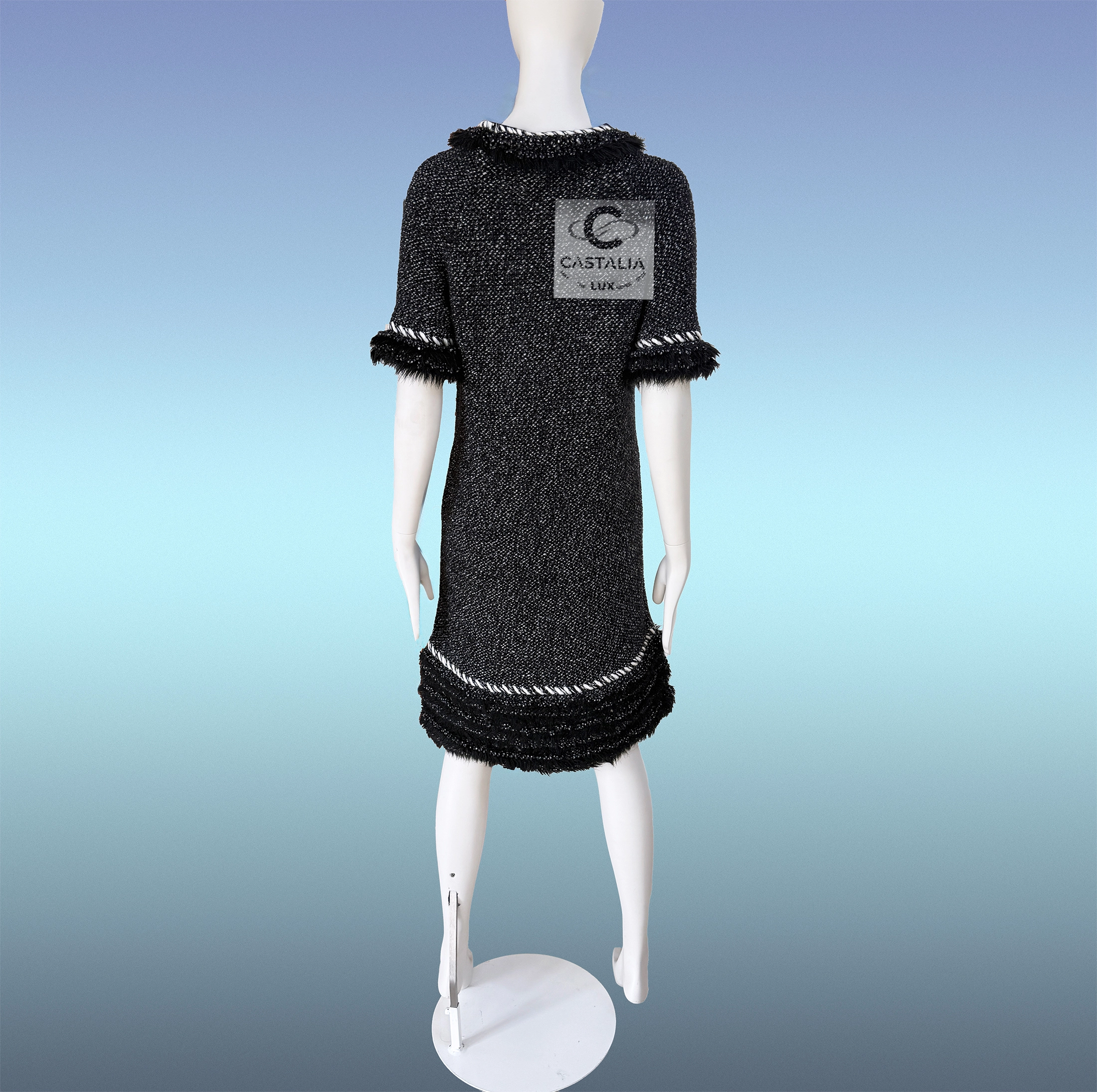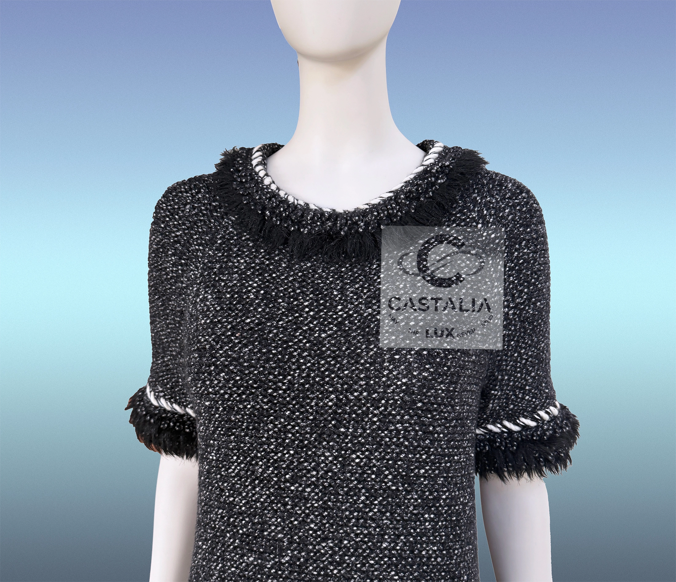 CHANEL Fall 2010 — From the “Arctic Ice” Runway by Karl Lagerfeld ~ Graphite Cashmere Dress with Fantasy Fur Accents this graphite-toned cashmere dress evokes both glacial elegance and hearthside warmth ~ A dress not made for seasons, but for epochs. A relic of Lagerfeld’s polar dream, sculpted for the connoisseur of Chanel myth and form // Size mark 40 FR / Condition: never worn // — The silhouette—sleek yet softly sculpted—wraps the form with elemental grace, like a myth written in twilight — Fringed fantasy fur halos the cuffs, hem, and collar like auroral drift — a delicate CC-logo jewel charm glints at the pocket—a talisman of house mystique — The texture hums with quiet power, as if snow itself had been woven into thread