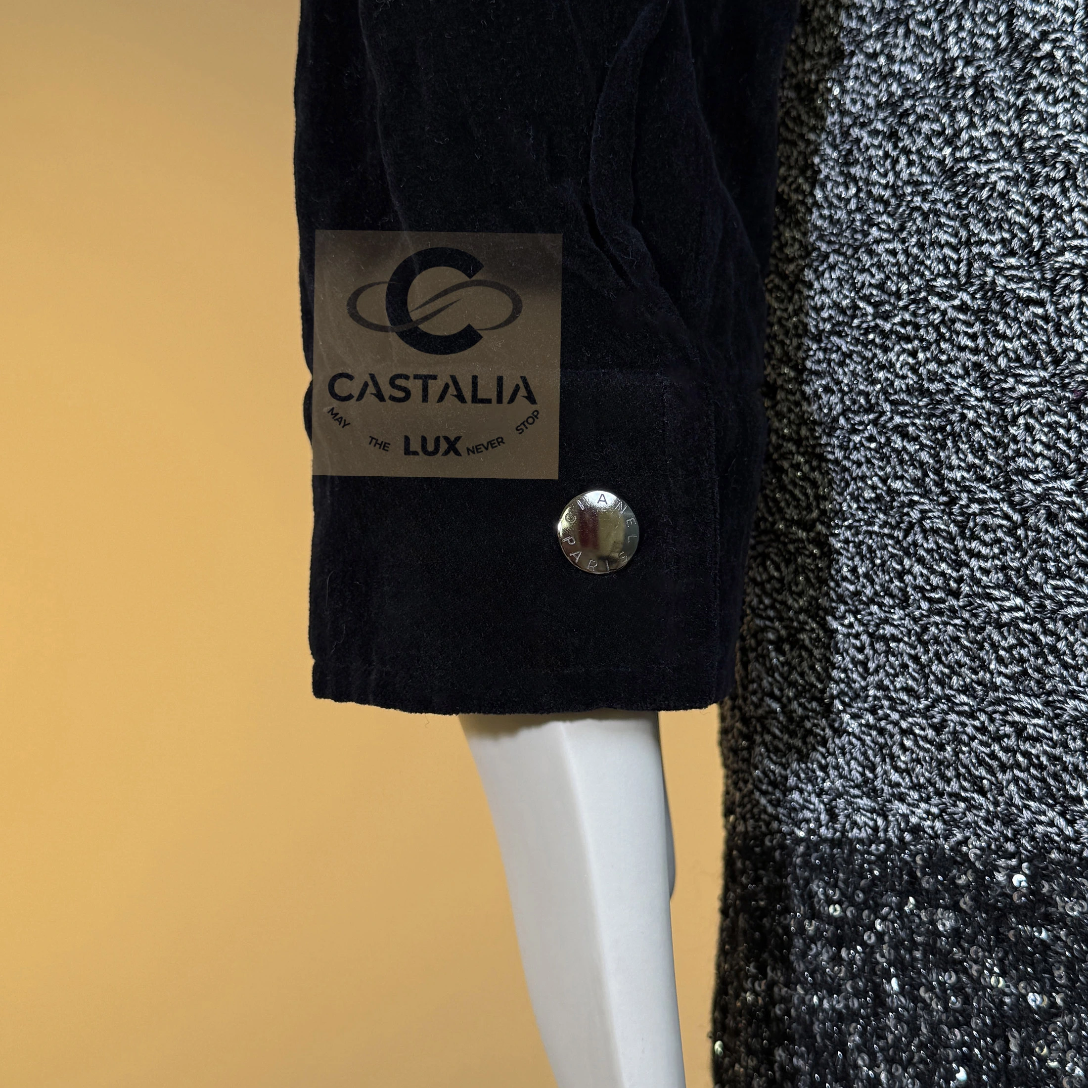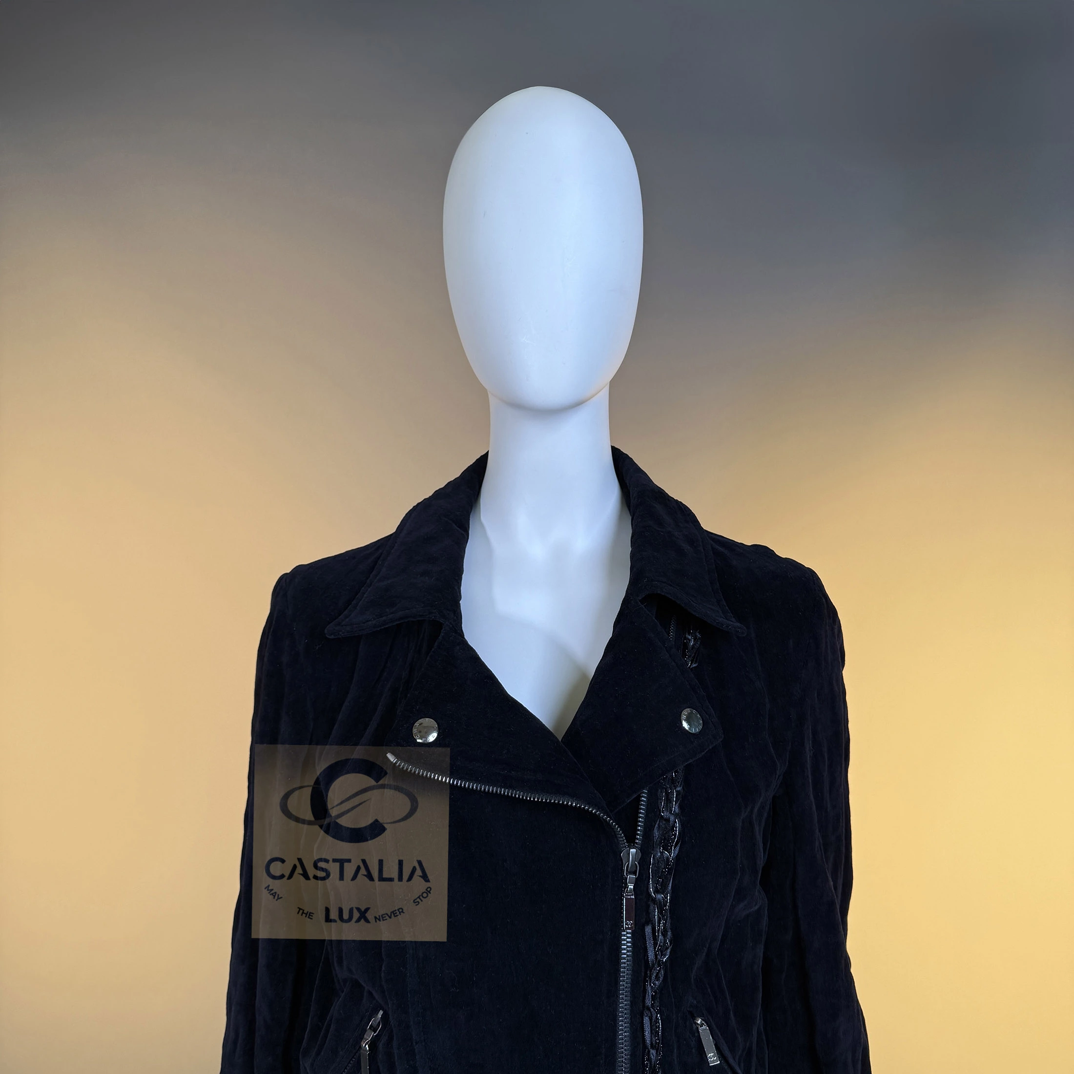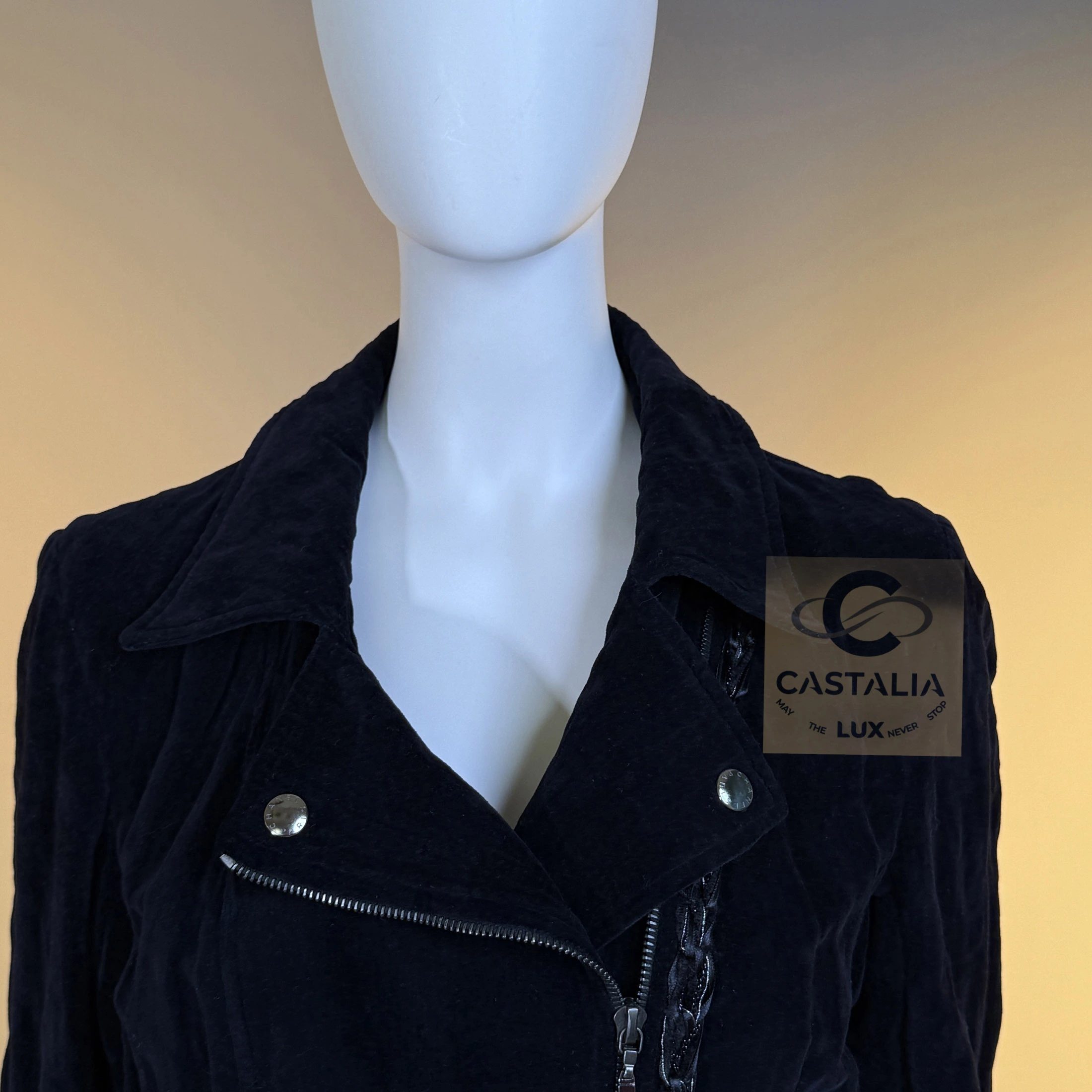 — Cut in sumptuous black velvet, it carries the silhouette of a biker jacket transfigured into couture — sharp lapels, sculptural shoulders, and the urban edge of asymmetry