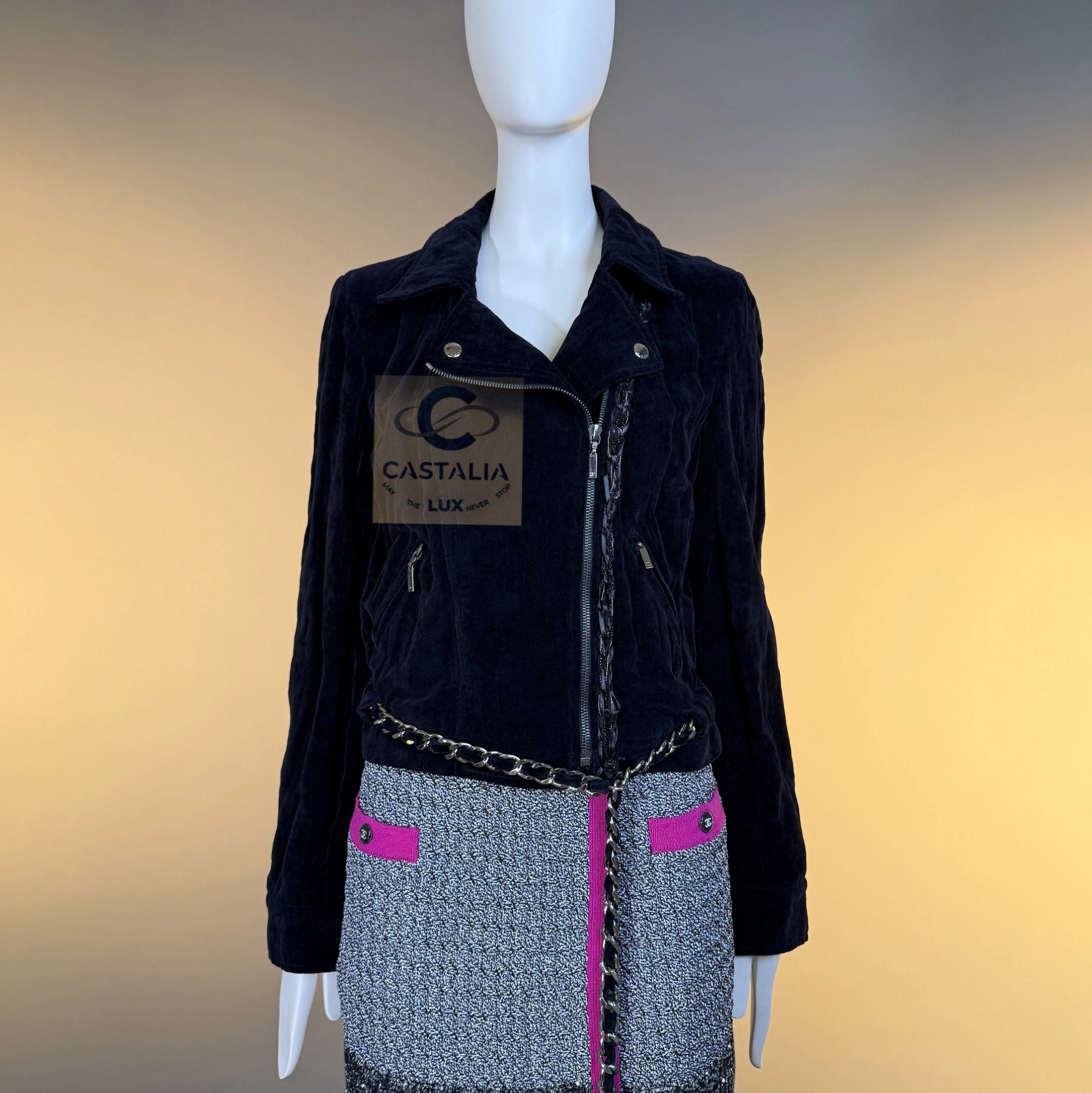 CHANEL Rare Black Velvet Biker Jacket with Chain Link Belt —