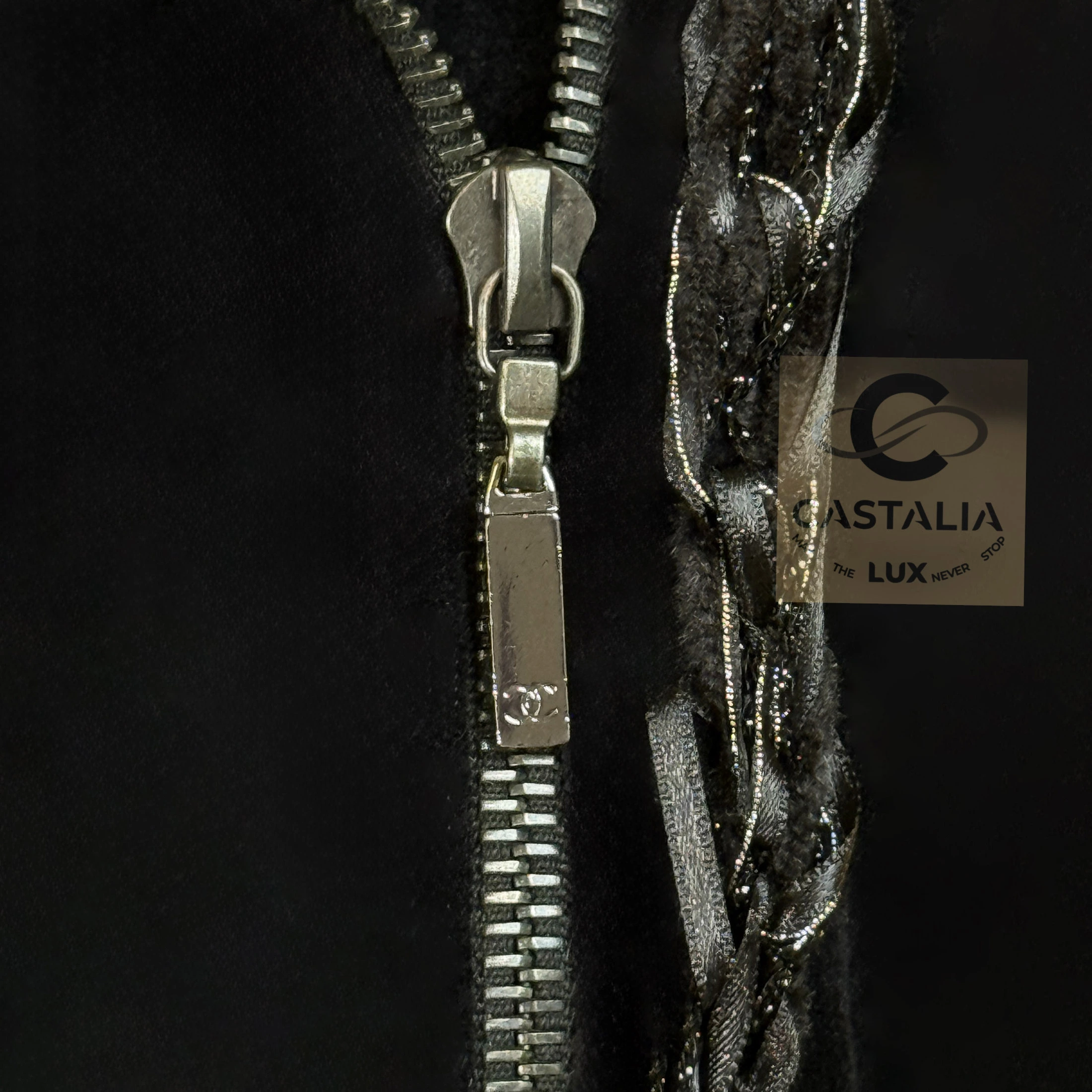 — A chain-link belt entwines the hem, silver against black, echoing Chanel’s eternal codes yet reborn in a rebellious key