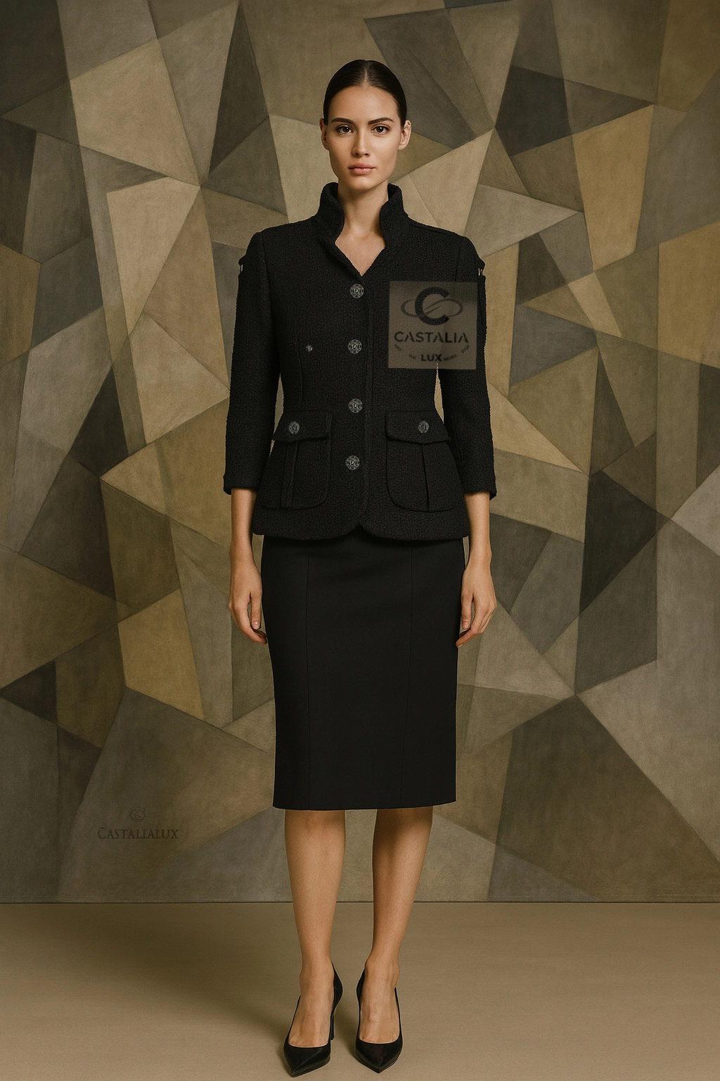— At the shoulders and cuffs, engraved CHANEL buckles gleam — a subtle echo of armor transfigured into couture