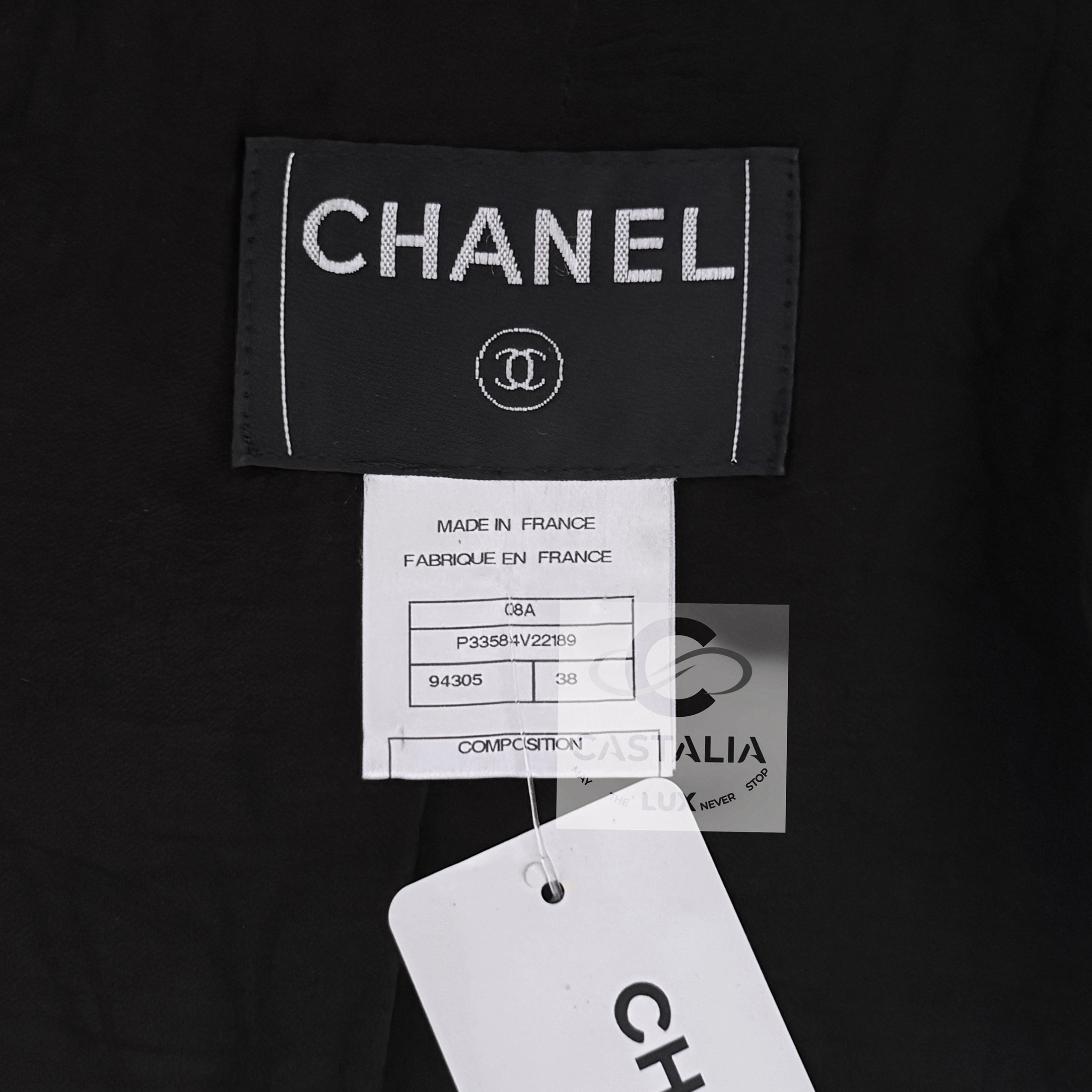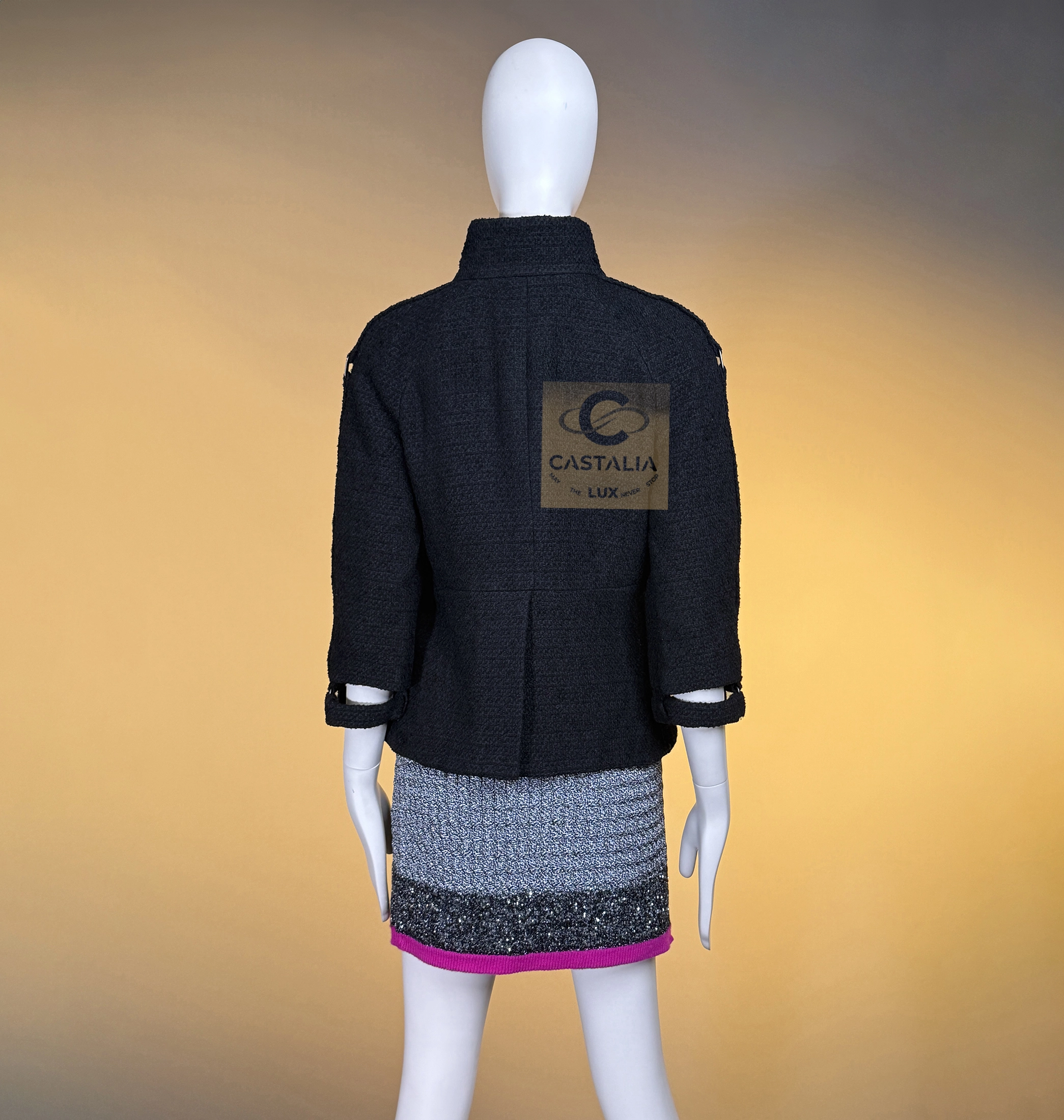 CHANEL · Black Quilted Tweed Jacket Legendary Spring 2008 Collection by Karl Lagerfeld — As seen on Supermodel Natalia Vodianova on Runway — ~ A true collector’s rarity — a fragment of Chanel’s eternal mythology— It is at once relic and shield, an eternal fragment of runway history consecrated in tweed // Size mark 38 FR / Condition: never worn, with tag // — Woven in Chanel’s signature tweed, its surface is etched with a diamond-quilted geometry, each line a quiet script of order and permanence — CC jewel buttons, framed in shield-like casings, anchor the garment as emblems of the Maison’s authority — At the shoulders and cuffs, engraved CHANEL buckles gleam — a subtle echo of armor transfigured into couture — The black silk lining within remains a private sanctuary, a whisper of softness beneath the discipline of the exterior