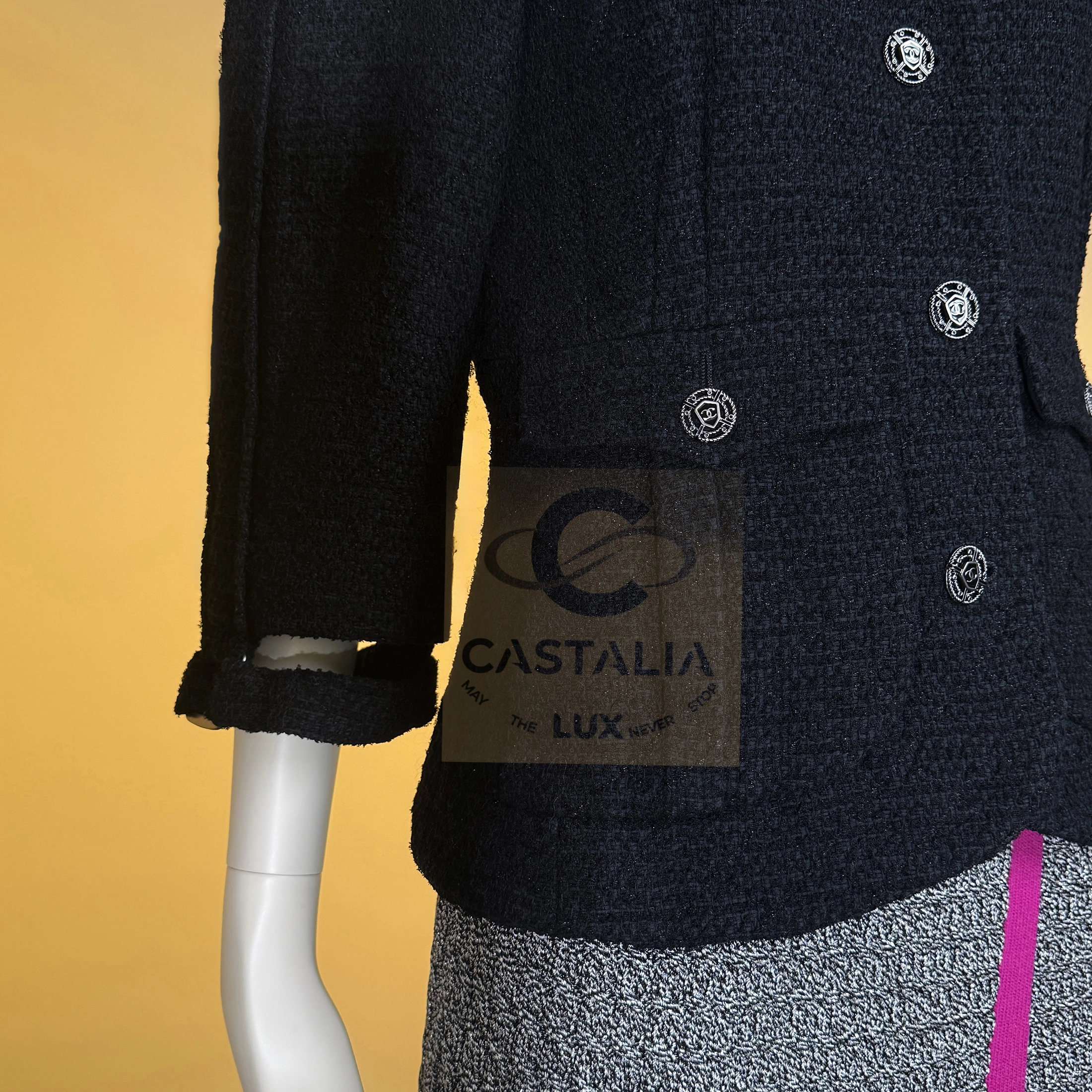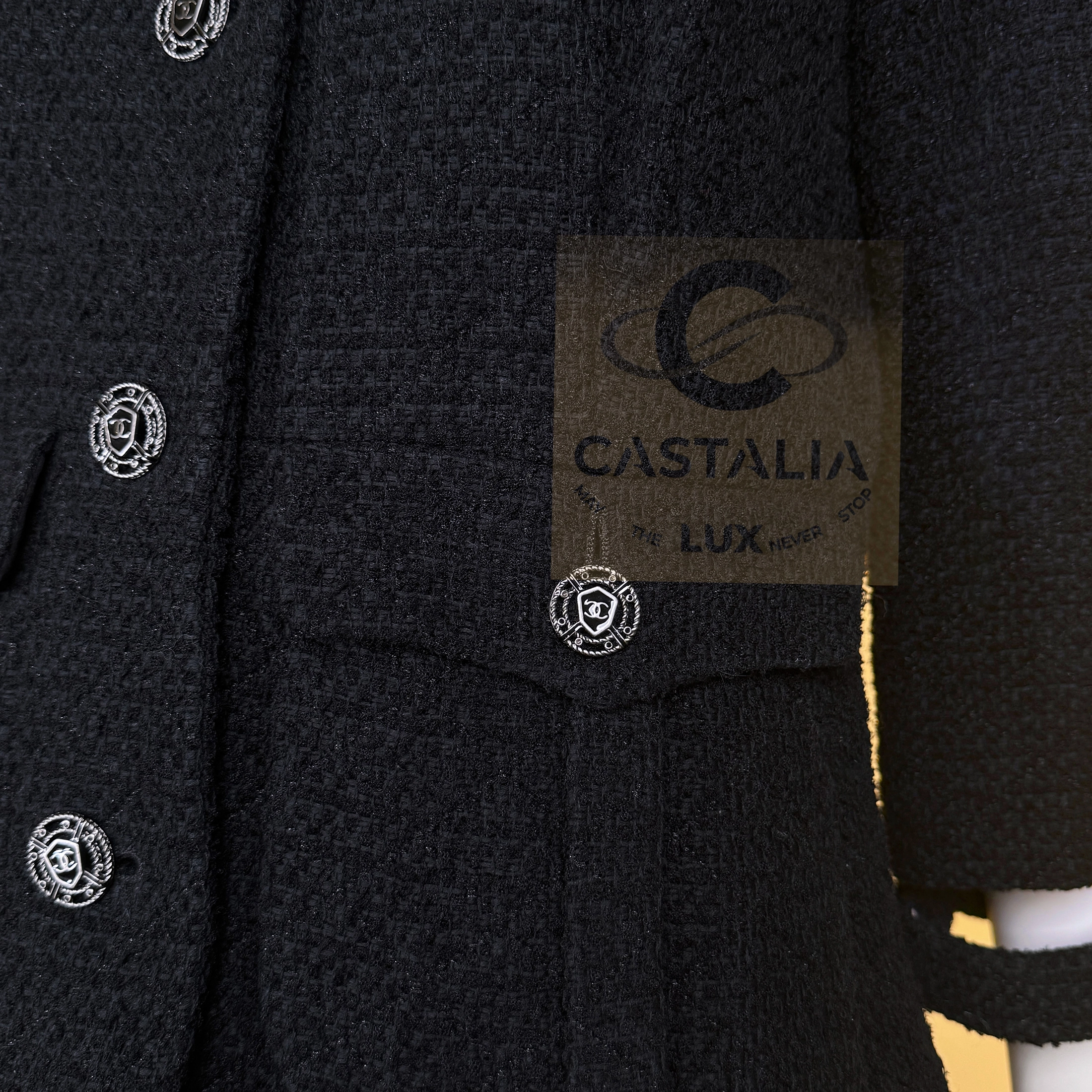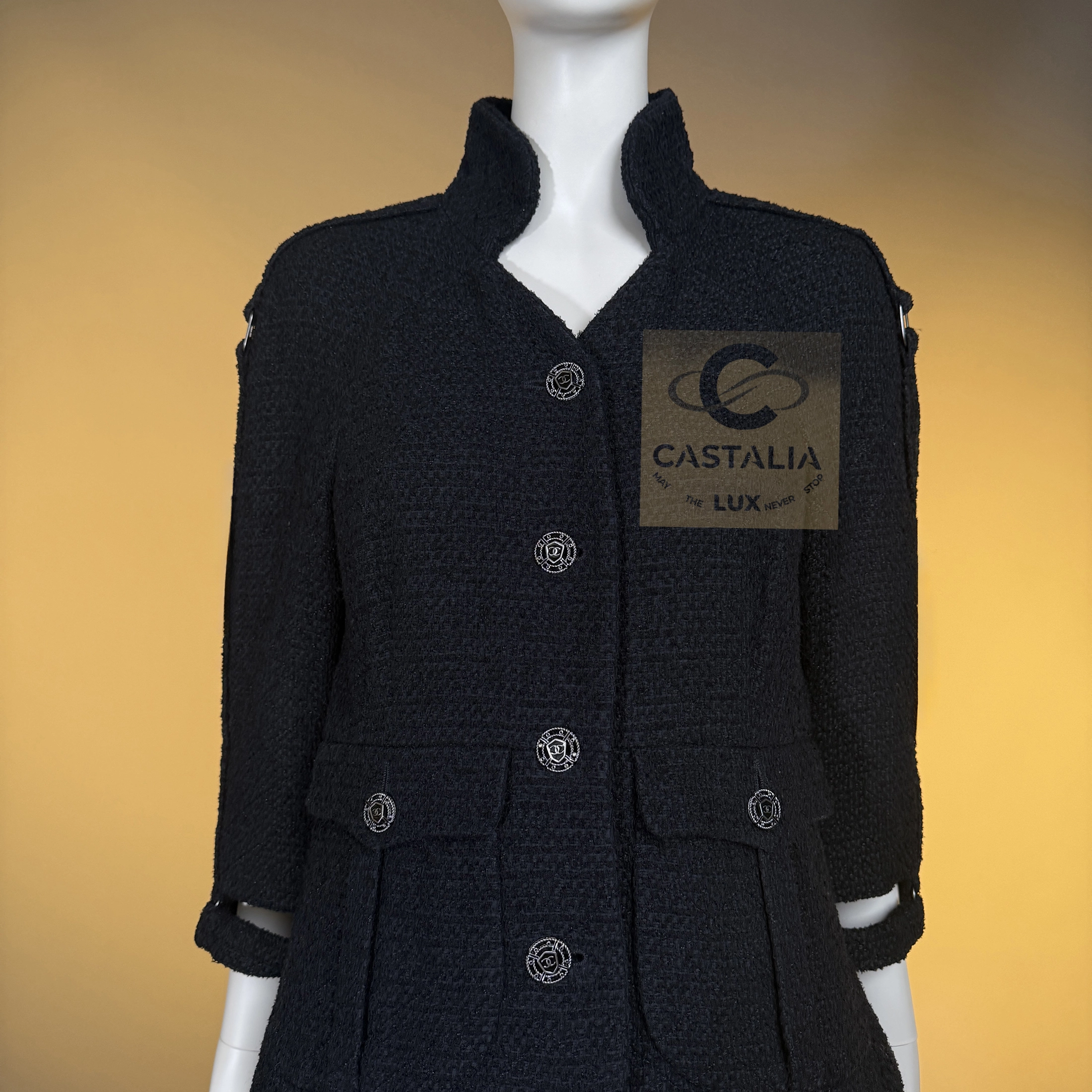 — CC jewel buttons, framed in shield-like casings, anchor the garment as emblems of the Maison’s authority