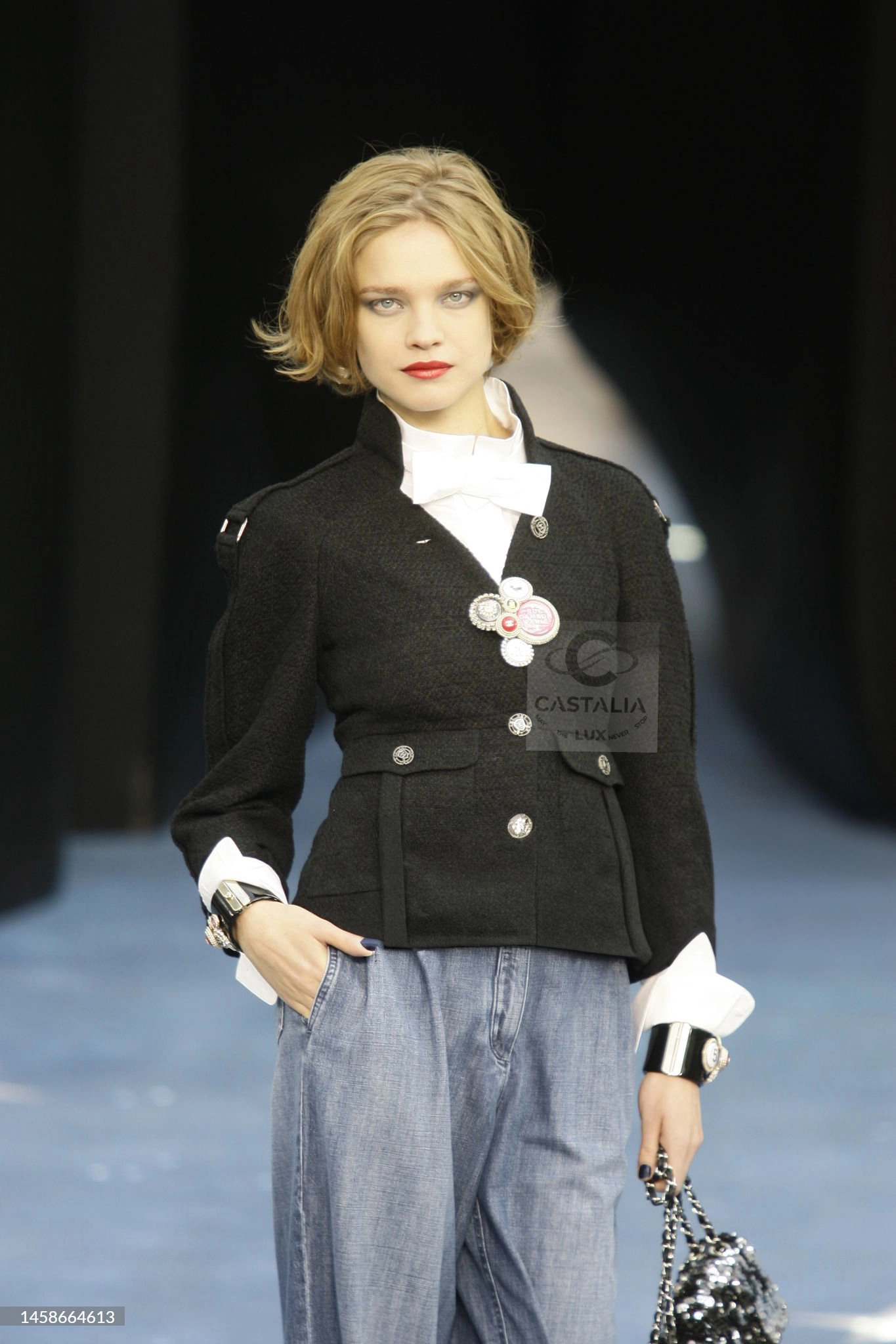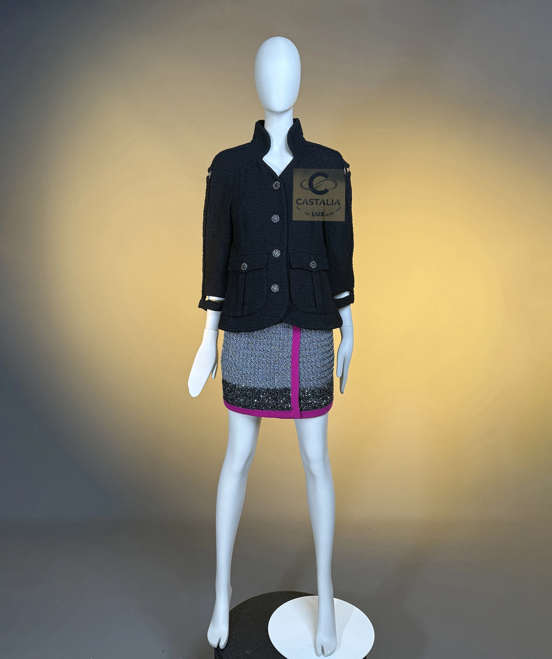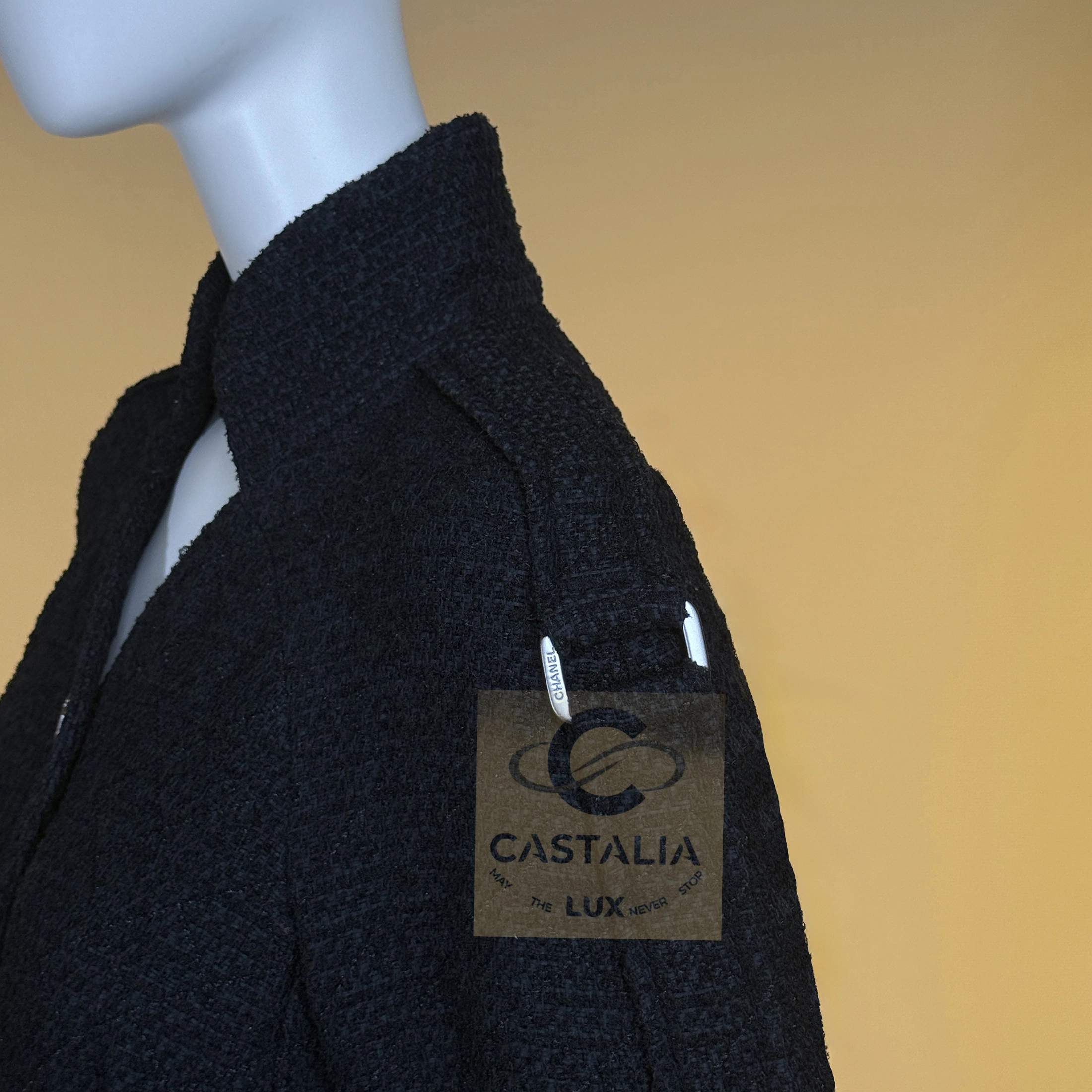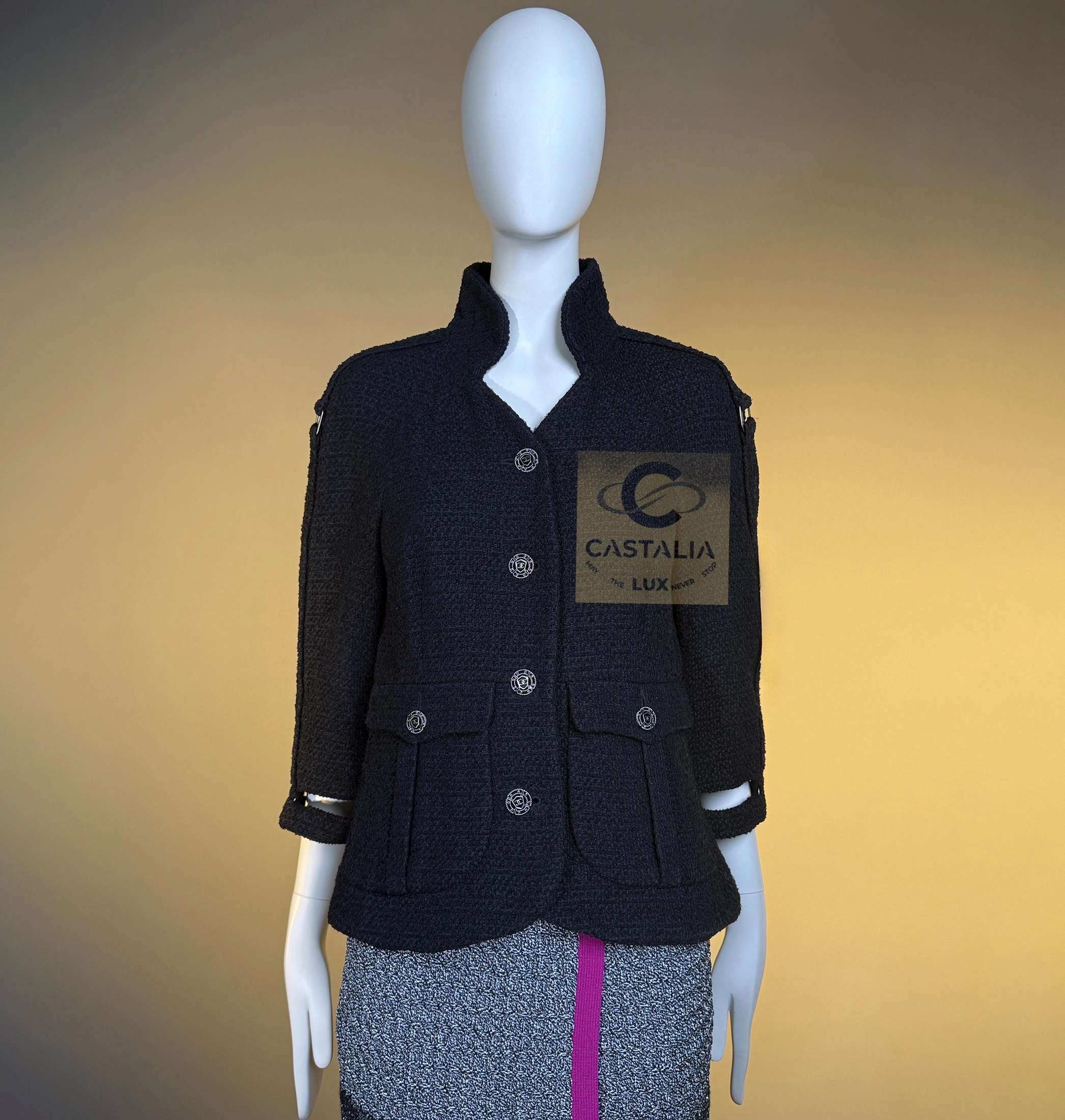 — CC jewel buttons, framed in shield-like casings, anchor the garment as emblems of the Maison’s authority
