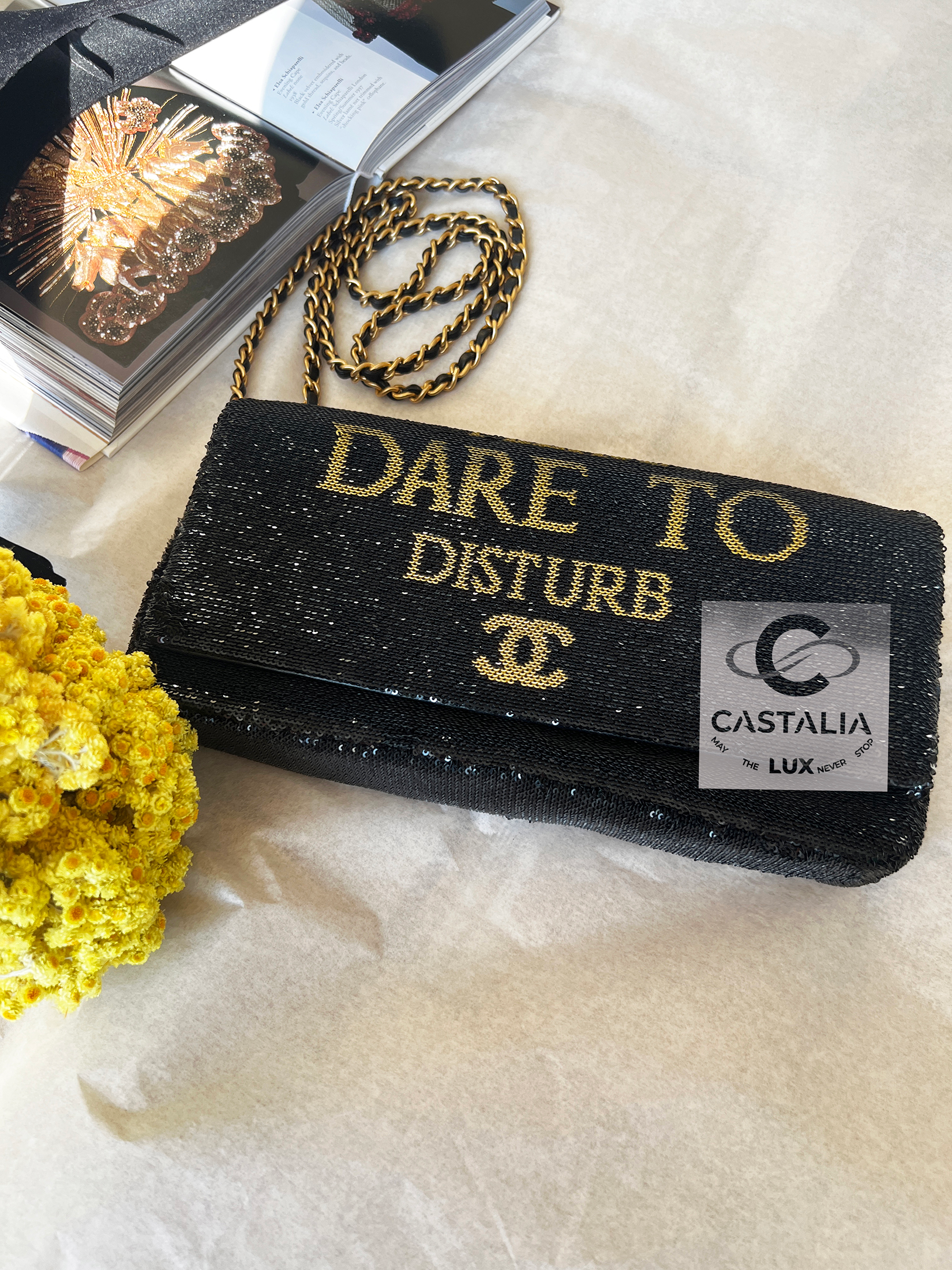 Collectible “DARE TO DISTURB” Black Sequin CC Logo Flag Bag