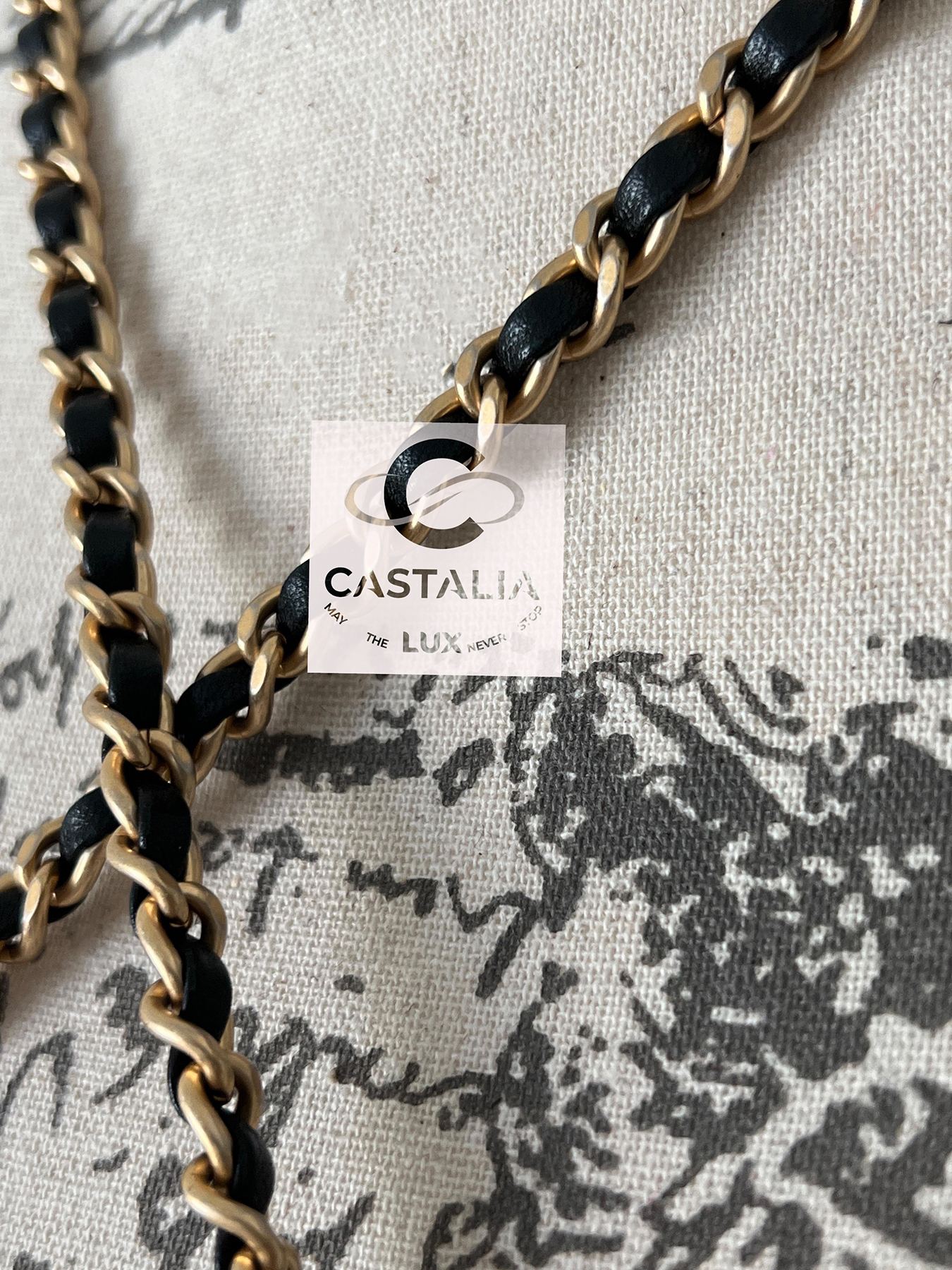 — A brushed gold-tone chain intertwined with black leather allows it to be worn crossbody or on the shoulder — half armour, half ornament