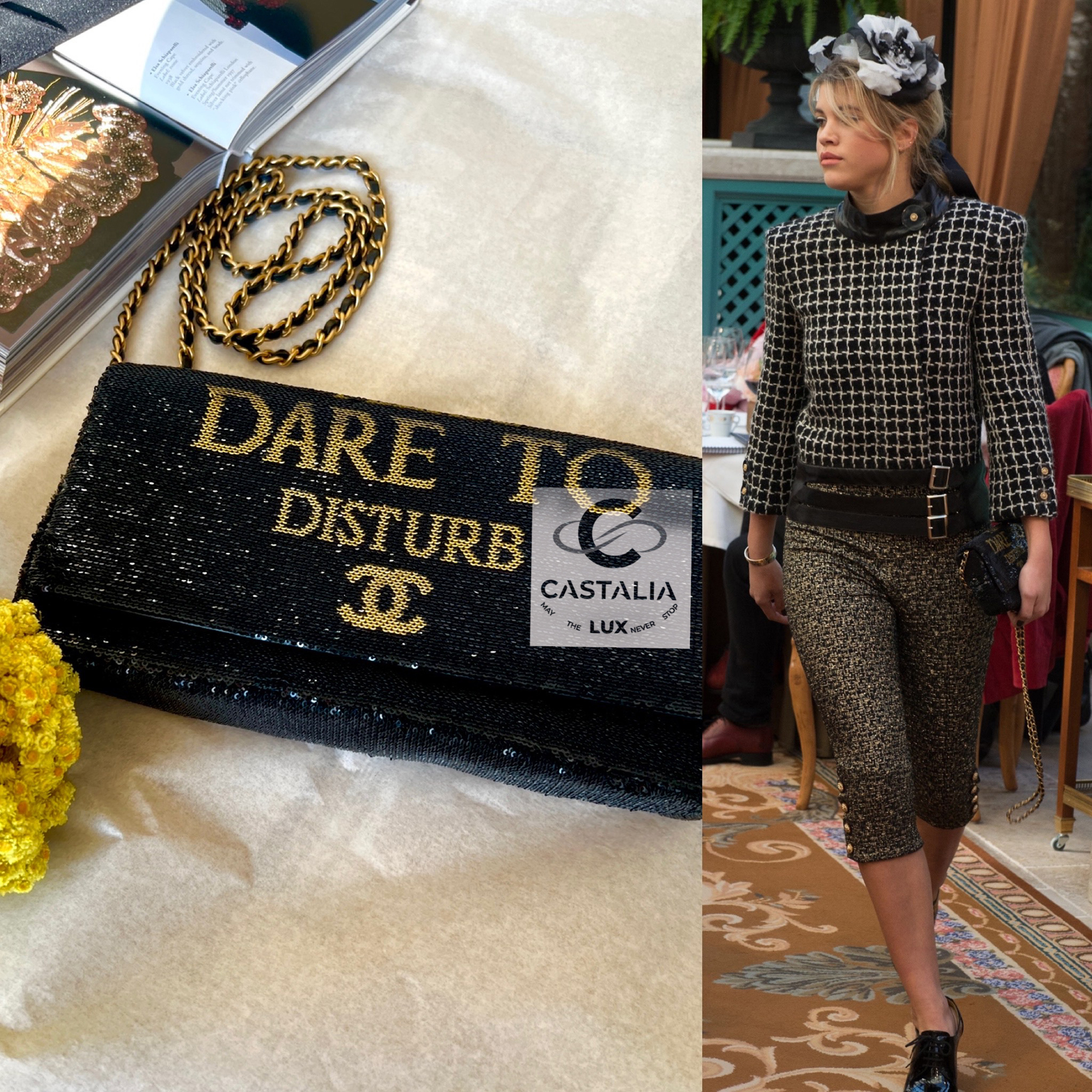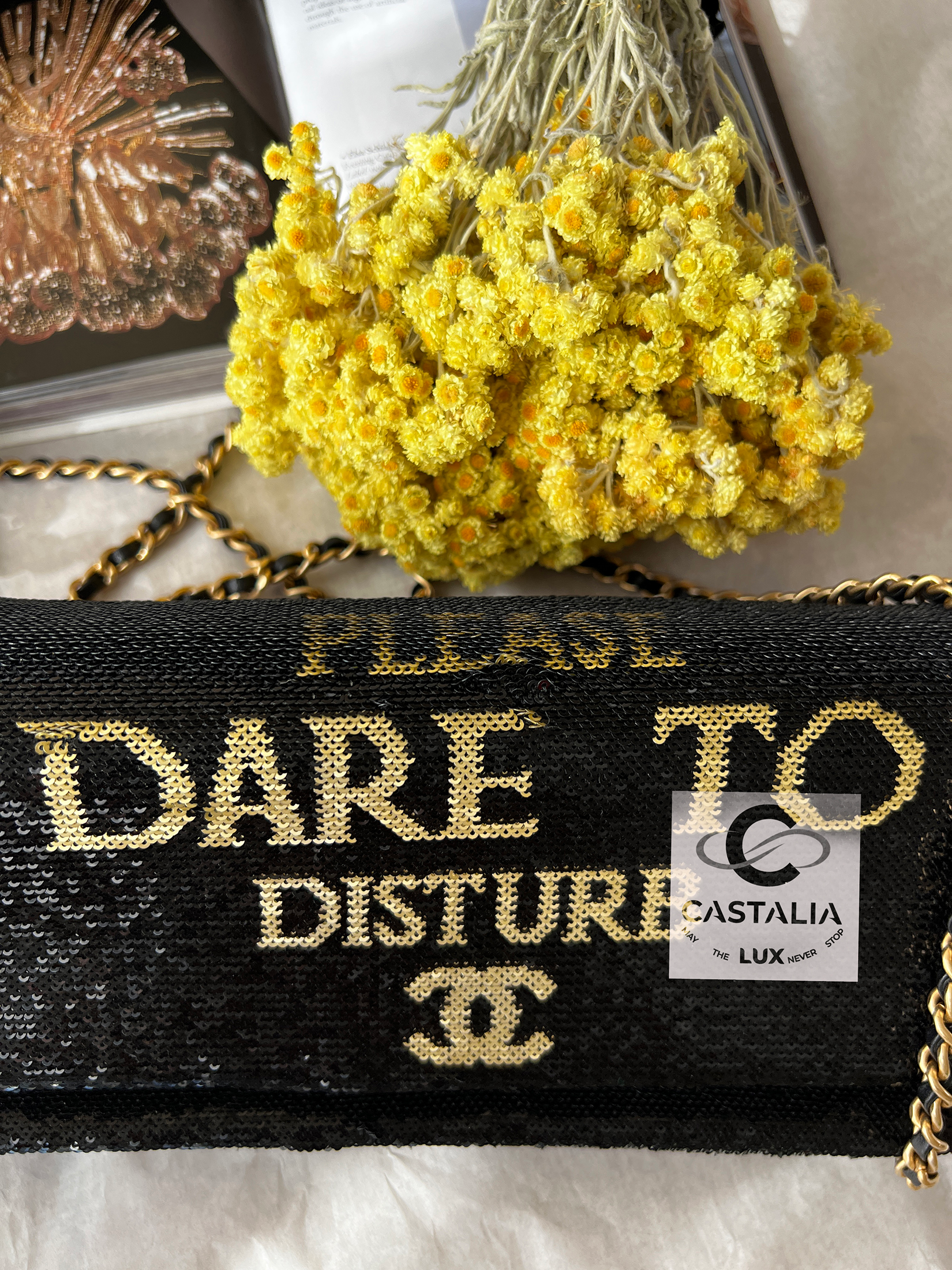— The front proclaims its manifesto — “DARE TO DISTURB” — beneath which the CC logo glows like a subversive seal of elegance