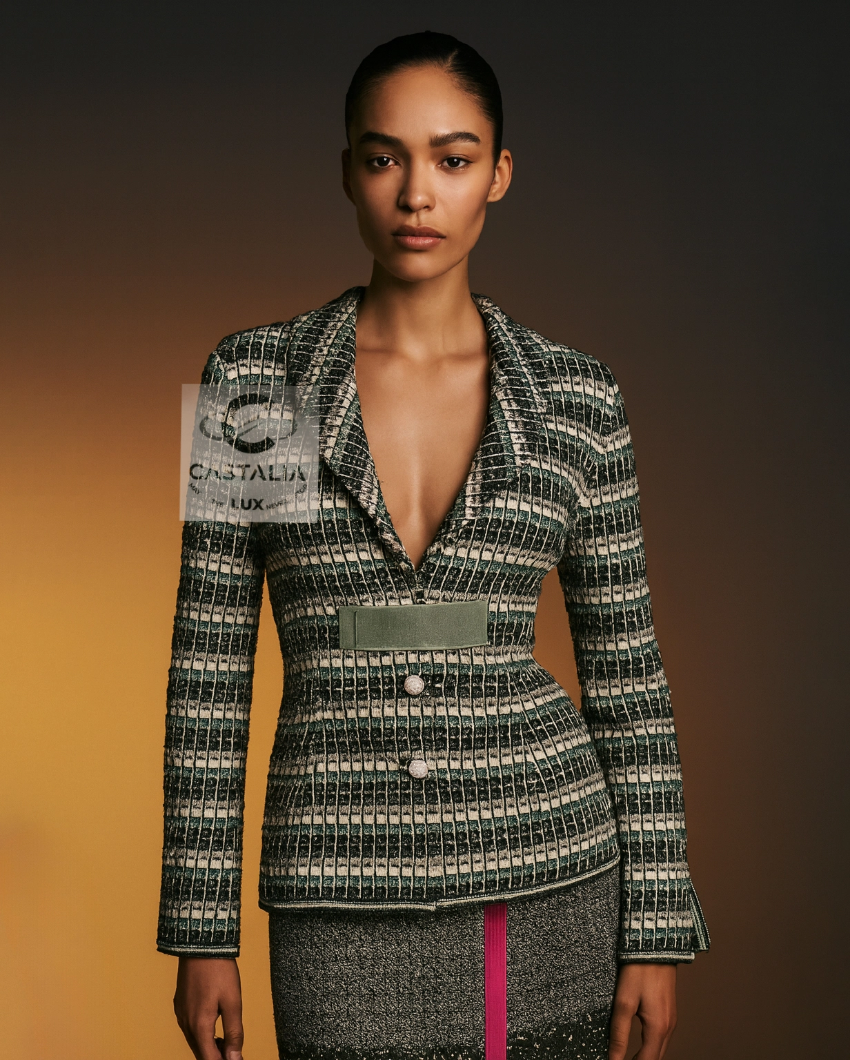 — a precious silk-blend tweed engineered with shimmering metallic matter, flickering like digital light