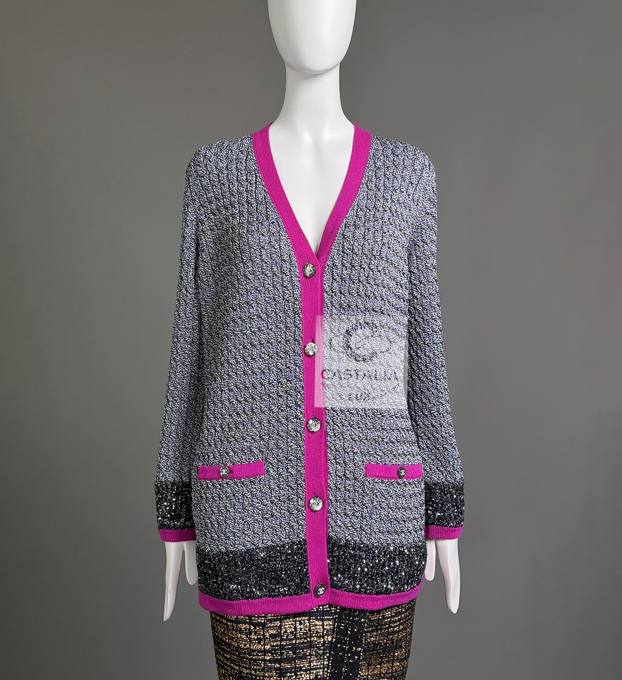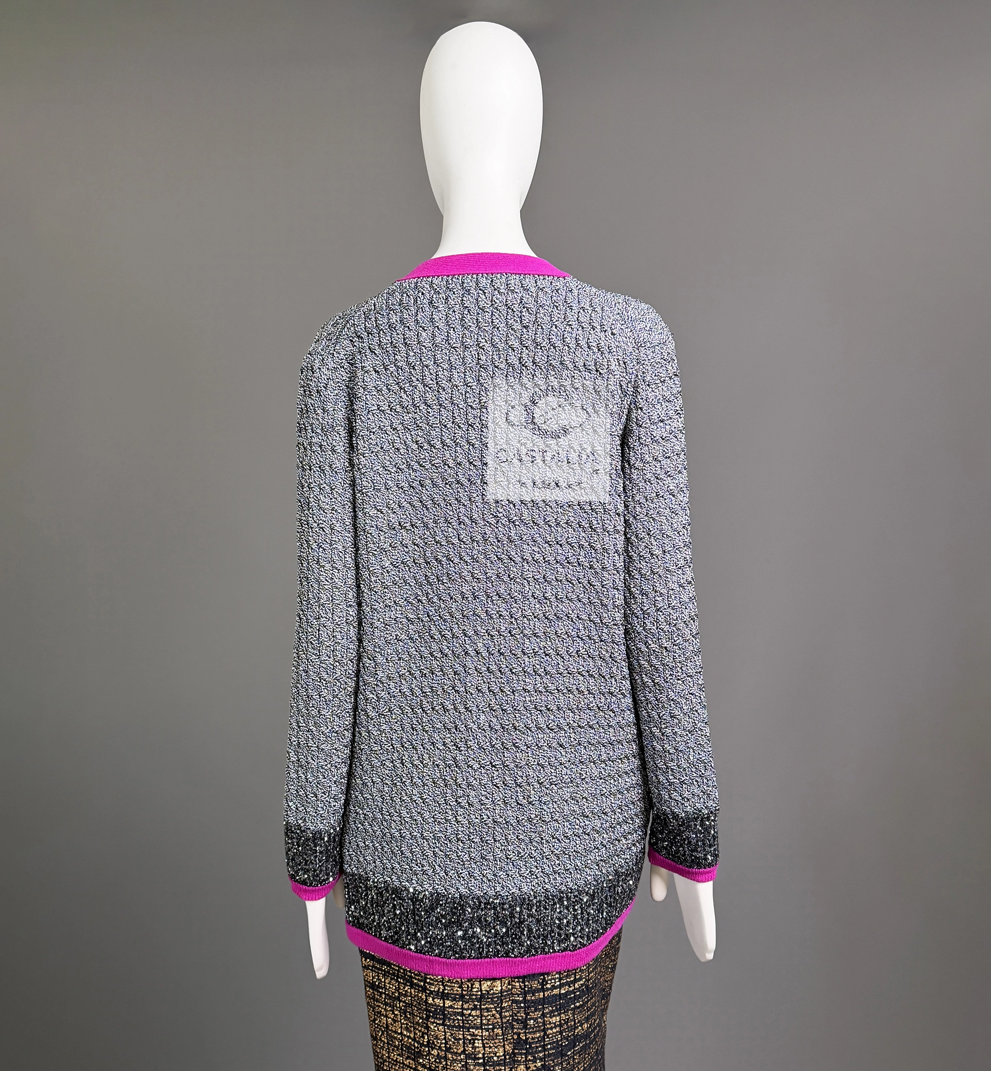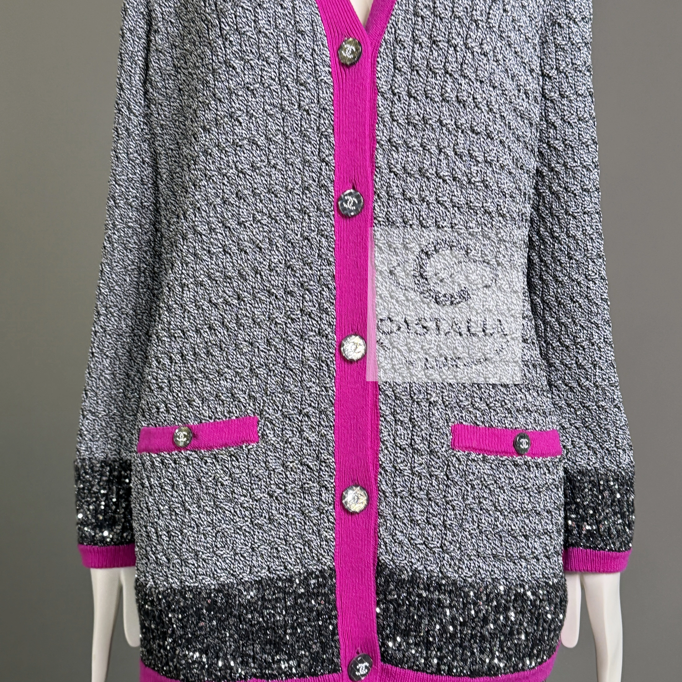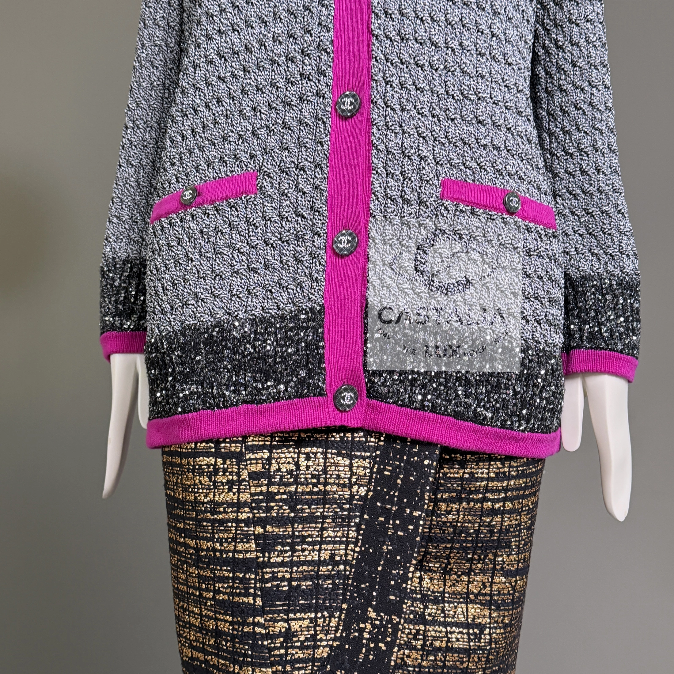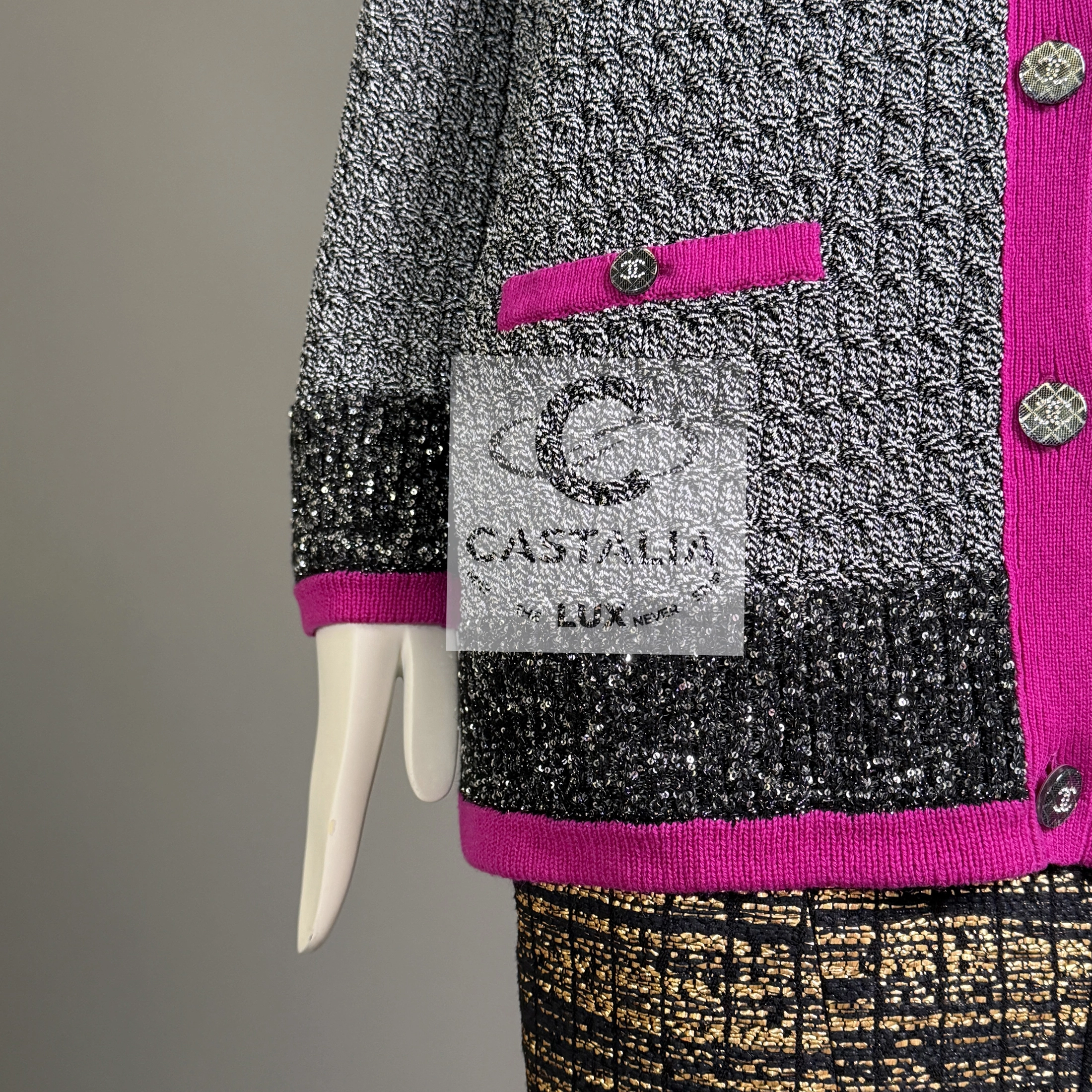 CHANEL Iconic Knit Cardigan with Sequin Embellishment — Runway Fall/Winter 2021 by Virginie Viard ~ Boutique value: Cardigan $5,820 ~ Seen on Jenny Kim and gracing magazine covers, the look fuses youthful energy with the refined sensuality of Chanel’s knit mastery ~ A collector’s relic of Chanel’s new modernity — a relic of Viard’s quiet revolution — poised at the intersection of knit, jewel, and myth // Size mark 40 FR / Condition: never worn // — Crafted from a steel-gray shimmering knit hand-embroidered with infinitesimal sequins, the fabric catches light like stardust in motion — fuchsia trim delineates its architecture — vibrant yet disciplined — creating a chromatic dialogue between shadow and radiance — Each CC Gripoix button, encircled with strass, gleams like a small cosmos sealed in crysta