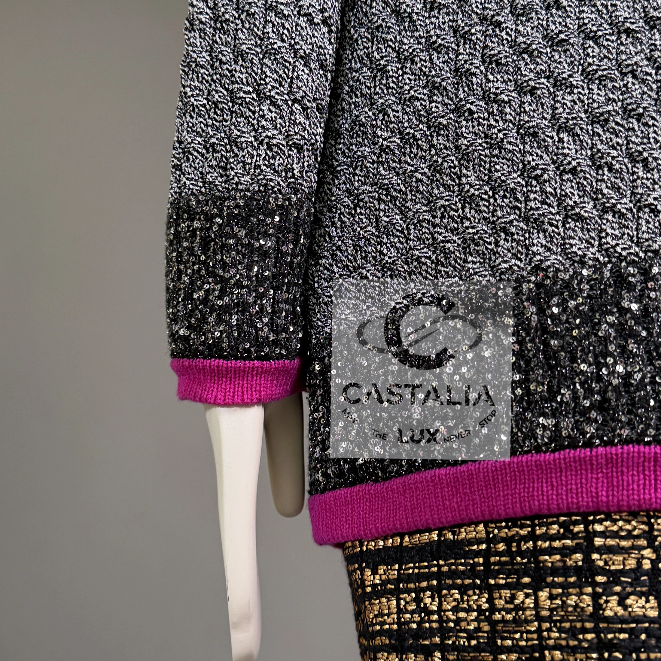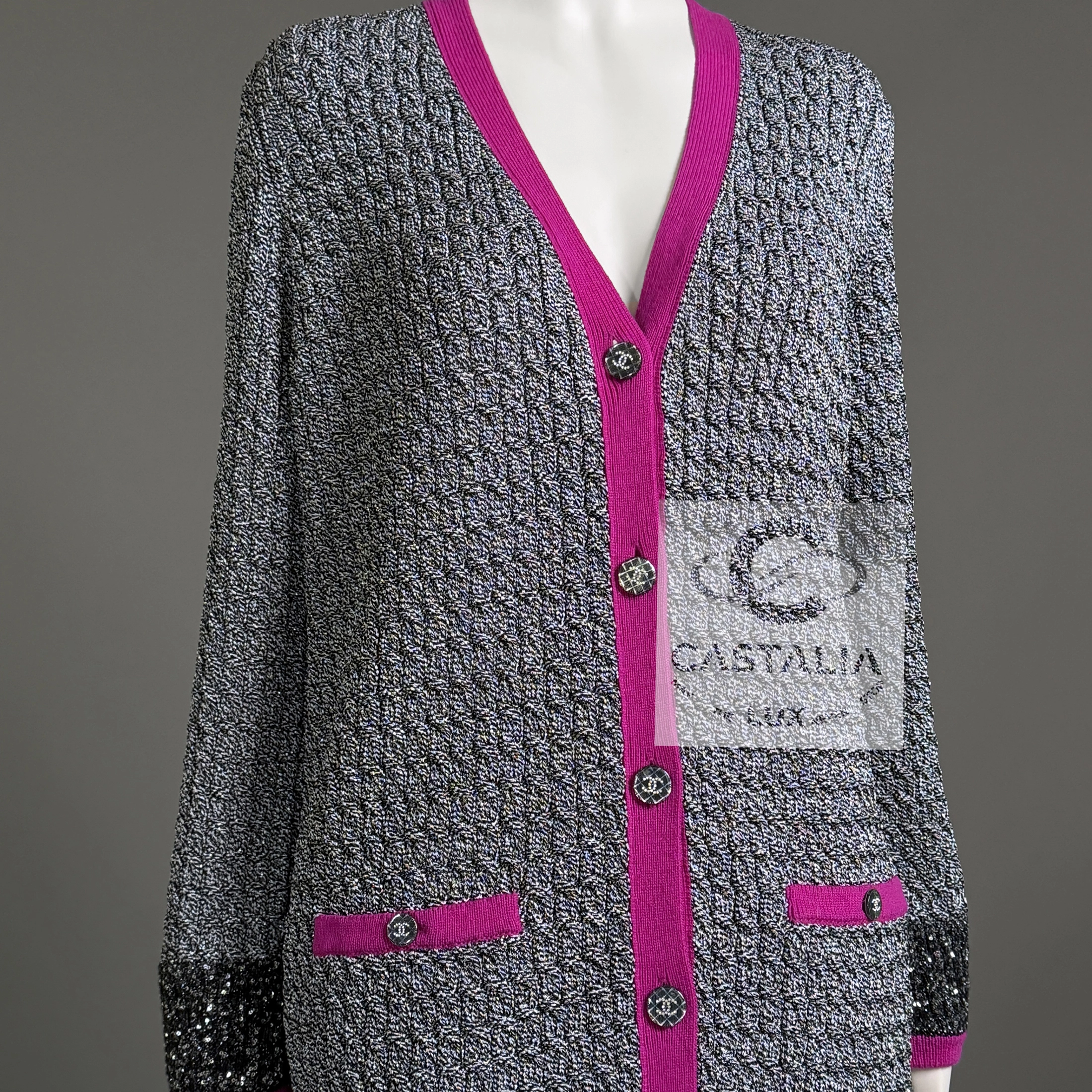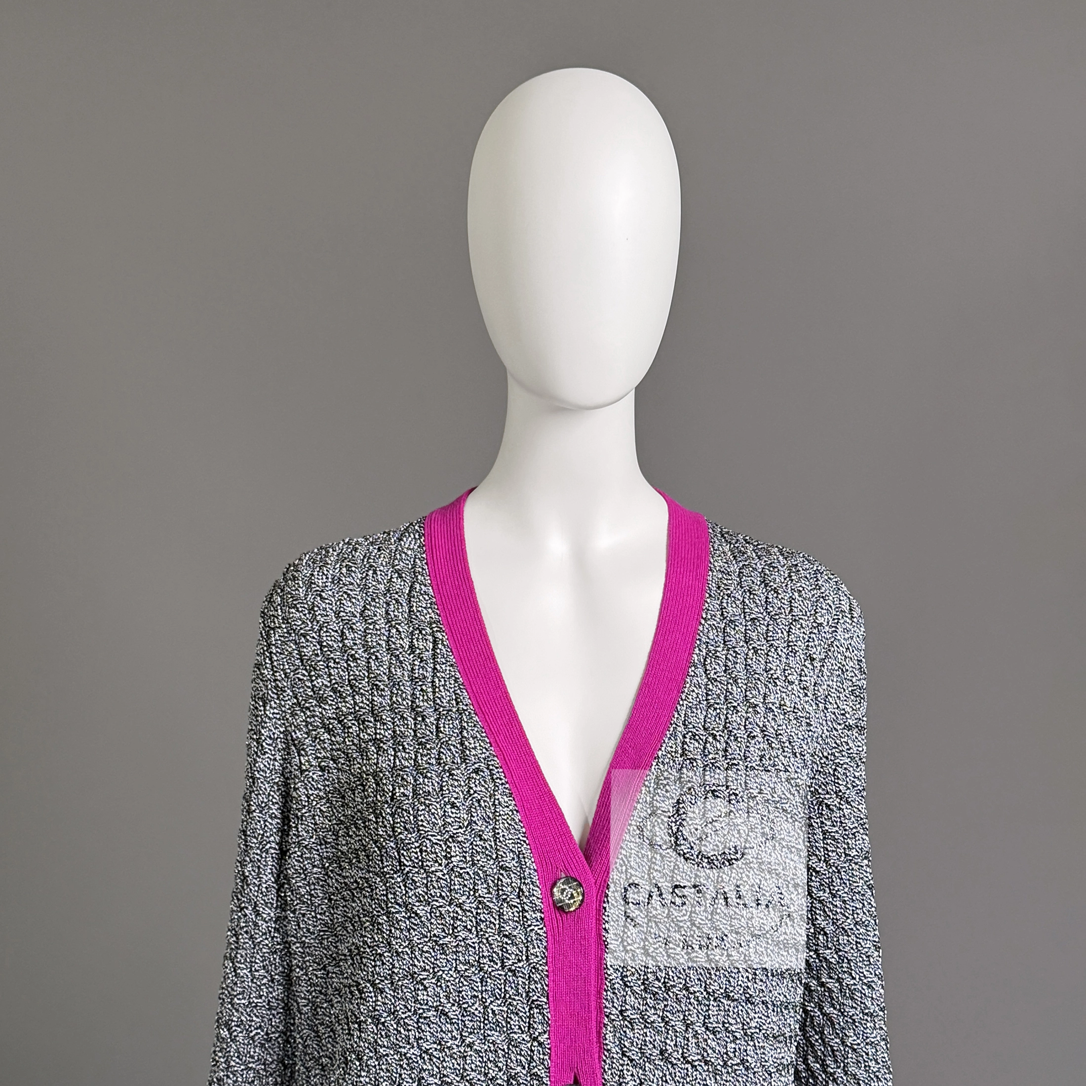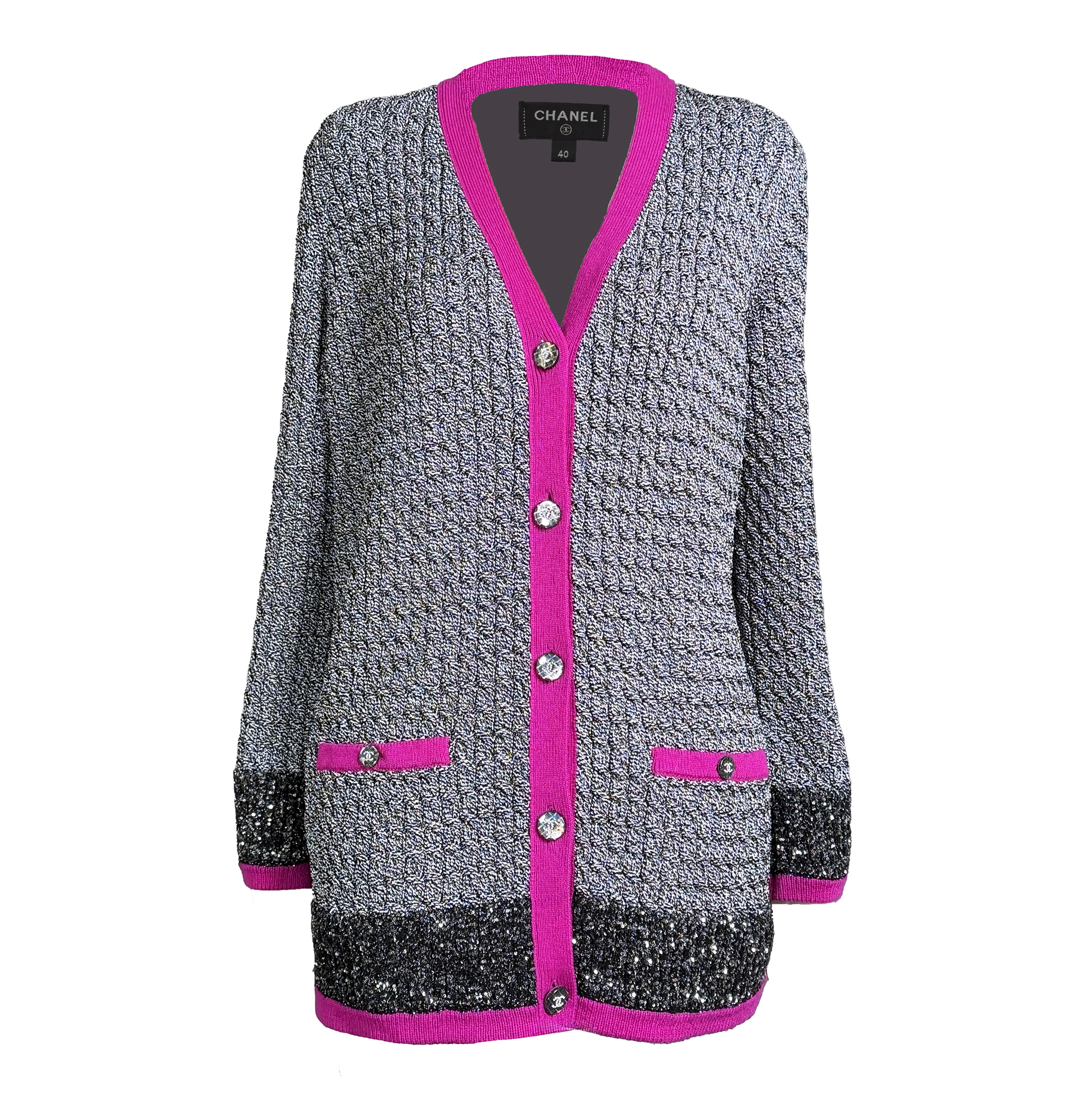 CHANEL Iconic Knit Cardigan with Sequin Embellishment — Runway Fall/Winter 2021 by Virginie Viard ~ Boutique value: Cardigan $5,820 ~ Seen on Jenny Kim and gracing magazine covers, the look fuses youthful energy with the refined sensuality of Chanel’s knit mastery ~ A collector’s relic of Chanel’s new modernity — a relic of Viard’s quiet revolution — poised at the intersection of knit, jewel, and myth // Size mark 40 FR / Condition: never worn // — Crafted from a steel-gray shimmering knit hand-embroidered with infinitesimal sequins, the fabric catches light like stardust in motion — fuchsia trim delineates its architecture — vibrant yet disciplined — creating a chromatic dialogue between shadow and radiance — Each CC Gripoix button, encircled with strass, gleams like a small cosmos sealed in crysta