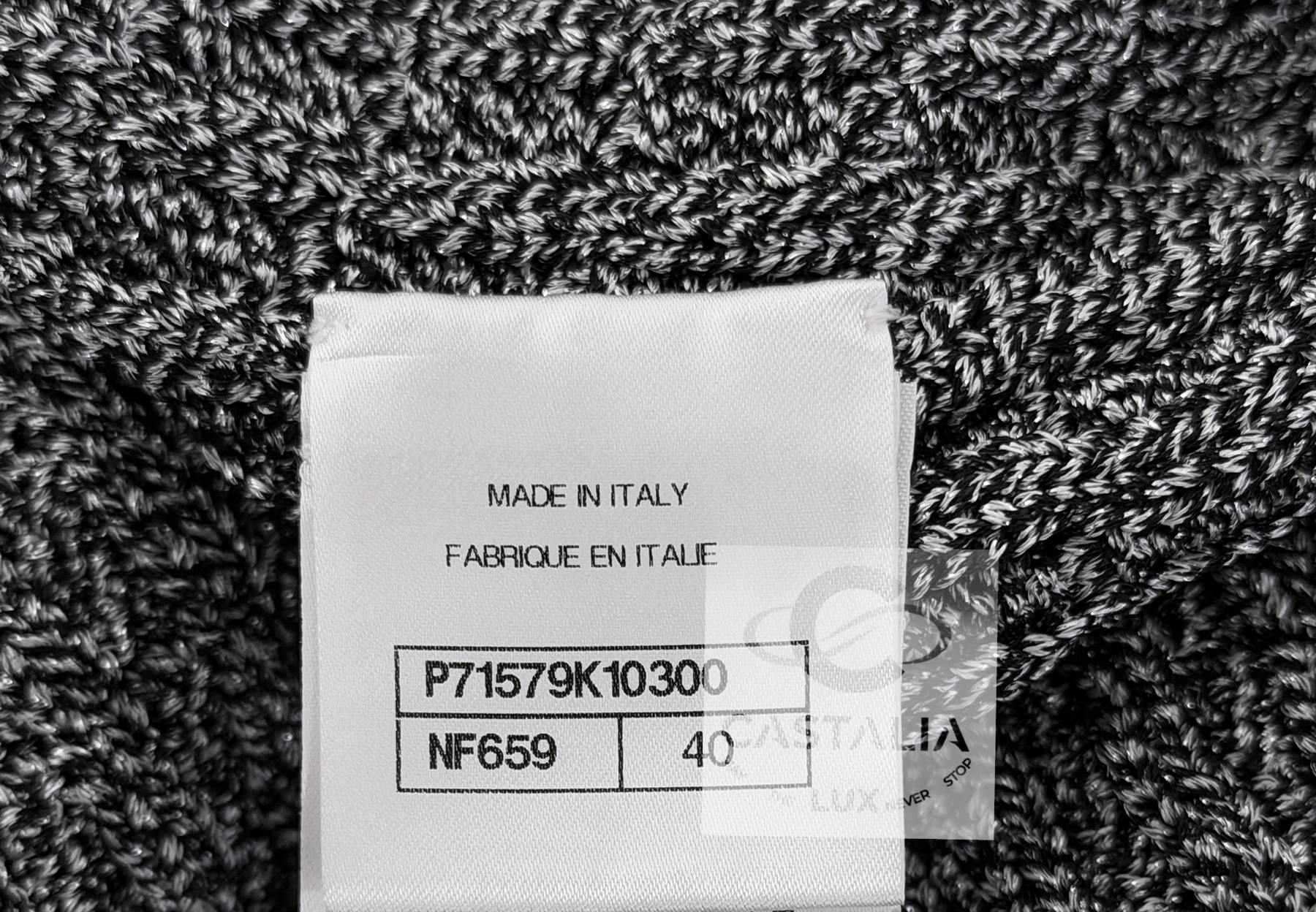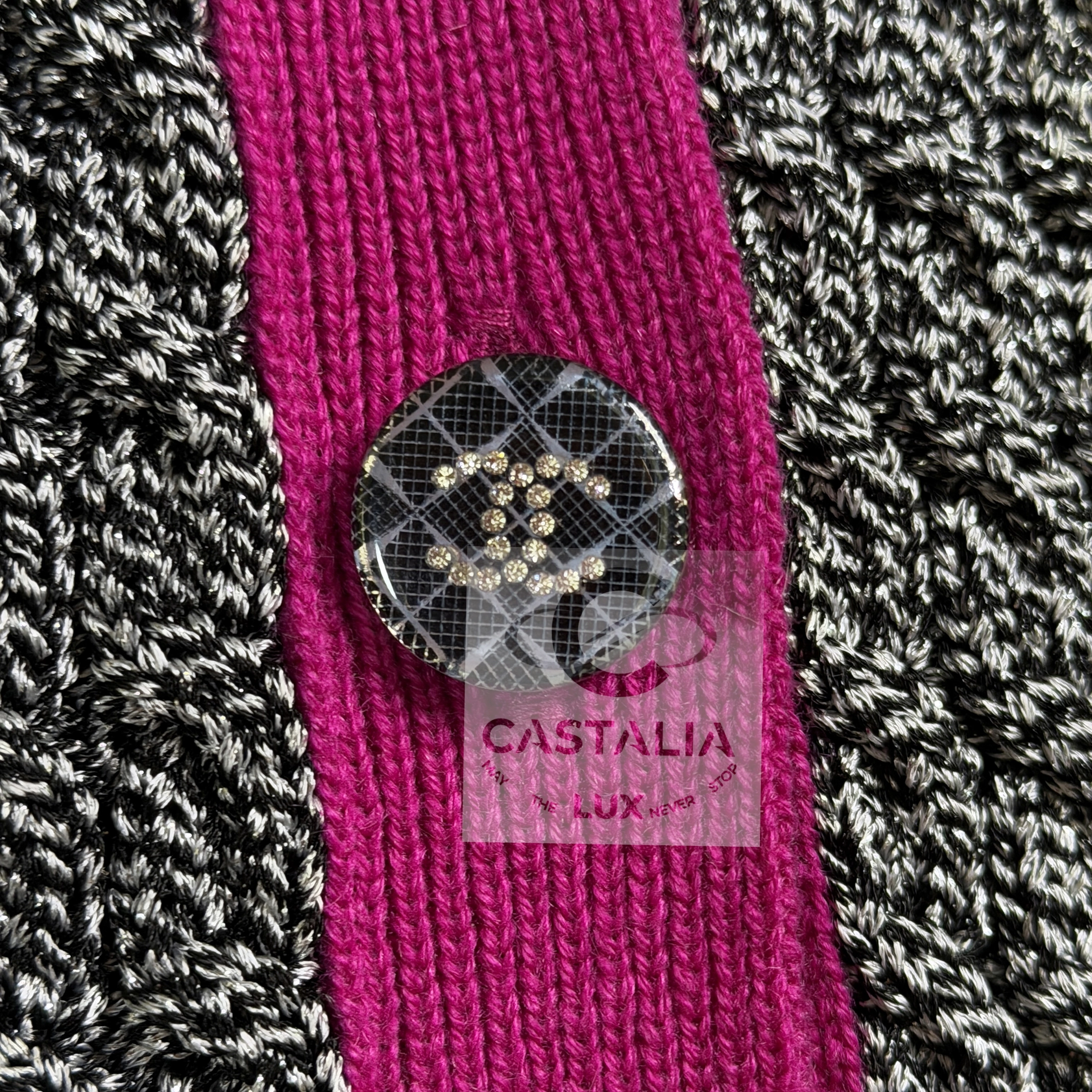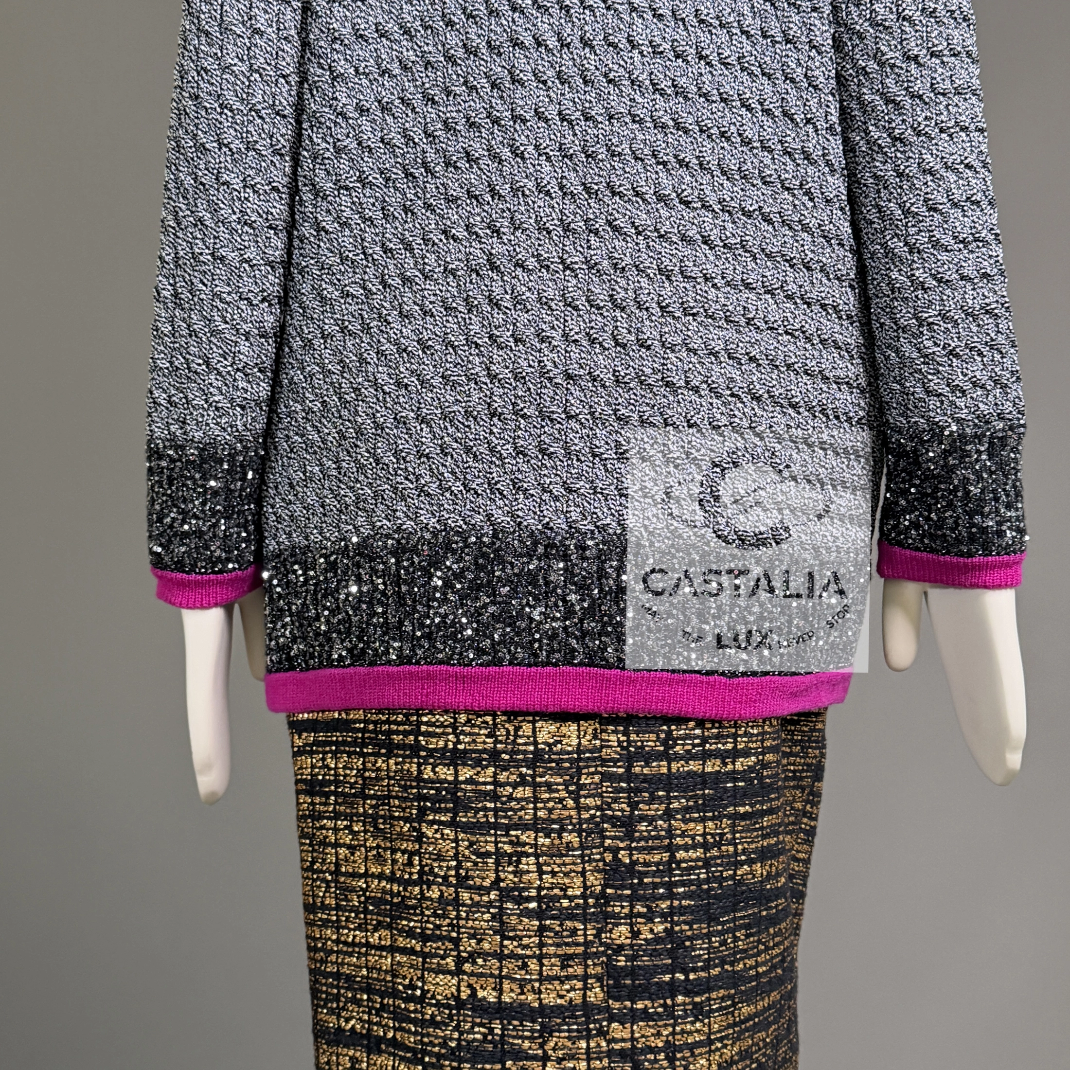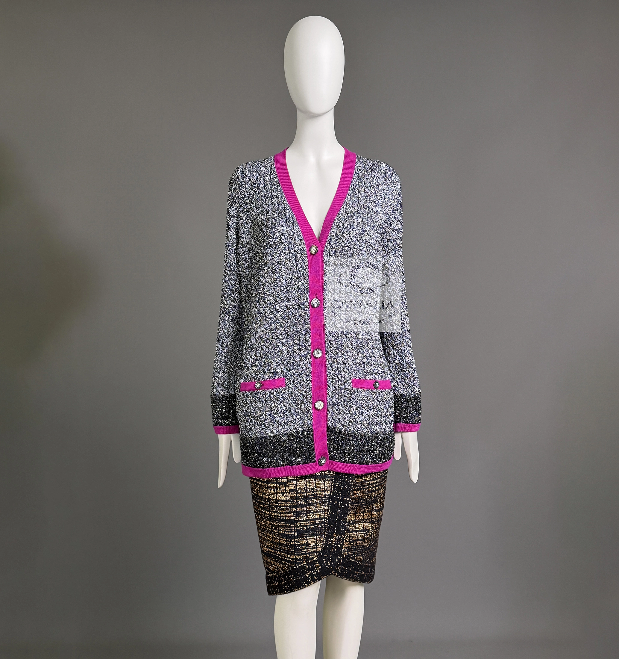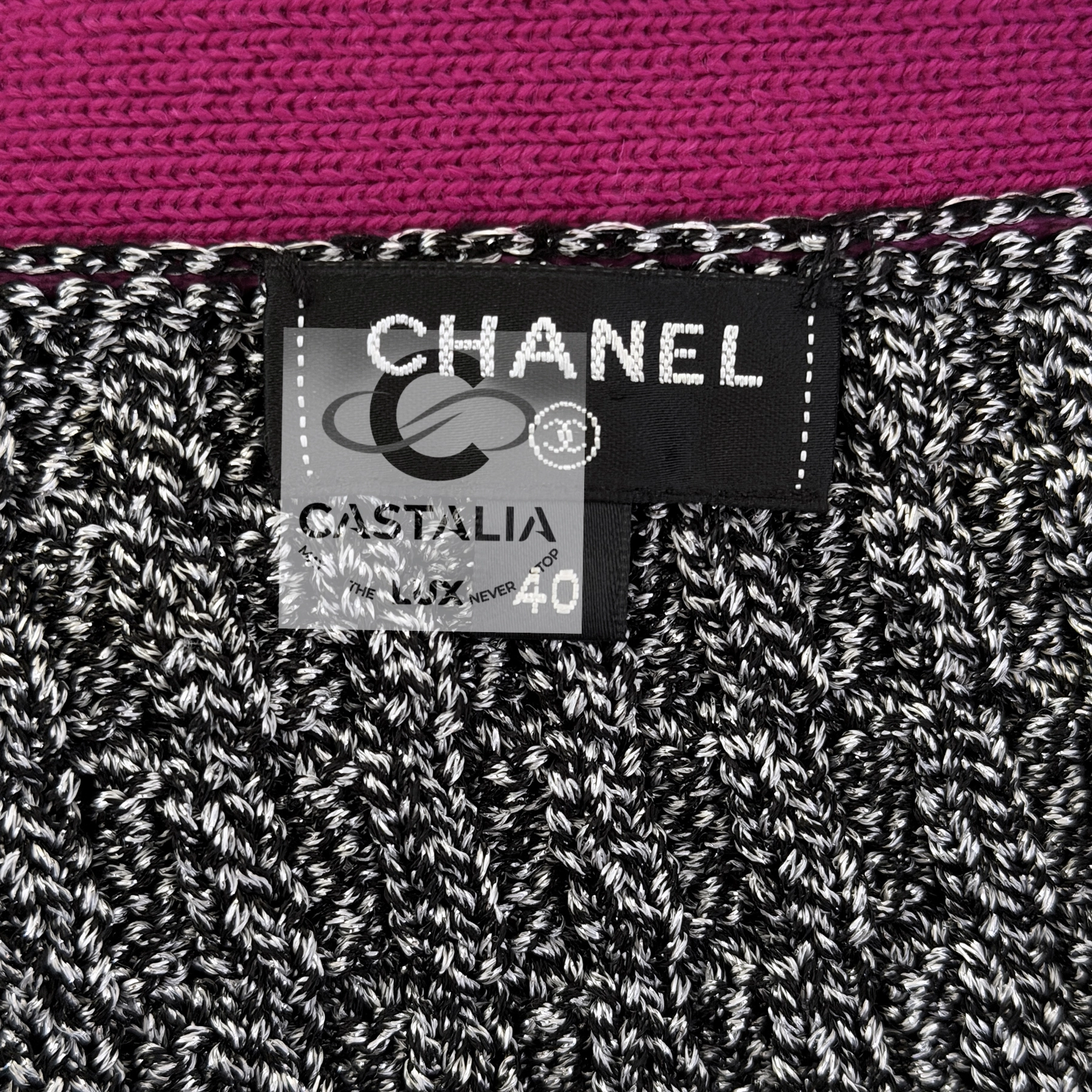 CHANEL Iconic Knit Cardigan with Sequin Embellishment — Runway Fall/Winter 2021 by Virginie Viard ~ Boutique value: Cardigan $5,820 ~ Seen on Jenny Kim and gracing magazine covers, the look fuses youthful energy with the refined sensuality of Chanel’s knit mastery ~ A collector’s relic of Chanel’s new modernity — a relic of Viard’s quiet revolution — poised at the intersection of knit, jewel, and myth // Size mark 40 FR / Condition: never worn // — Crafted from a steel-gray shimmering knit hand-embroidered with infinitesimal sequins, the fabric catches light like stardust in motion — fuchsia trim delineates its architecture — vibrant yet disciplined — creating a chromatic dialogue between shadow and radiance — Each CC Gripoix button, encircled with strass, gleams like a small cosmos sealed in crysta
