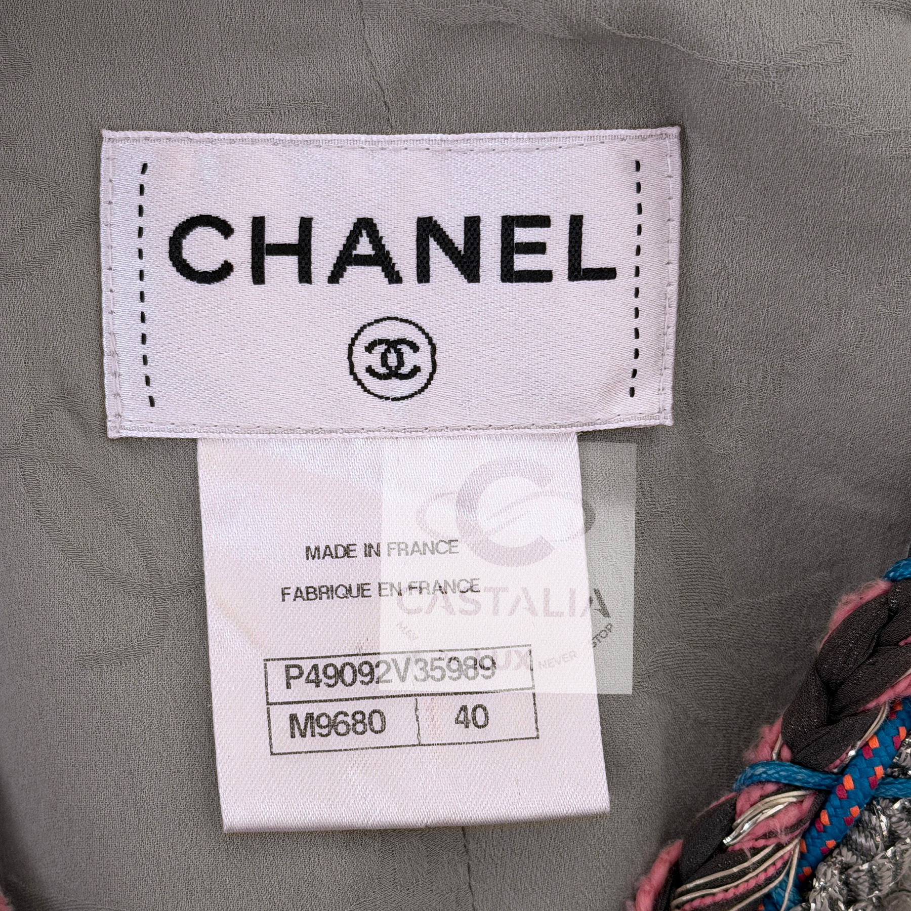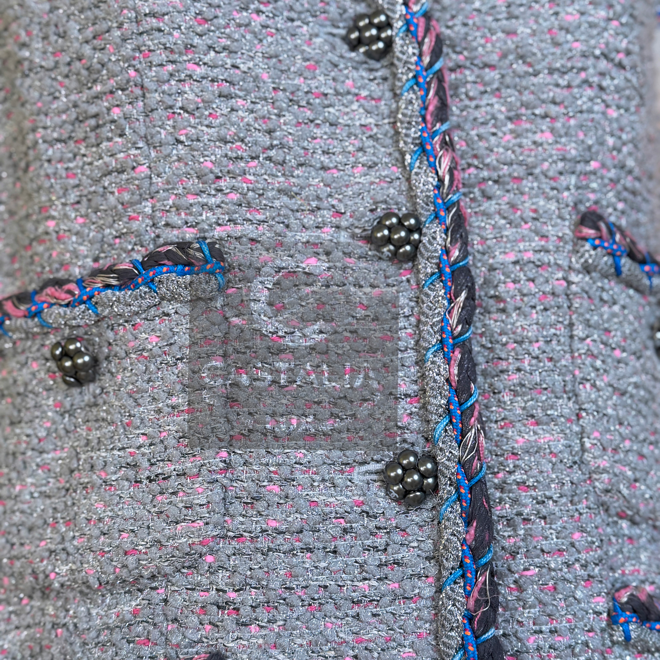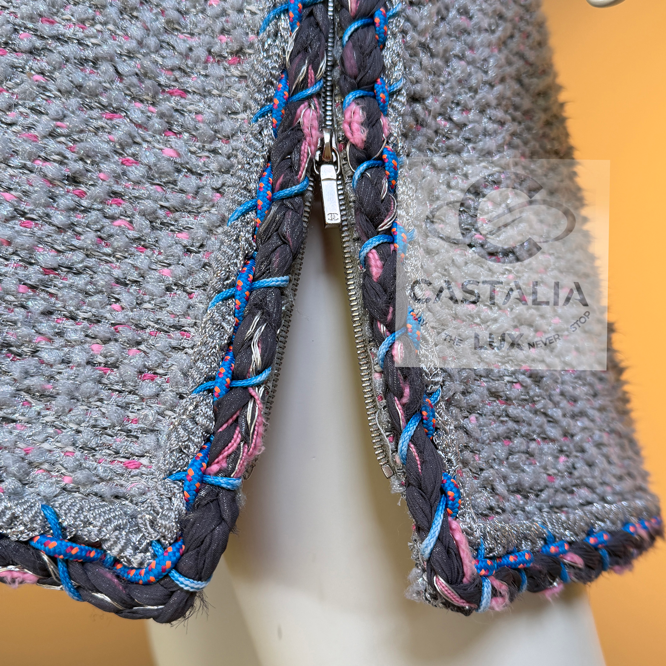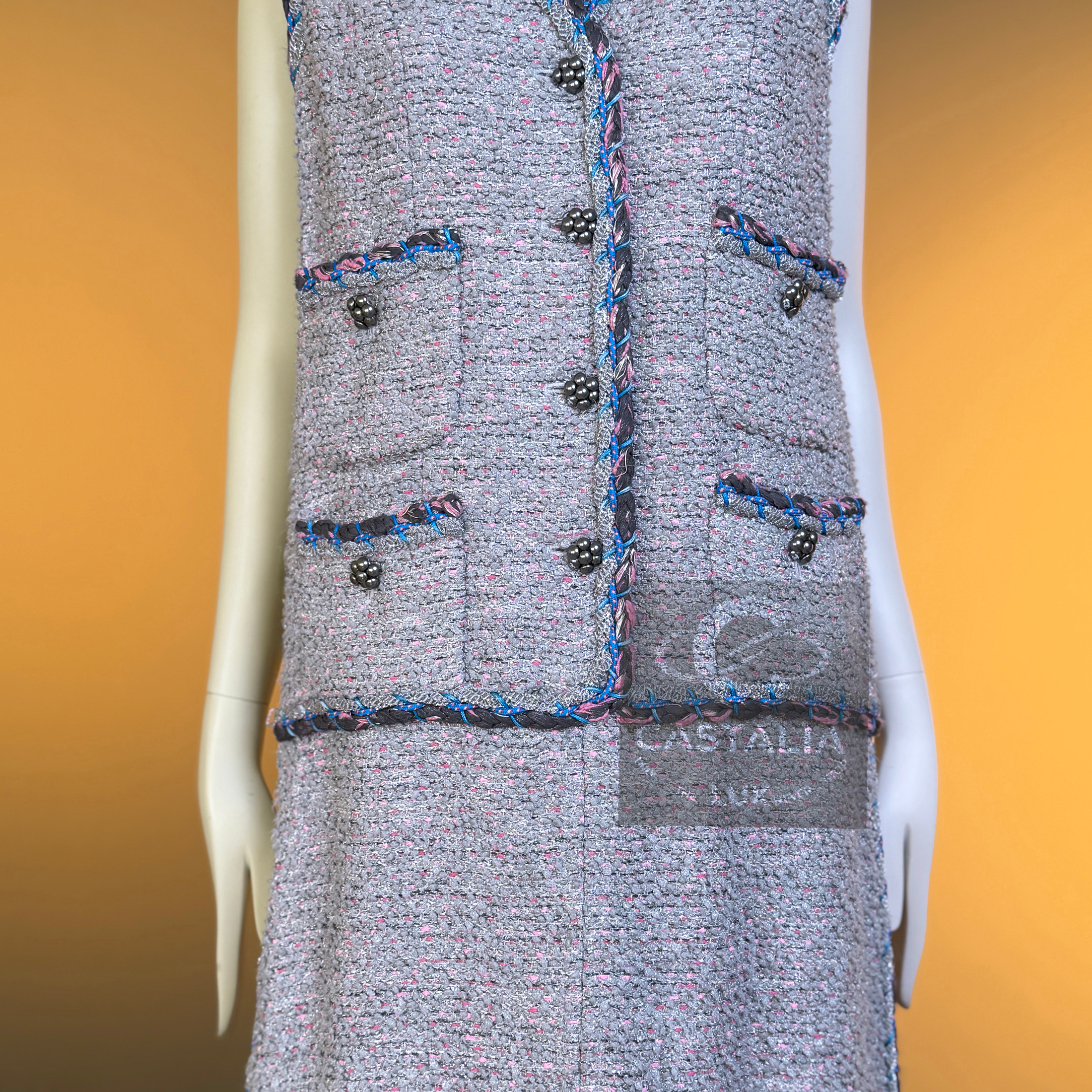 CHANEL Contemporary Art Collection, Spring 2014 Runway “Muse of the Future Gallery” – Iconic Gray Shimmer Tweed Dress ~ A living artifact from Karl Lagerfeld’s visionary 2014 Spring Show — this Chanel gray shimmer tweed dress is a triumph of form, femininity, and futurism ~ Worn by Cara Delevingne on the runway and immortalized on icons like Chiara Ferragni, it is now considered one of the most iconic Chanel dresses ever conceived. ~ This is not fashion. It is a manifesto of modernity—cut in tweed and sealed in time. // Size mark 40 FR / Condition: never worn // — Sculpted in a luminous gray tweed laced with glints of pink and silver, its silhouette is both architectural and playful — camellia-shaped CC logo buttons, sculpted like micro-sculptures, punctuate the front like sacred relics — The signature four-patch pocket configuration, a Chanel hallmark, balances symmetry and utility — The dress is trimmed throughout in a vibrant braid of blue, blush, and metallic thread—a kinetic border that dances with every step — Discreet side zippers adorned with interlocking CC pulls grace the hemline, offering versatility and quiet rebellion — At the shoulders, supple leather accents introduce a tactile shift, grounding the shimmer with edge. — Lined in tonal silk etched with camellias