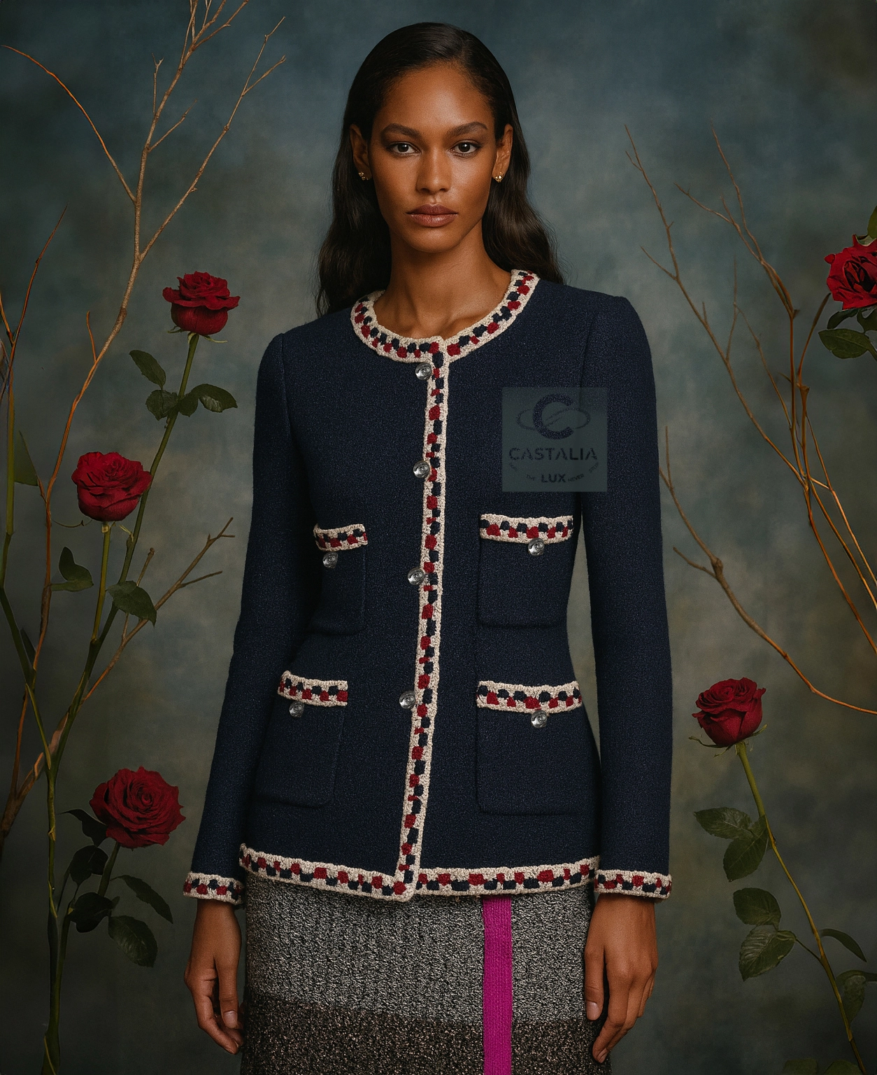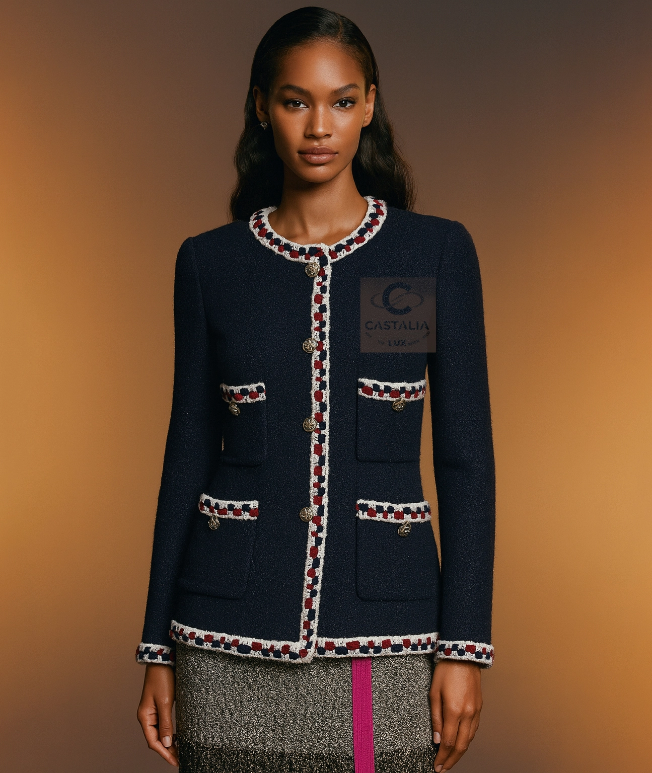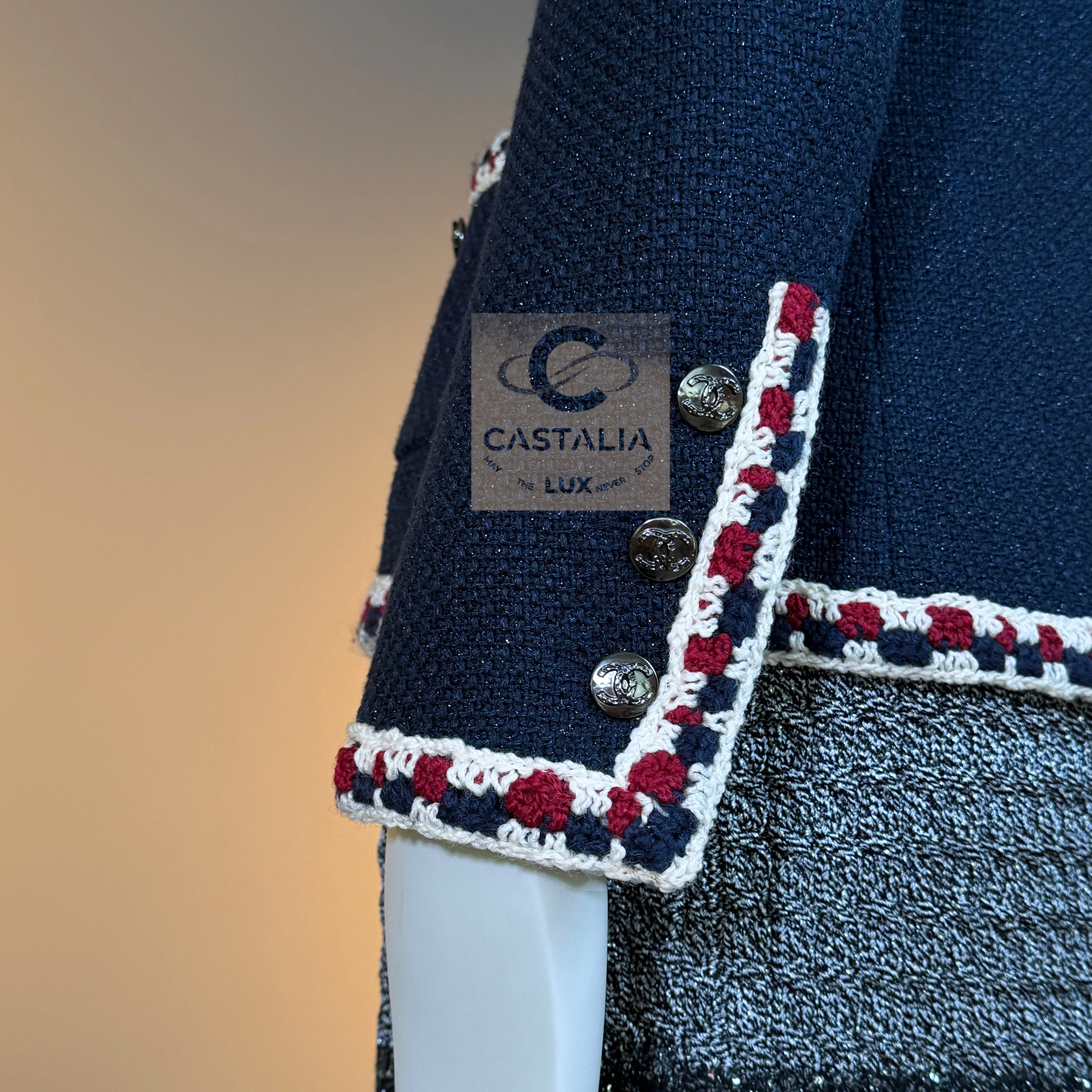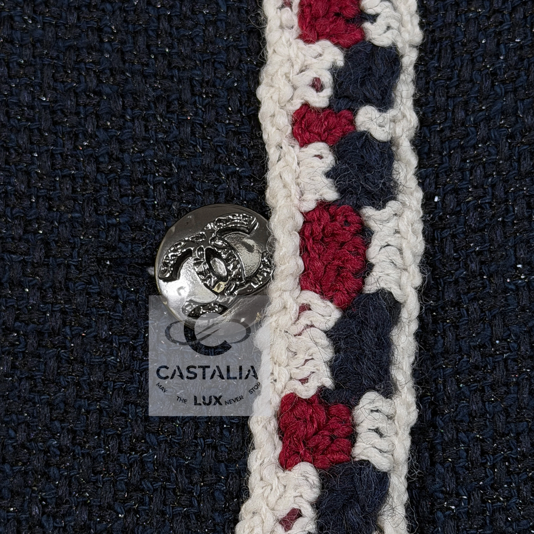 — Crafted from signature navy tweed with a subtle iridescent shimmer, woven in the storied ateliers of Lesage