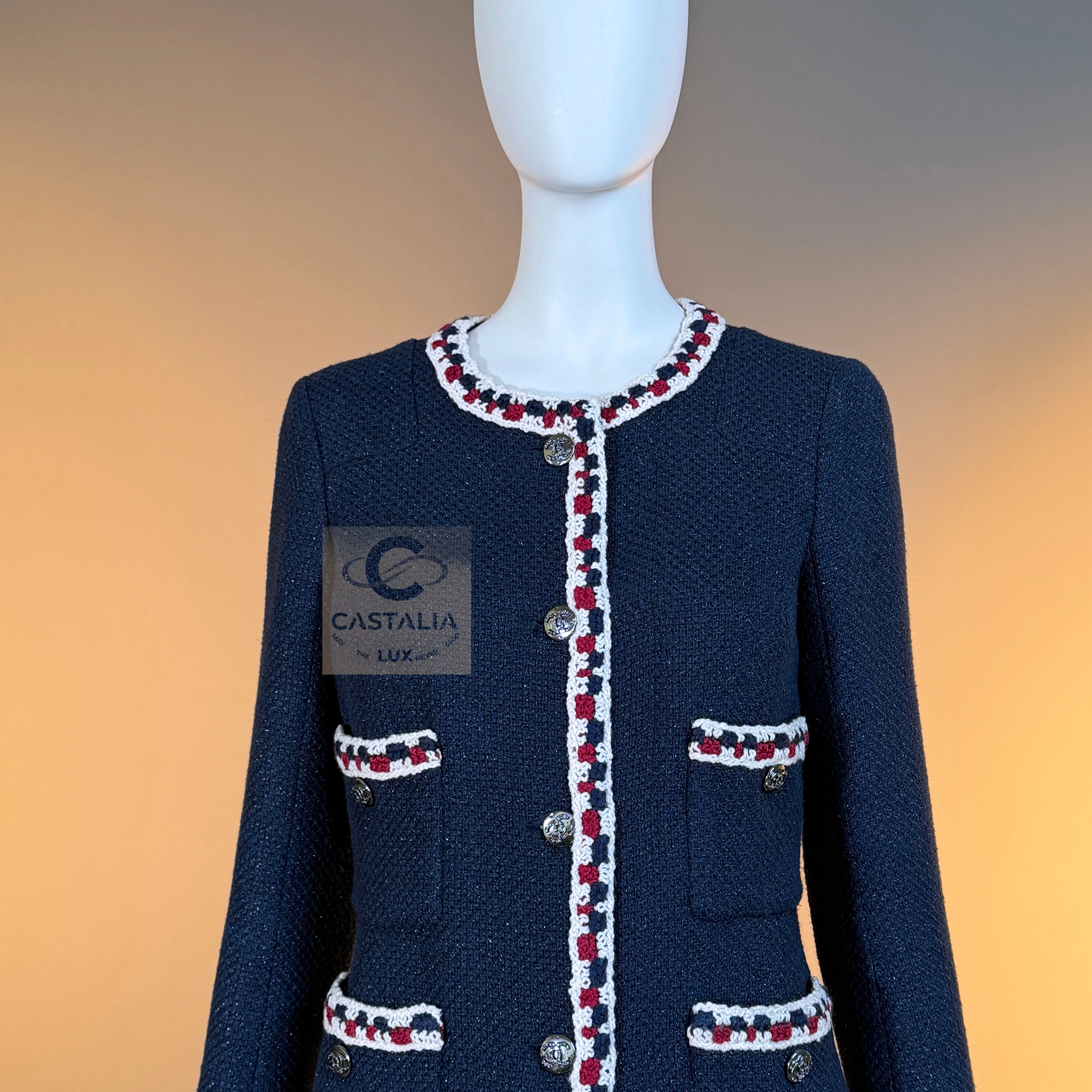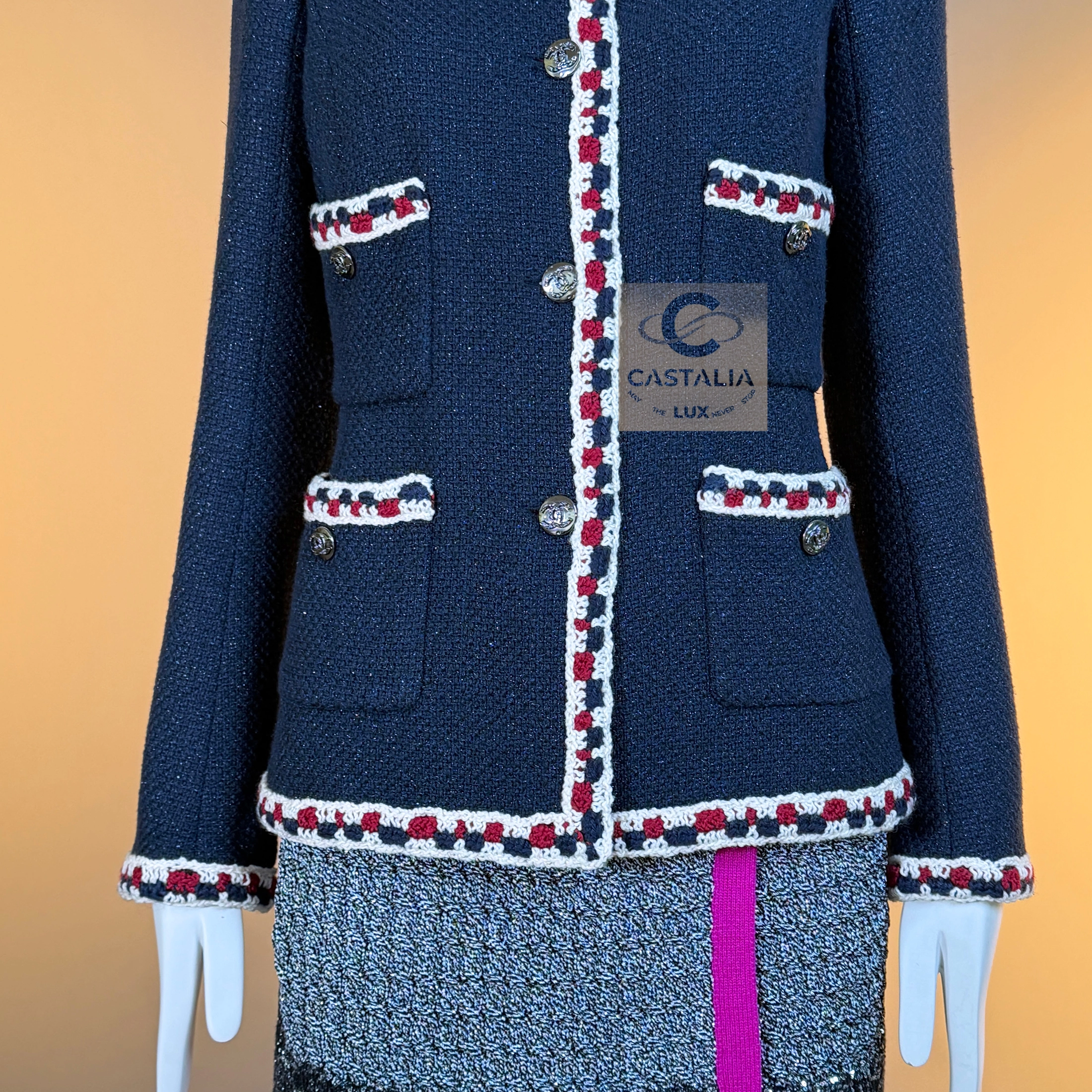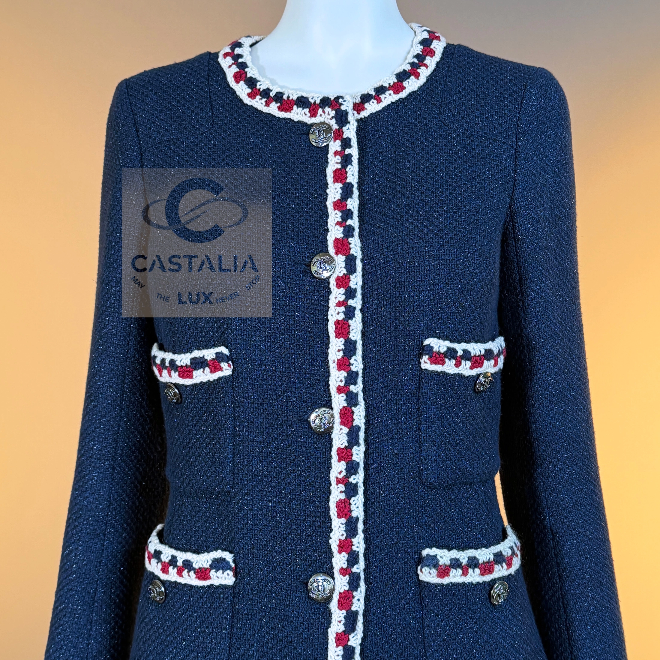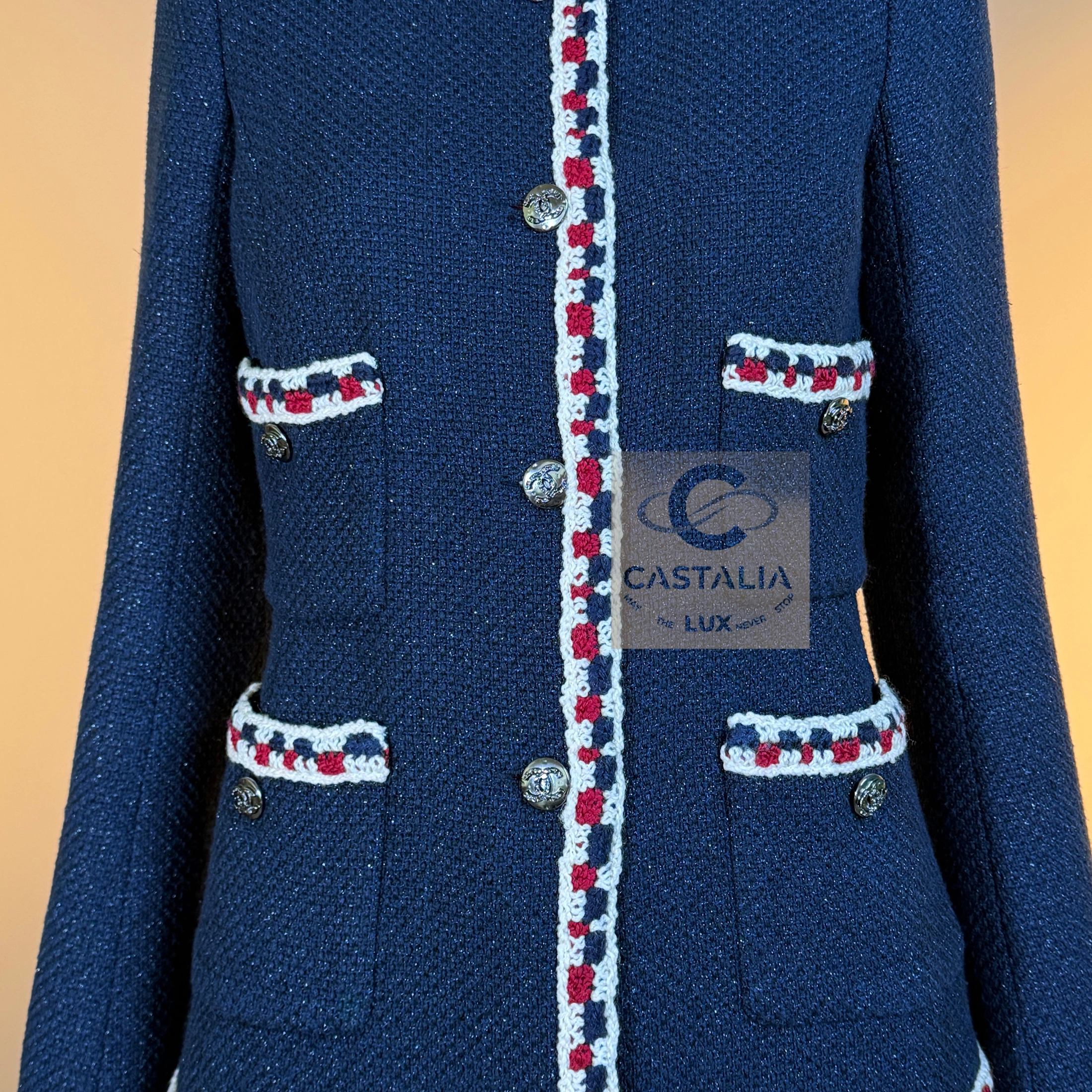 CHANEL Extremely Rare Collectible Tweed Jacket — Runway Spring 2011 Collection by Karl Lagerfeld // One of the most sought-after Chanel jackets ever created // ~ A mythical incarnation of the Little Black Jacket reimagined in navy shimmer — this Chanel runway masterpiece from the Spring 2011 collection stands among the most coveted pieces in the House’s modern history ~ A timeless and metaphysical piece — poised between garment and symbol — this jacket embodies Chanel’s philosophy of permanence: the idea that beauty, once perfected, belongs not to an era but to eternity // Size mark 34 FR / Condition: never worn // — Crafted from signature navy tweed with a subtle iridescent shimmer, woven in the storied ateliers of Lesage — Trimmed by hand with a richly braided border in tones of ivory, crimson, and indigo — a tactile symphony of threads woven like a hymn to craft — Designed in the iconic four-pocket silhouette — an eternal emblem of Chanel’s architectural purity — Finished with CC logo buttons at the front, pockets, and cuffs — discreet constellations of heritage and refinement — Fully lined in tonal silk, anchored with the classic chain link at the interior hem — the quiet weight of couture authenticity