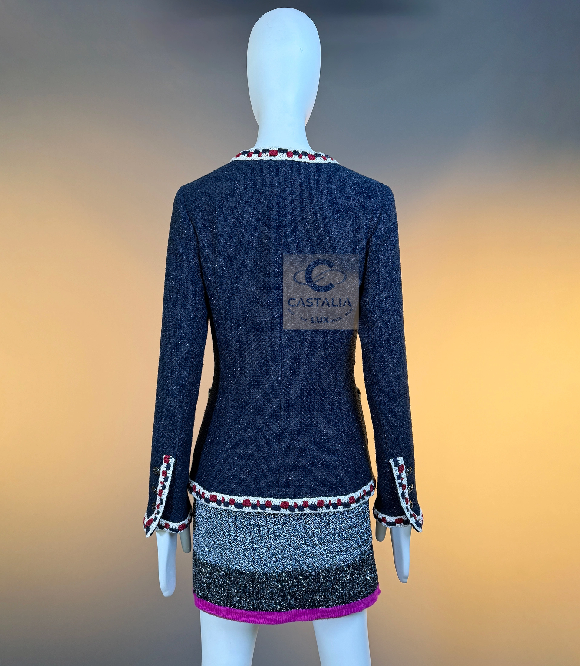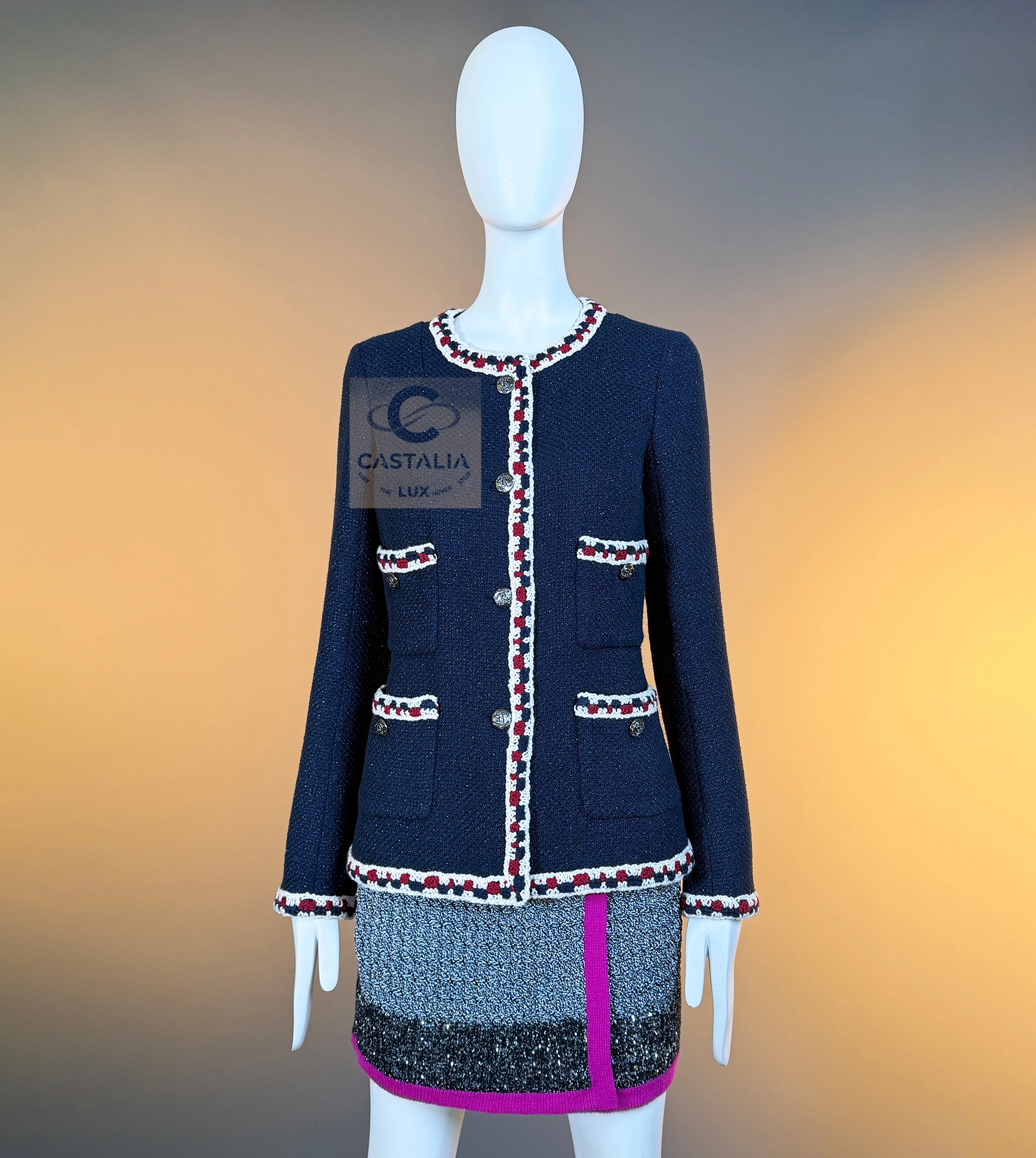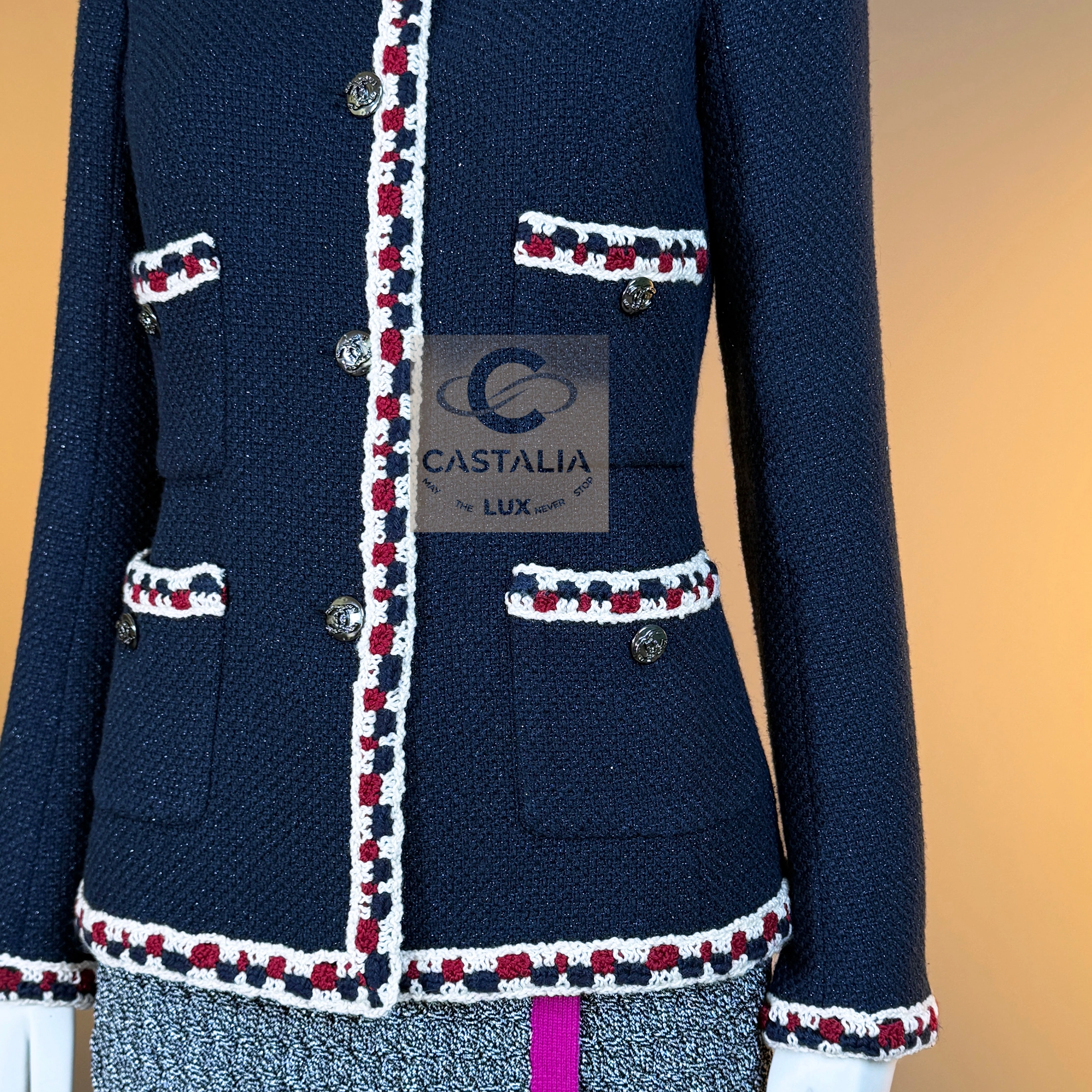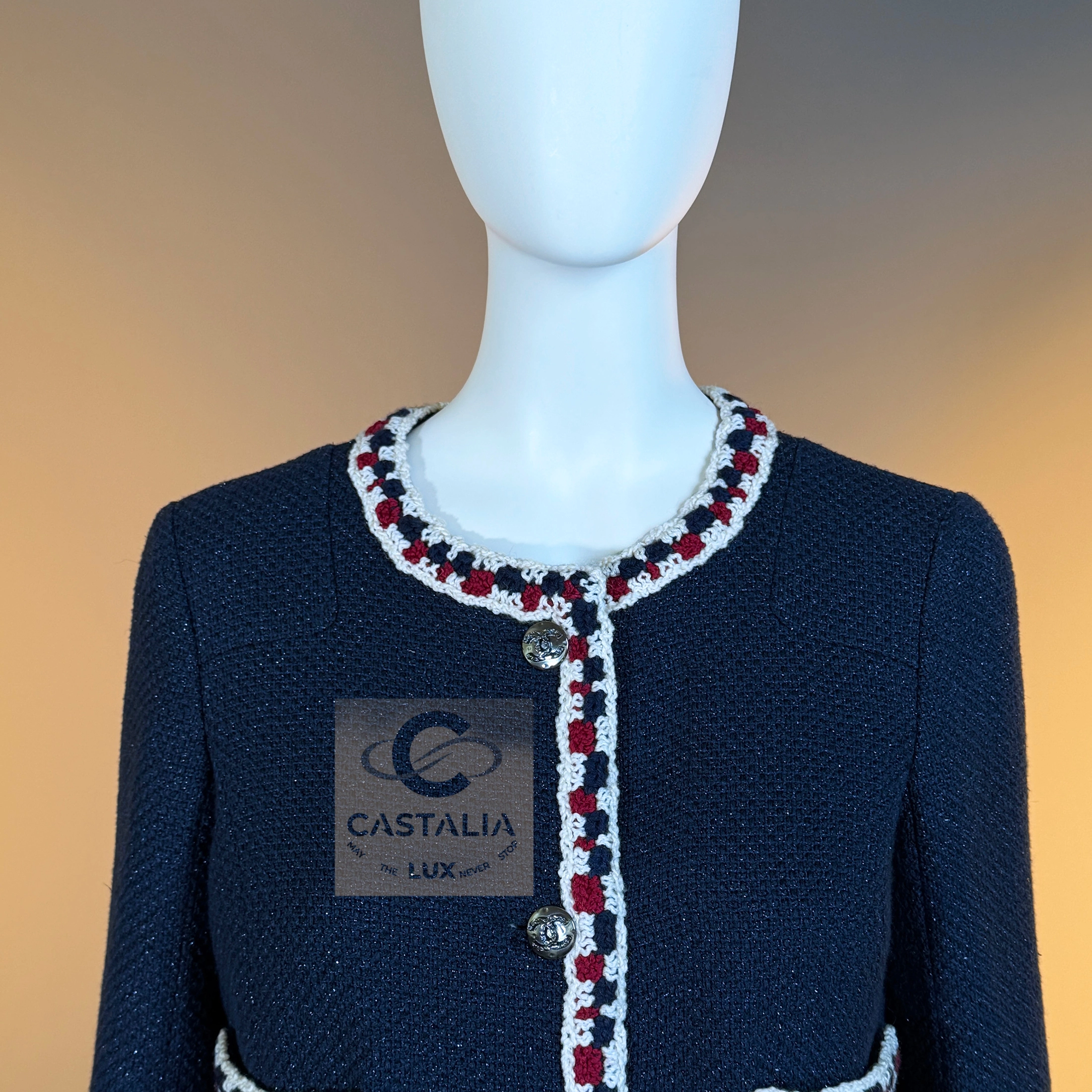 CHANEL Extremely Rare Collectible Tweed Jacket — Runway Spring 2011 Collection by Karl Lagerfeld // One of the most sought-after Chanel jackets ever created // ~ A mythical incarnation of the Little Black Jacket reimagined in navy shimmer — this Chanel runway masterpiece from the Spring 2011 collection stands among the most coveted pieces in the House’s modern history ~ A timeless and metaphysical piece — poised between garment and symbol — this jacket embodies Chanel’s philosophy of permanence: the idea that beauty, once perfected, belongs not to an era but to eternity // Size mark 34 FR / Condition: never worn // — Crafted from signature navy tweed with a subtle iridescent shimmer, woven in the storied ateliers of Lesage — Trimmed by hand with a richly braided border in tones of ivory, crimson, and indigo — a tactile symphony of threads woven like a hymn to craft — Designed in the iconic four-pocket silhouette — an eternal emblem of Chanel’s architectural purity — Finished with CC logo buttons at the front, pockets, and cuffs — discreet constellations of heritage and refinement — Fully lined in tonal silk, anchored with the classic chain link at the interior hem — the quiet weight of couture authenticity