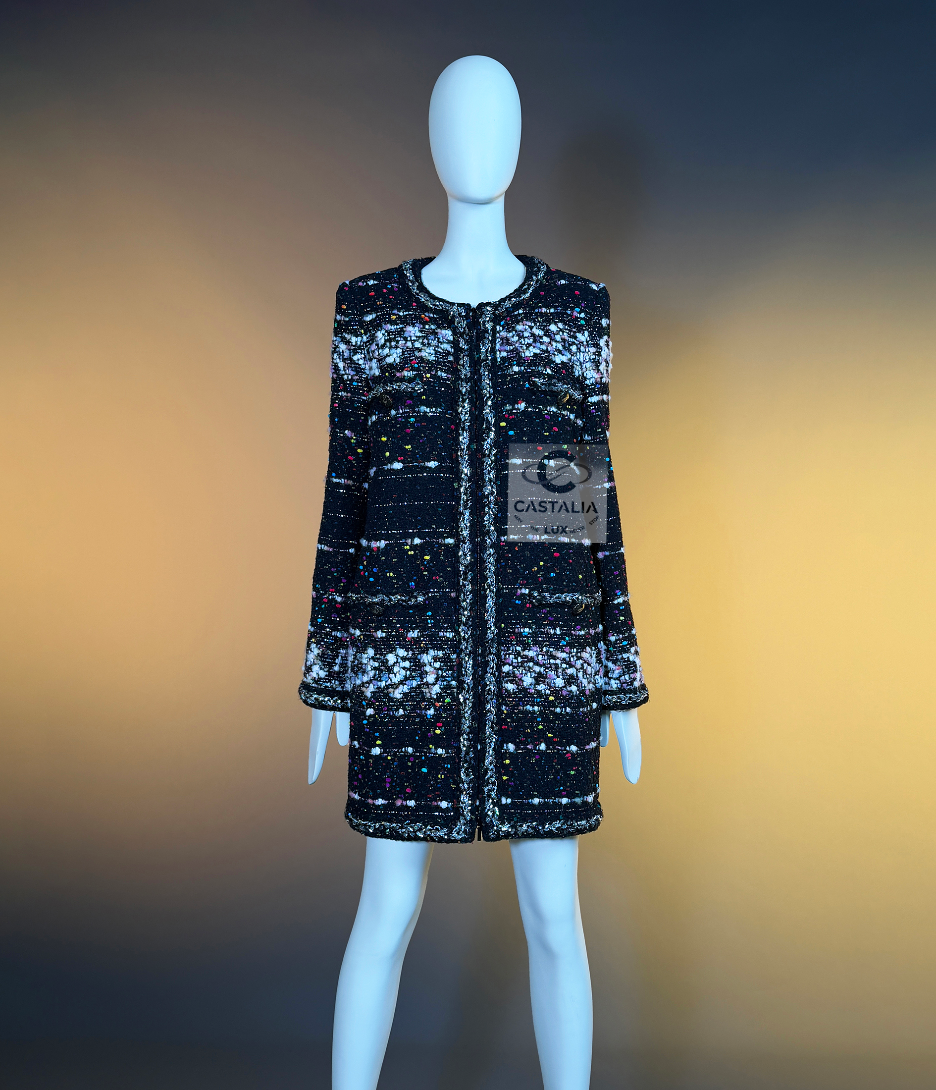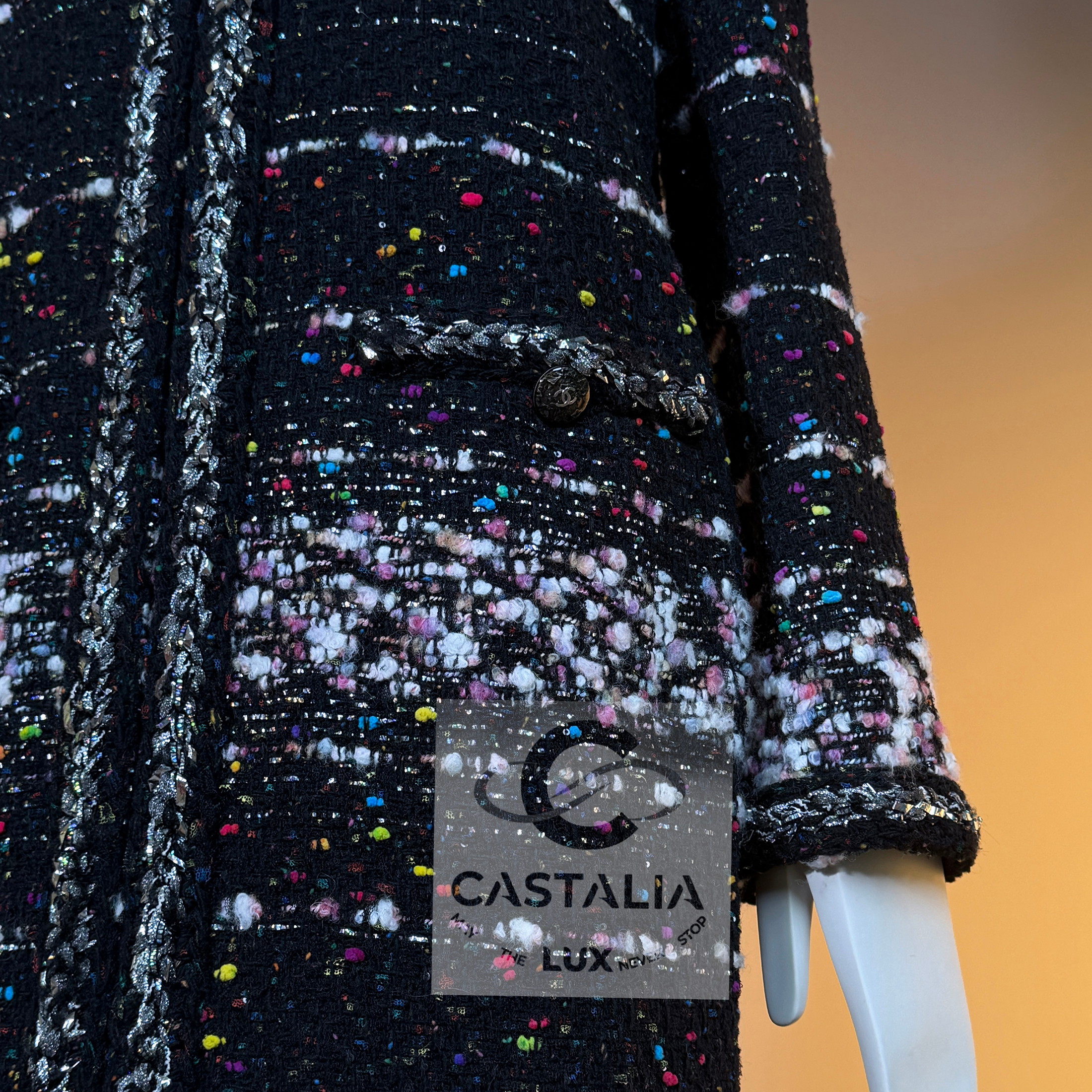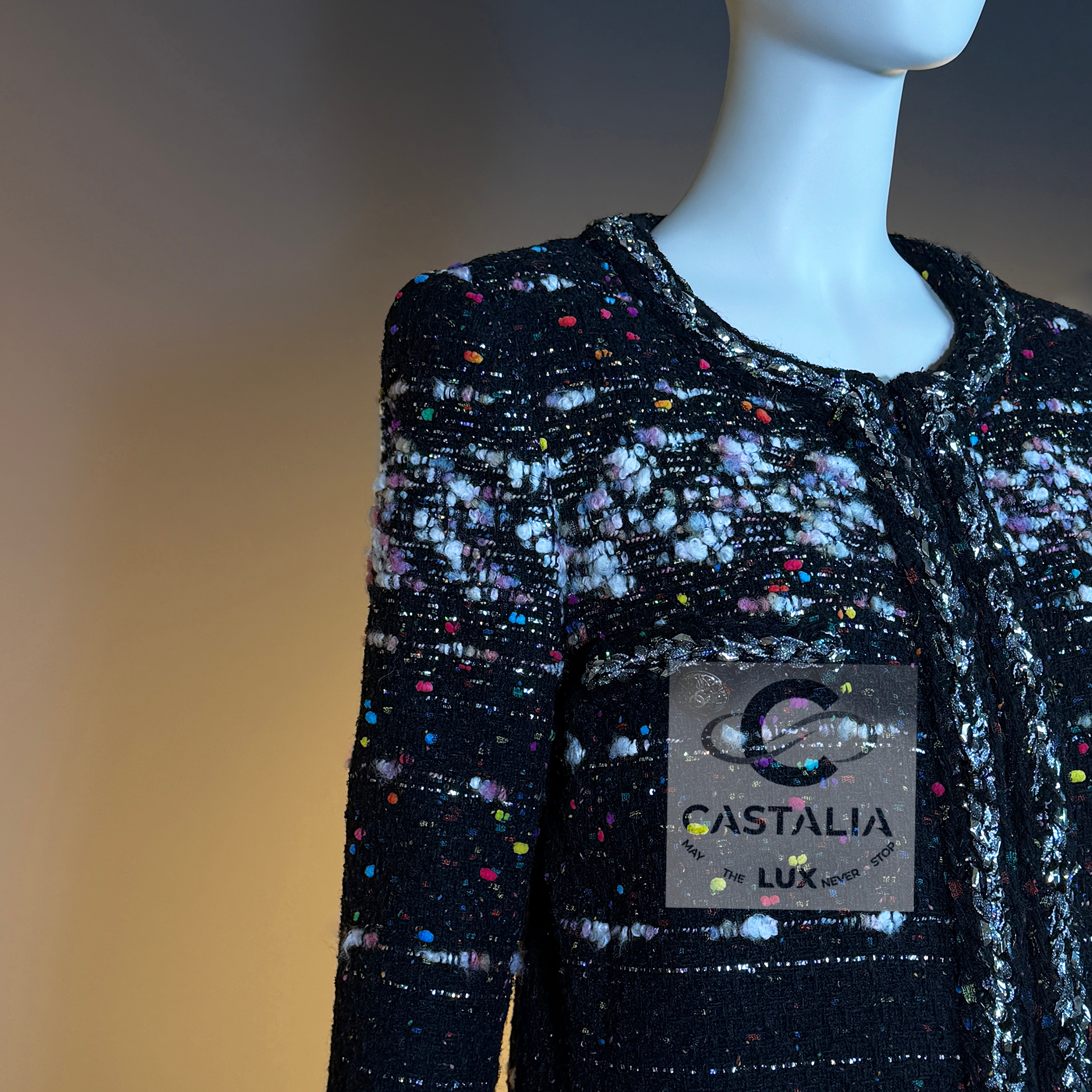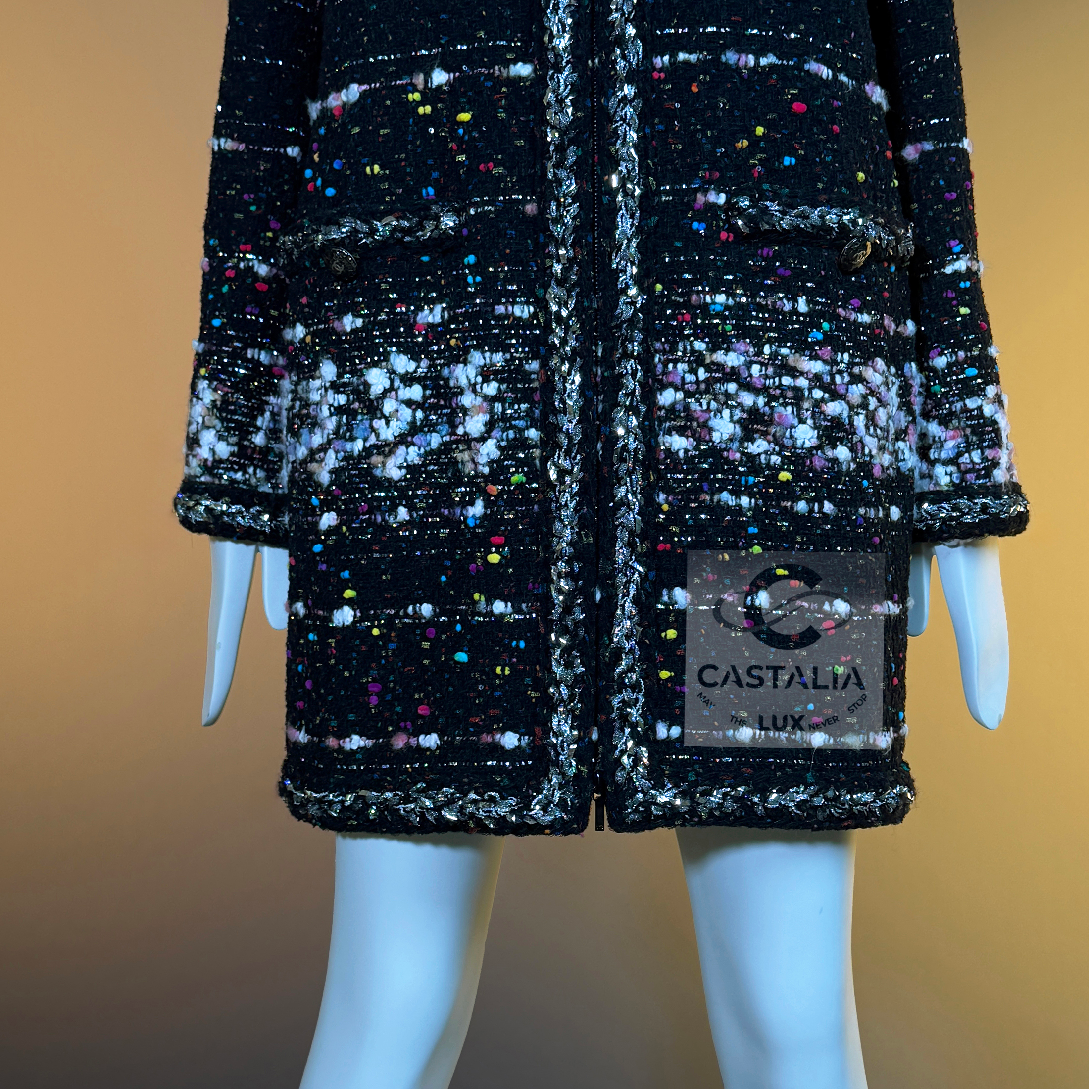 CHANEL — Supermarket Collection — Confetti Tweed Coat ~ As seen on Cara Delevingne in Karl Lagerfeld’s global campaign // Boutique Value: A collectible, coveted; initial value over 13,000$ ~ Aesthetic: Post-pop elegance, crystallized this rare Chanel coat fuses irreverence with refinement — a silhouette immortalized by Cara Delevingne, emblazoned across billboards from Paris to Tokyo // Size mark 42 FR / Condition: never worn // — Cut in a sculptural, longline frame, it is rendered in jubilant confetti-inspired Lesage tweed, as if Lagerfeld himself had shaken the last burst of color from a piñata of Parisian dreams — texture is richly tactile — midnight black punctuated by bursts of pink, cerulean, lemon, and pearl, evoking sugar sprinkles on velvet cake — Four enamelled CC lollipop buttons anchor the look with a wink, while a front zipper with CC logo pull cinches it into a utilitarian poem of haute rebellion — Along each seam, a metallic silver braided trim glimmers like tinsel through asphalt — a nod to checkout lines turned catwalks,or the sublime hidden in aisle seven. It is street and starlight, candy and chainmail — Finished with a black silk lining that slips on like a whispered signature, this piece is Lagerfeld’s love letter to contradiction —ephemeral and eternal, sweet and severe