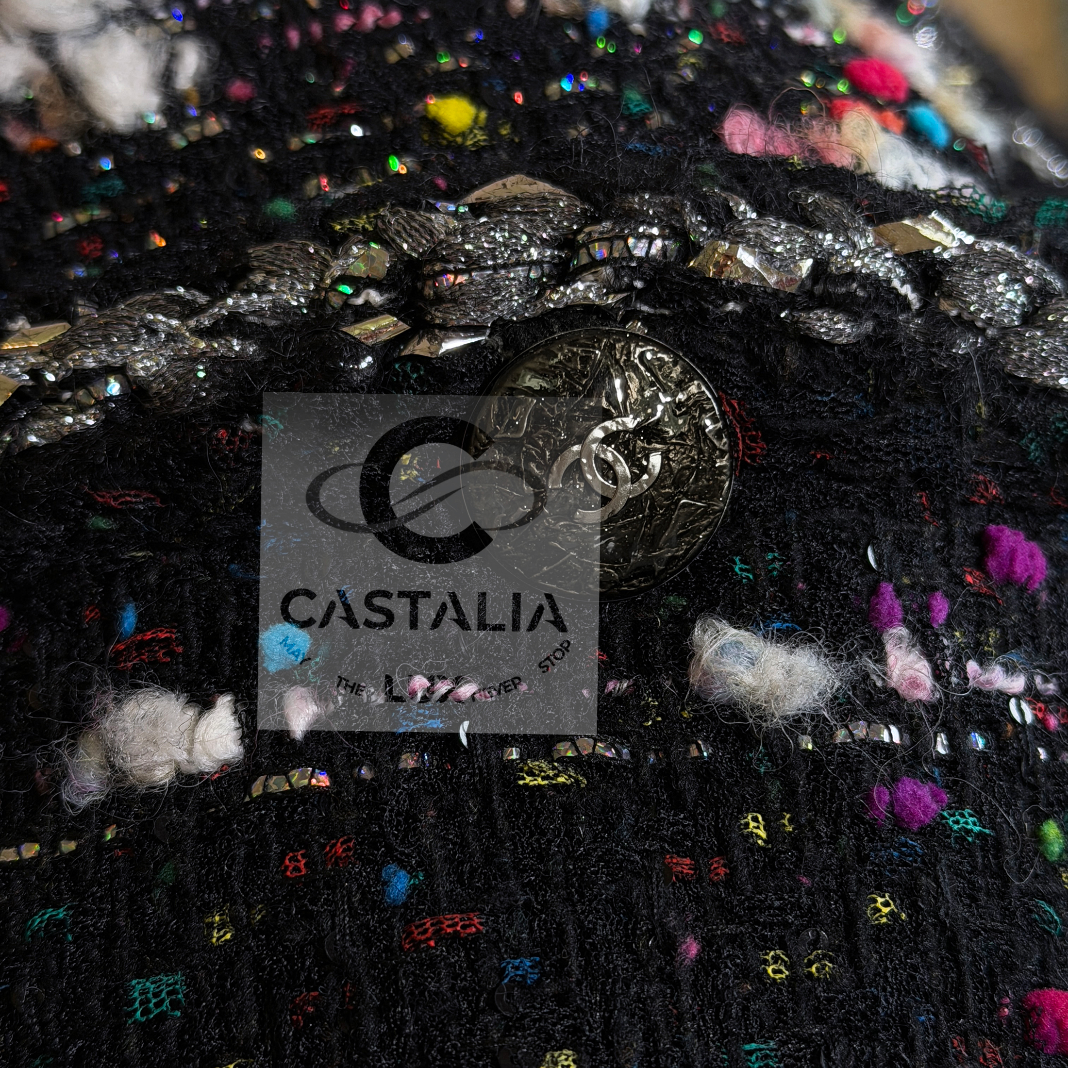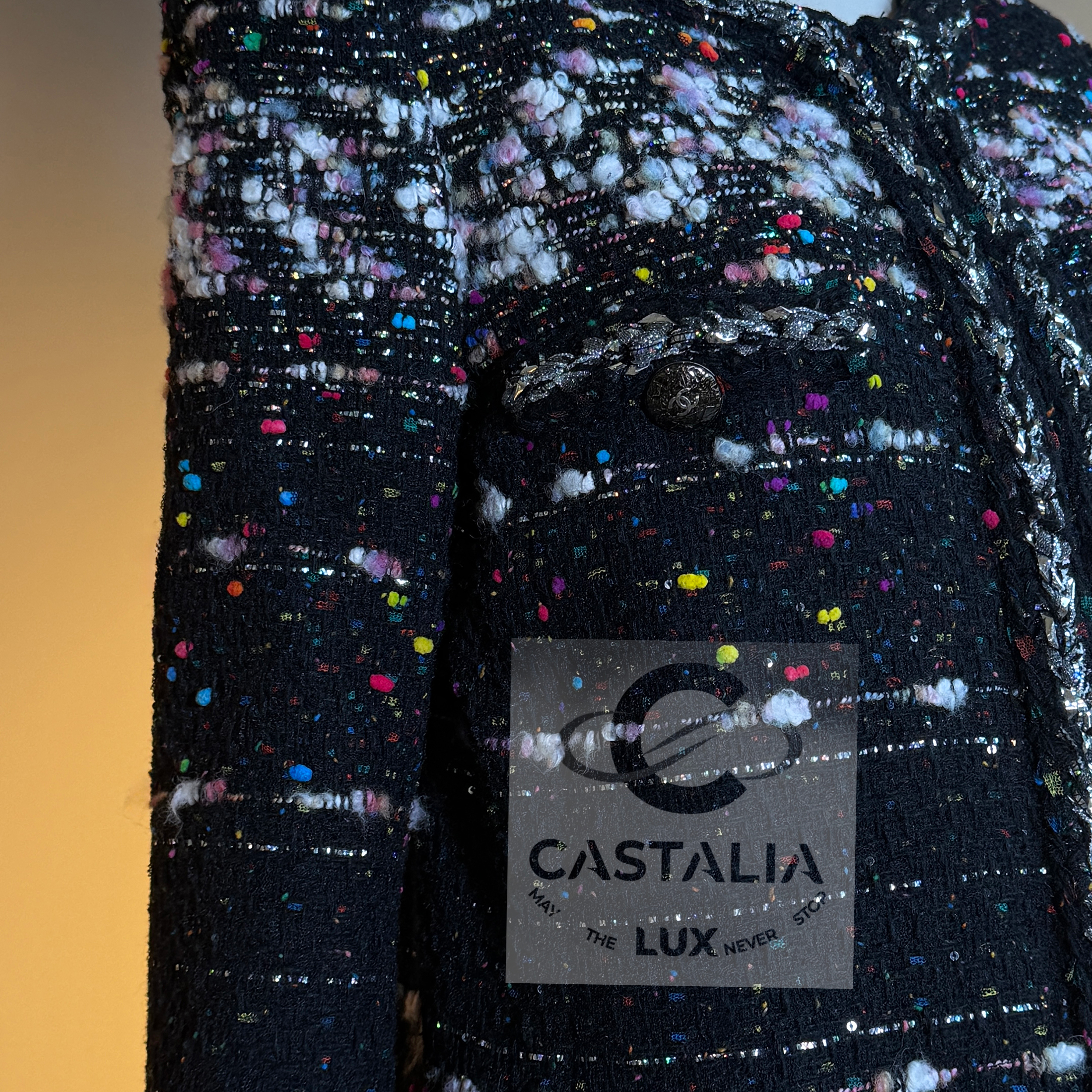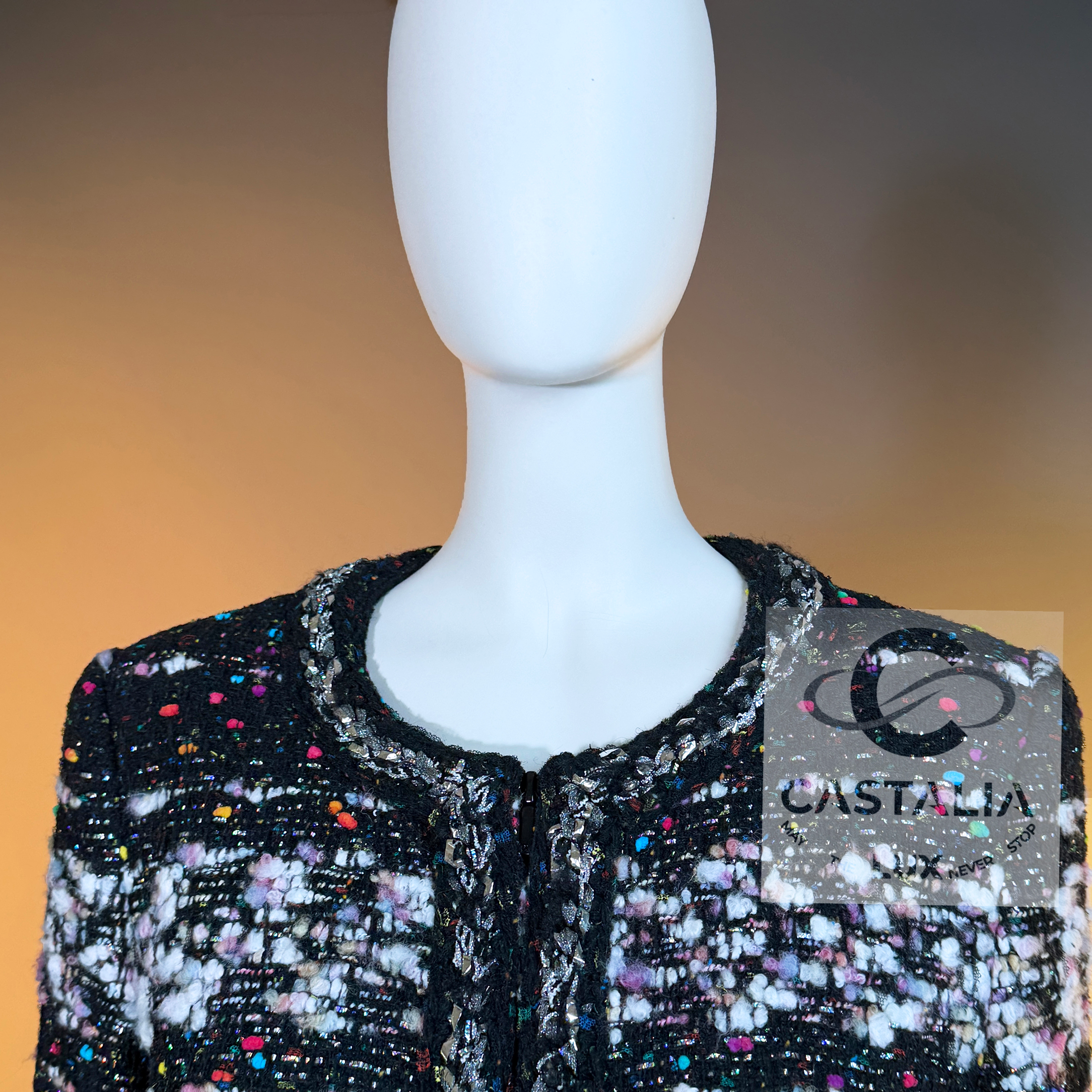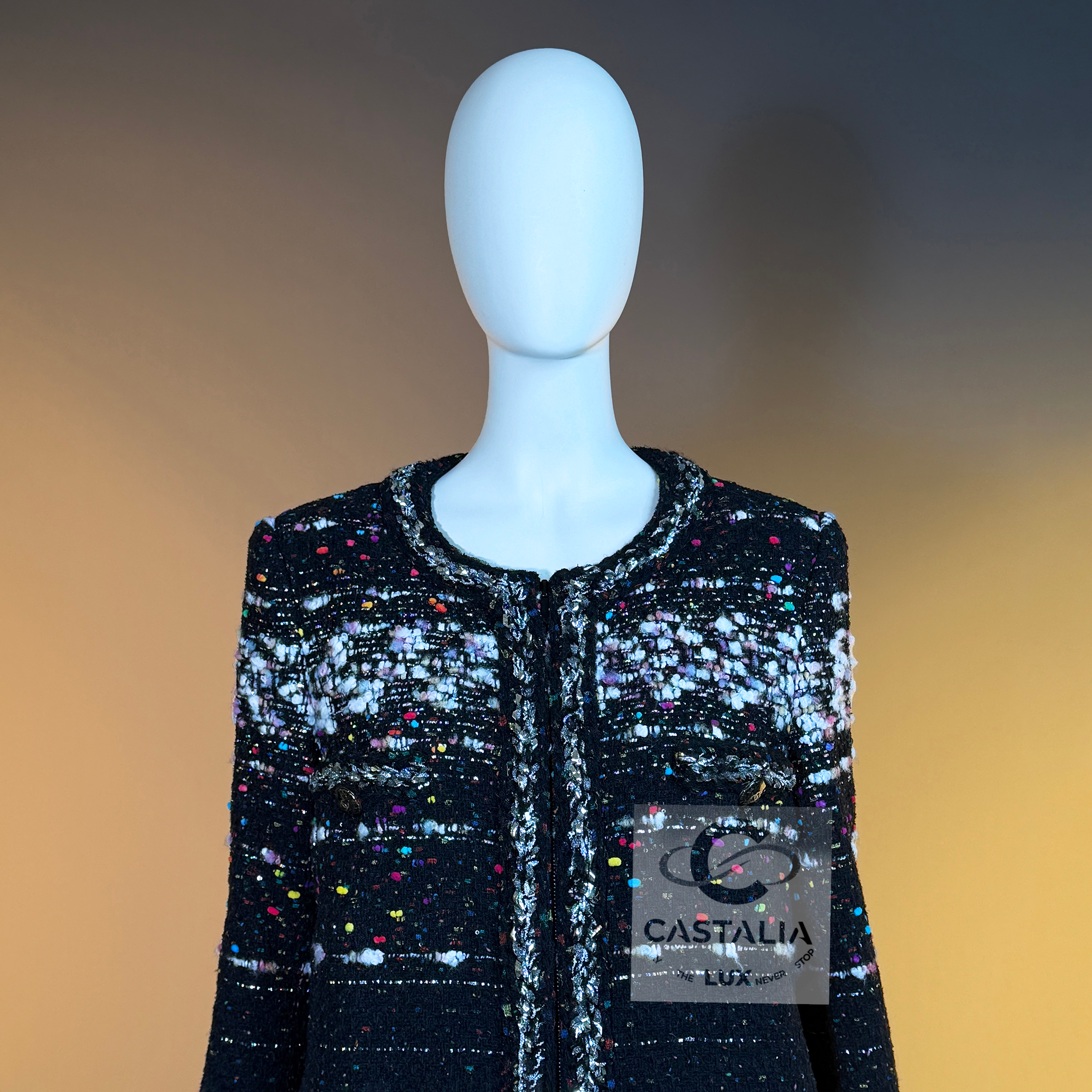 CHANEL — Supermarket Collection — Confetti Tweed Coat ~ As seen on Cara Delevingne in Karl Lagerfeld’s global campaign // Boutique Value: A collectible, coveted; initial value over 13,000$ ~ Aesthetic: Post-pop elegance, crystallized this rare Chanel coat fuses irreverence with refinement — a silhouette immortalized by Cara Delevingne, emblazoned across billboards from Paris to Tokyo // Size mark 42 FR / Condition: never worn // — Cut in a sculptural, longline frame, it is rendered in jubilant confetti-inspired Lesage tweed, as if Lagerfeld himself had shaken the last burst of color from a piñata of Parisian dreams — texture is richly tactile — midnight black punctuated by bursts of pink, cerulean, lemon, and pearl, evoking sugar sprinkles on velvet cake — Four enamelled CC lollipop buttons anchor the look with a wink, while a front zipper with CC logo pull cinches it into a utilitarian poem of haute rebellion — Along each seam, a metallic silver braided trim glimmers like tinsel through asphalt — a nod to checkout lines turned catwalks,or the sublime hidden in aisle seven. It is street and starlight, candy and chainmail — Finished with a black silk lining that slips on like a whispered signature, this piece is Lagerfeld’s love letter to contradiction —ephemeral and eternal, sweet and severe