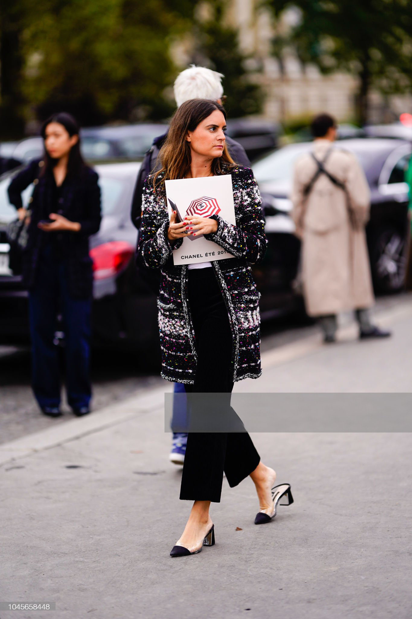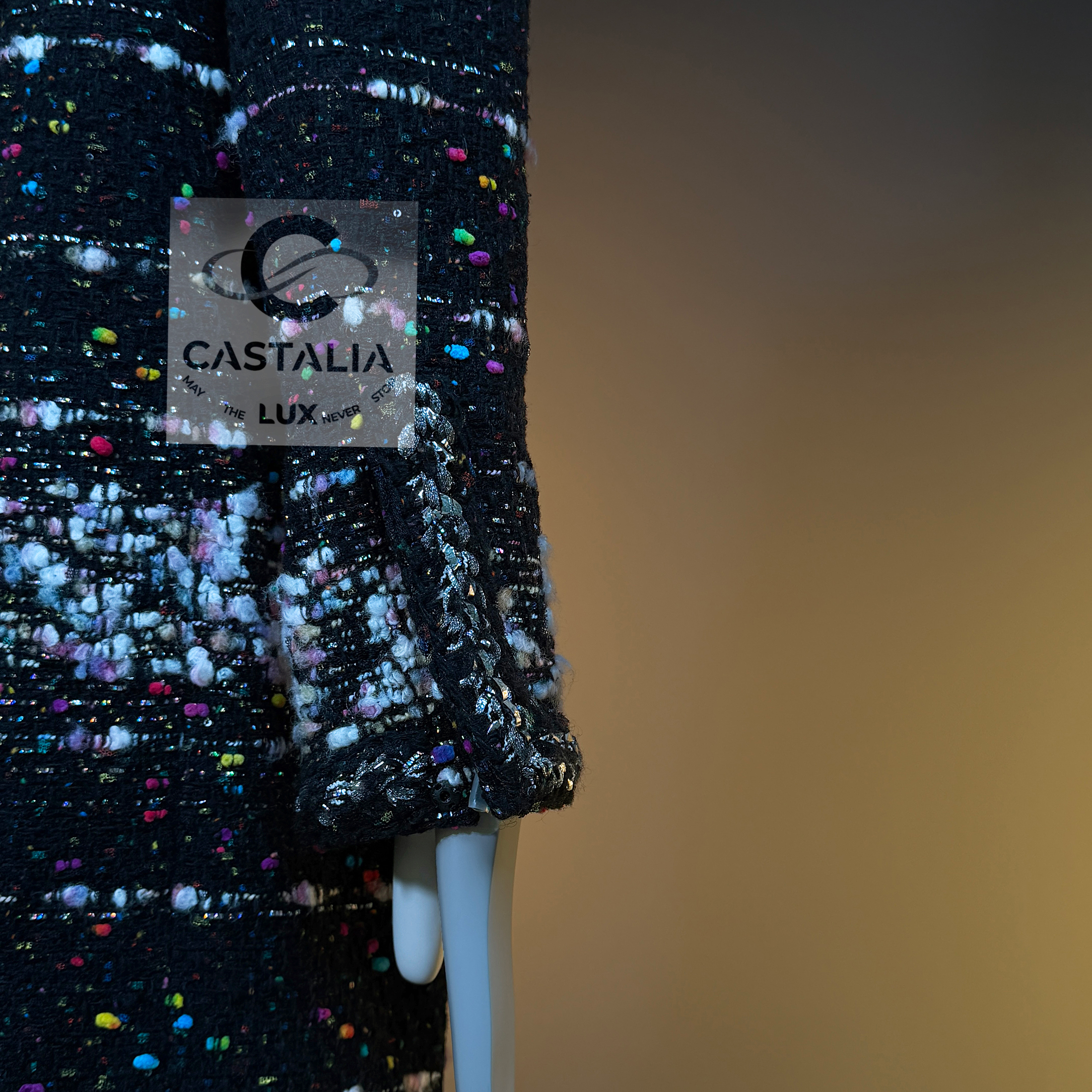 — Cut in a sculptural, longline frame, it is rendered in jubilant confetti-inspired Lesage tweed, as if Lagerfeld himself had shaken the last burst of color from a piñata of Parisian dreams