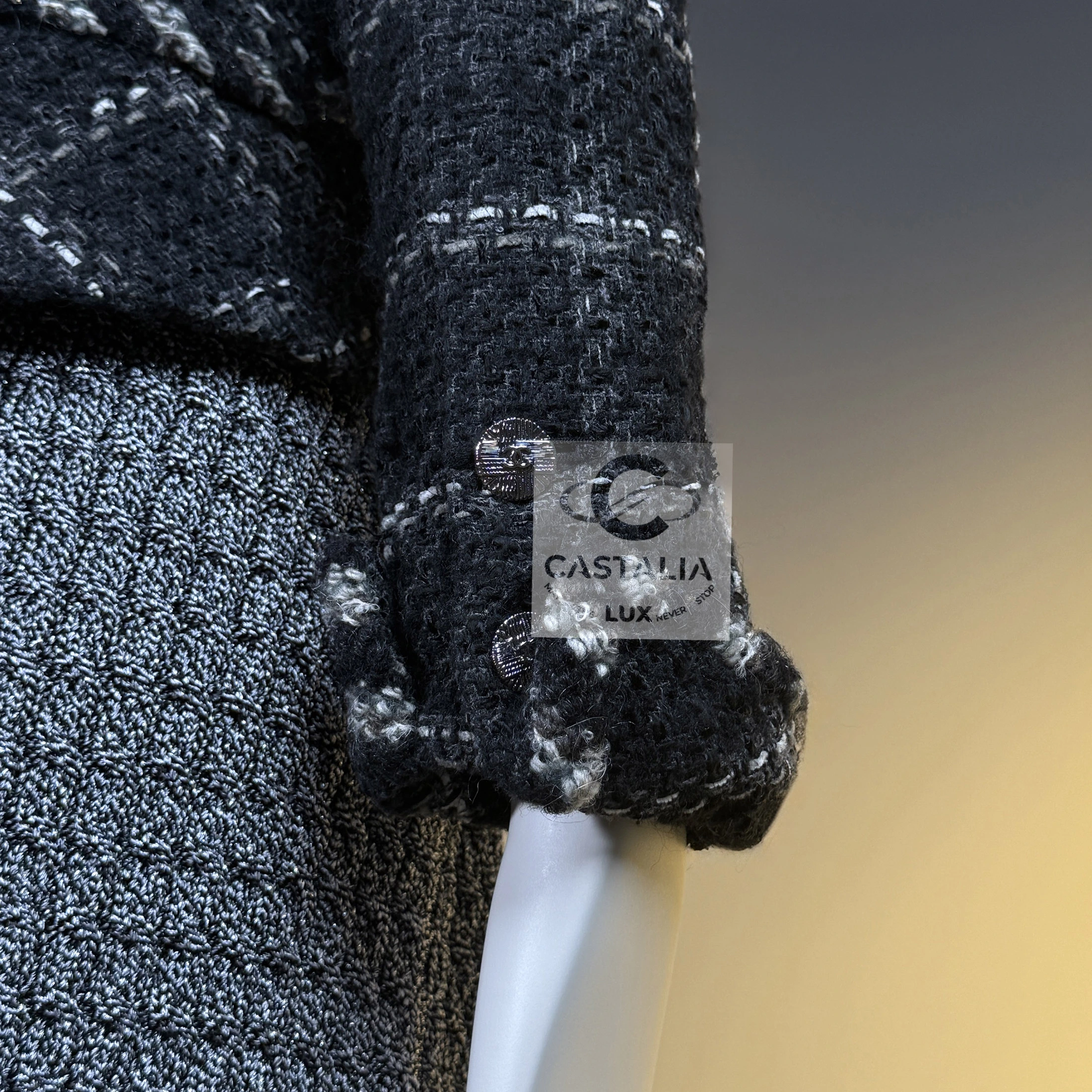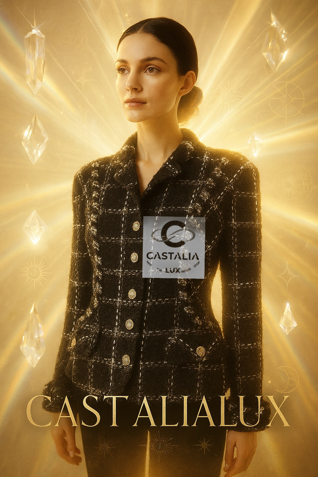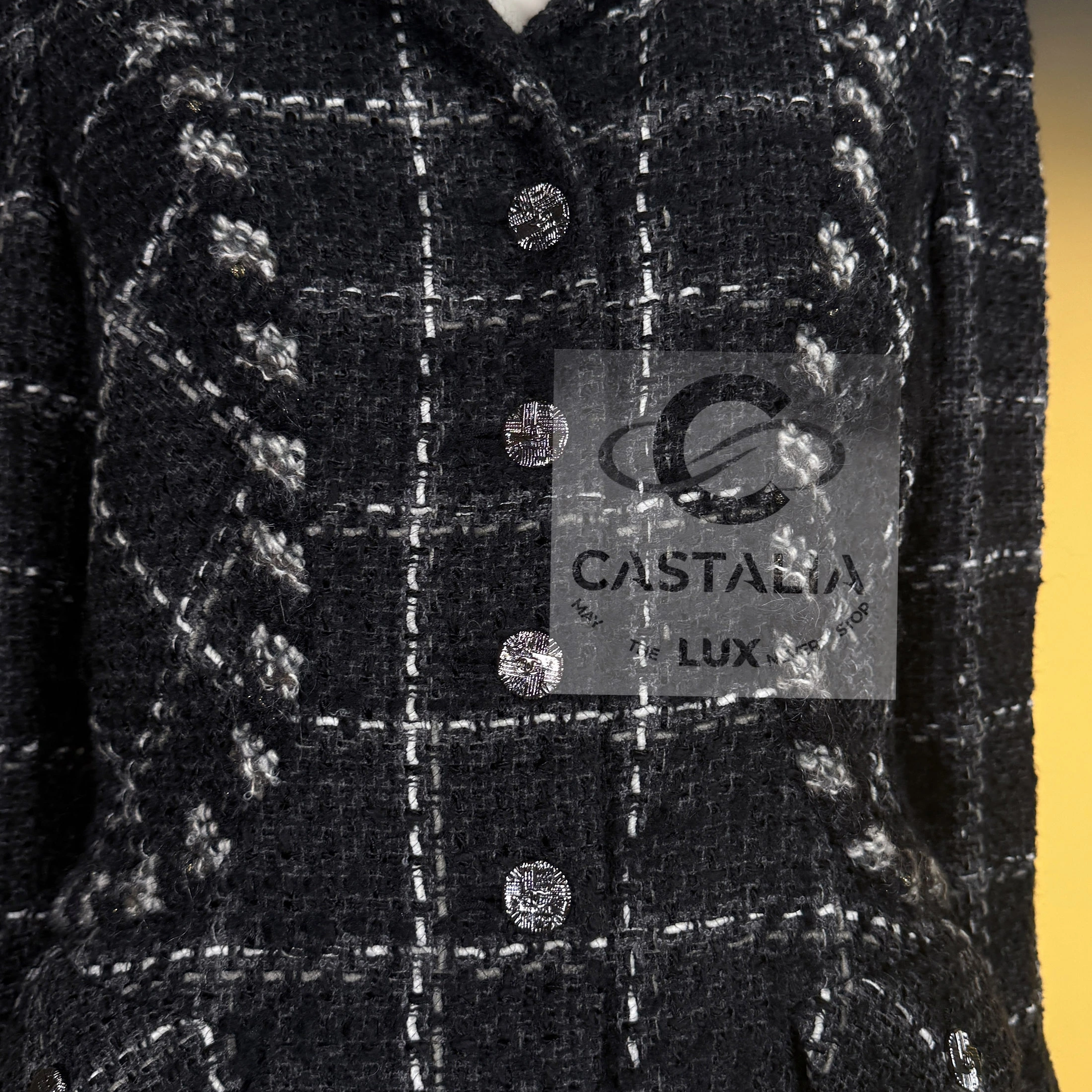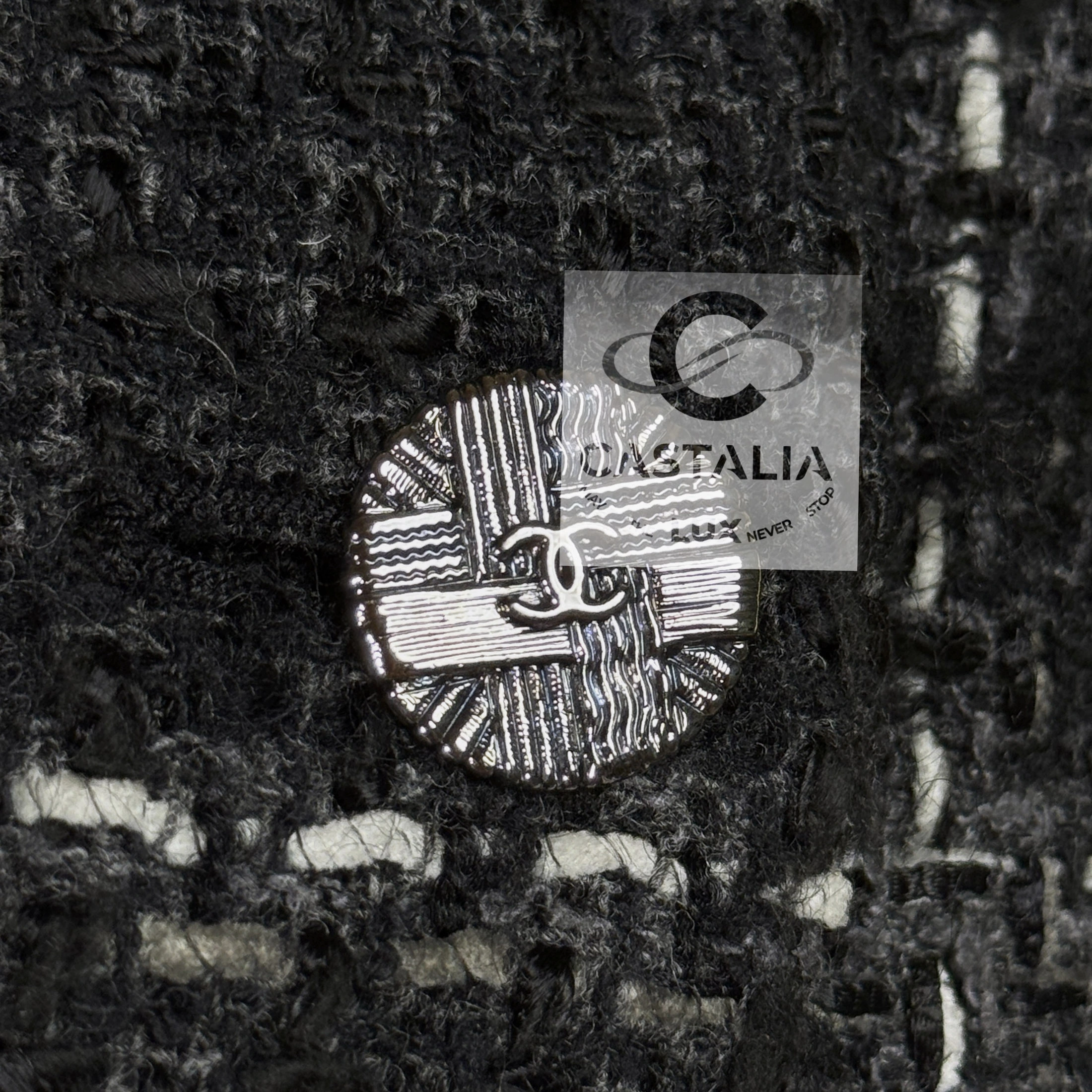 Timeless CHANEL Black Tweed Jacket — The Eternal Grid of Elegance ~ A masterpiece that transcends decades, this Chanel creation stands as both garment and relic — a testament to the Maison’s eternal grammar of elegance ~ For the collector, it is a garment that does not age but exists in the metaphysical spring of Chanel’s continuum, a perpetual blossoming of elegance // Size mark 40 FR / Condition: pristine // — Crafted from midnight-black tweed woven with a checkered lattice, it embodies balance between structure and fluidity, a grid that captures time and suspends it — Silver-tone CC logo buttons, like lunar coins, fasten the silhouette with quiet authority, while the tonal silk lining whispers of luxury known only to its wearer — crowned with braided signature trim, a subtle thread of continuity linking Chanel’s ateliers across generations — At the hem, the discreet chain link interior anchors the piece — a weight both literal and metaphysical, grounding couture in the eternal axis of form.
