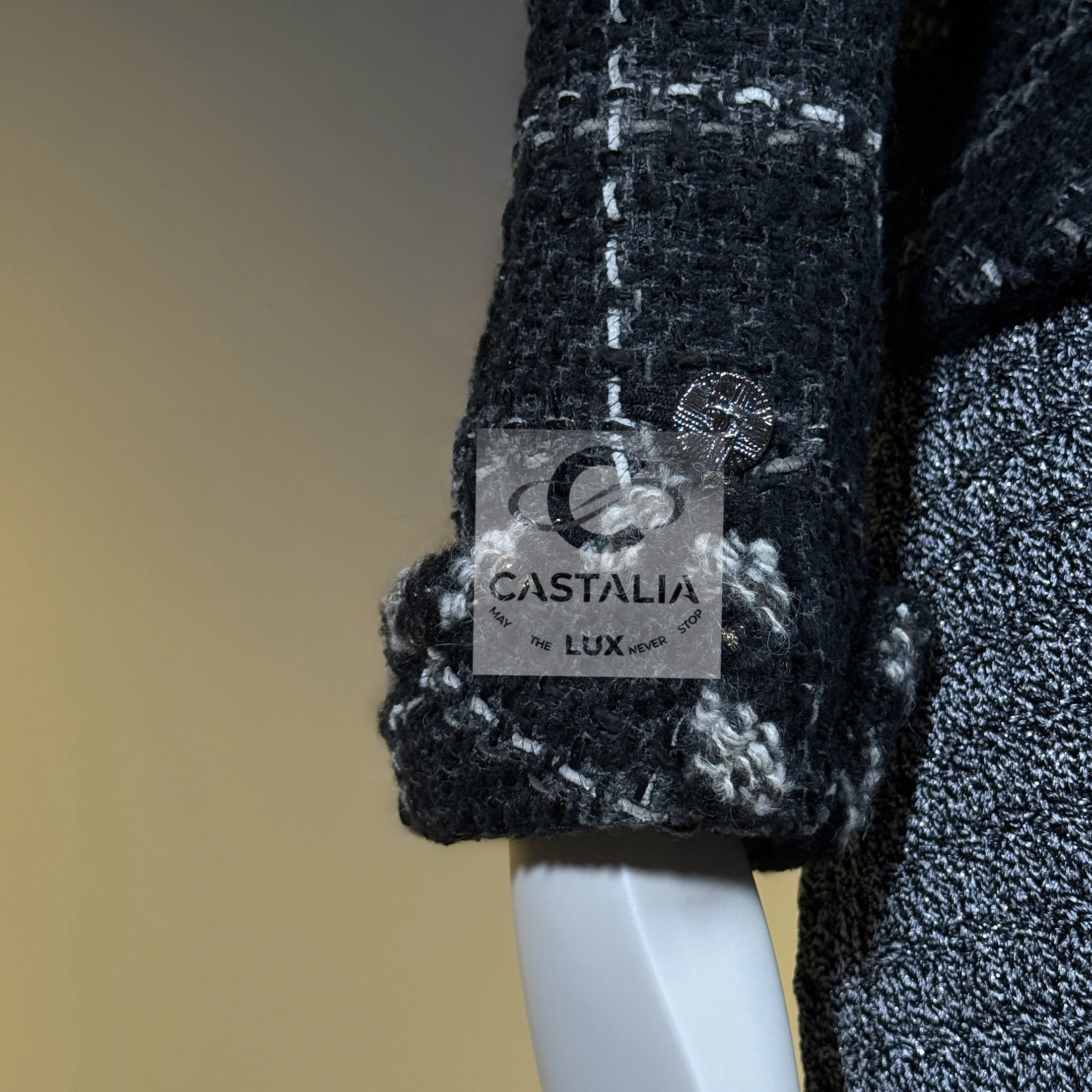 — Crafted from midnight-black tweed woven with a checkered lattice, it embodies balance between structure and fluidity, a grid that captures time and suspends it